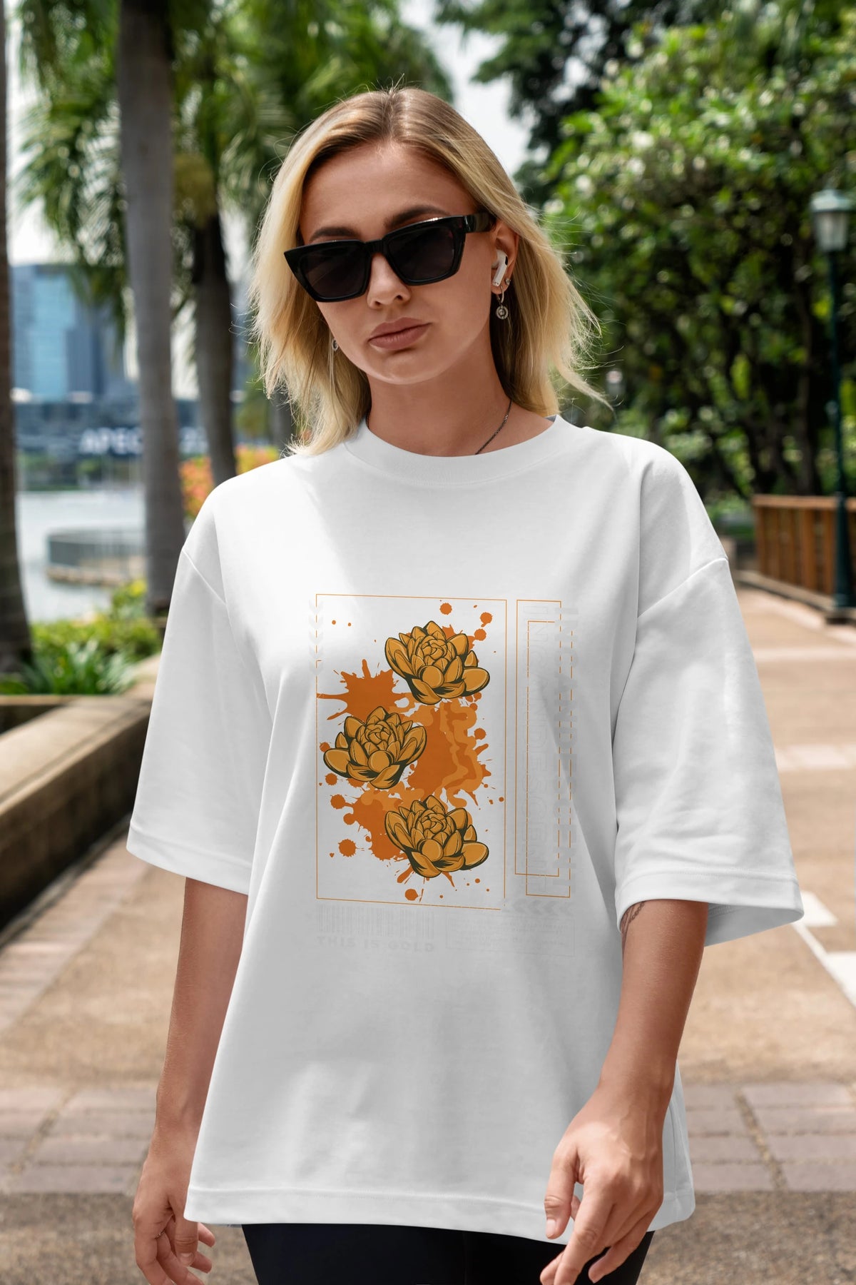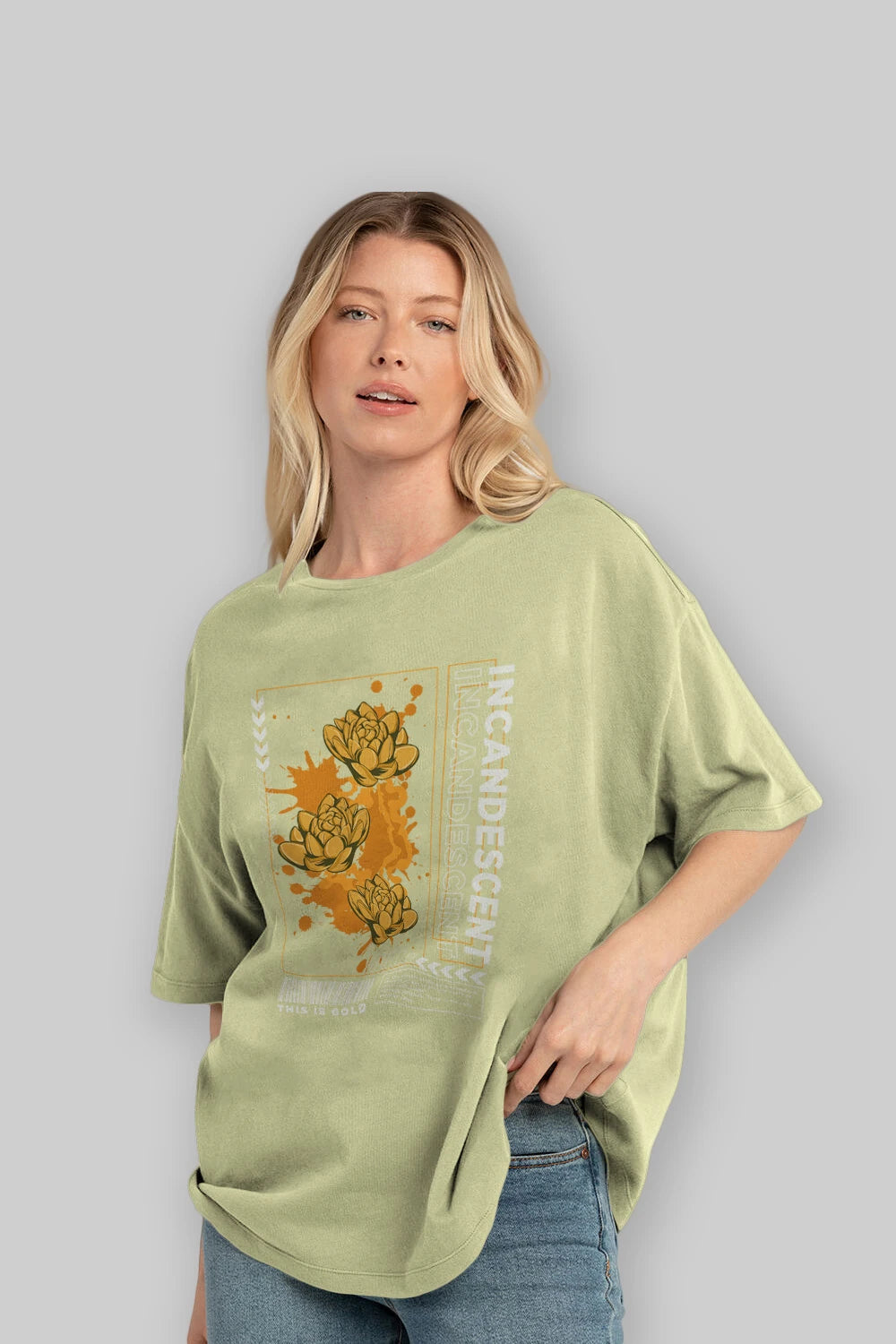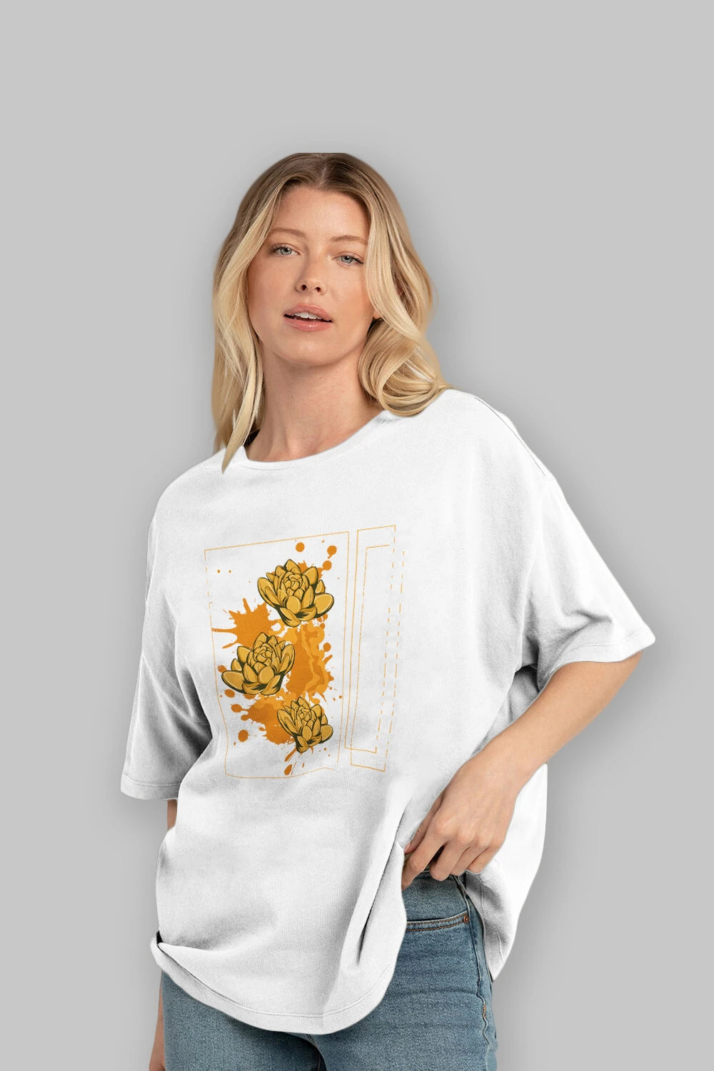 Hem erkekler hem de kadınlar için uygun, taze, modern bir baskıya sahip baskılı oversize t-shirt.
