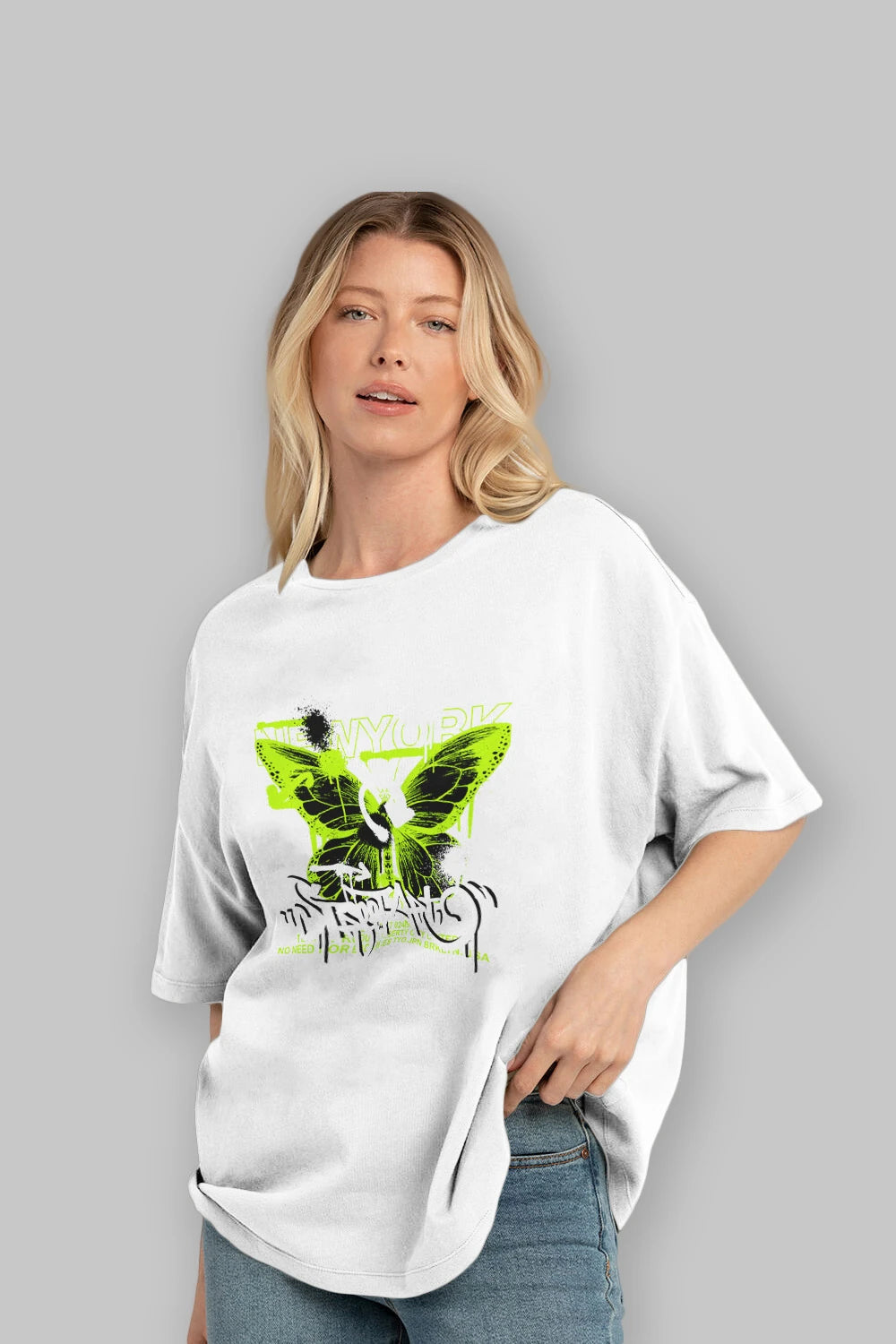 Hem erkekler hem de kadınlar için uygun, taze, modern bir baskıya sahip baskılı oversize t-shirt.