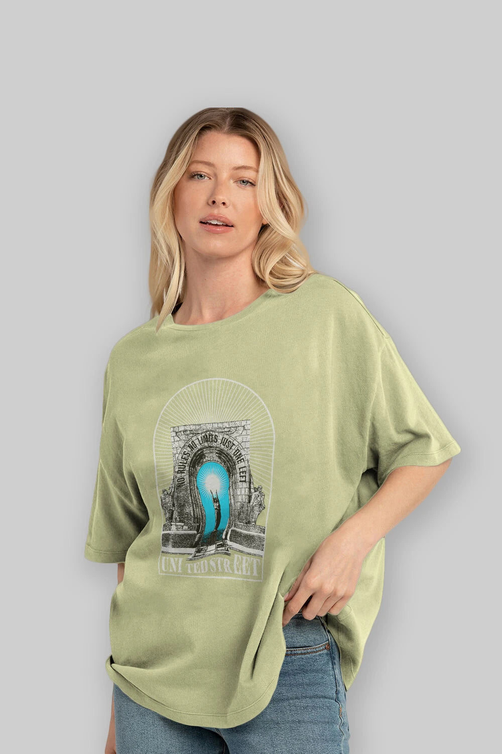 Hem erkekler hem de kadınlar için uygun, taze, modern bir baskıya sahip baskılı oversize t-shirt.