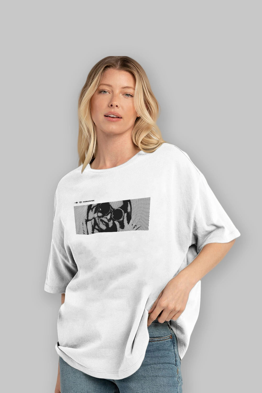 Hem erkekler hem de kadınlar için uygun, taze, modern bir baskıya sahip baskılı oversize t-shirt.