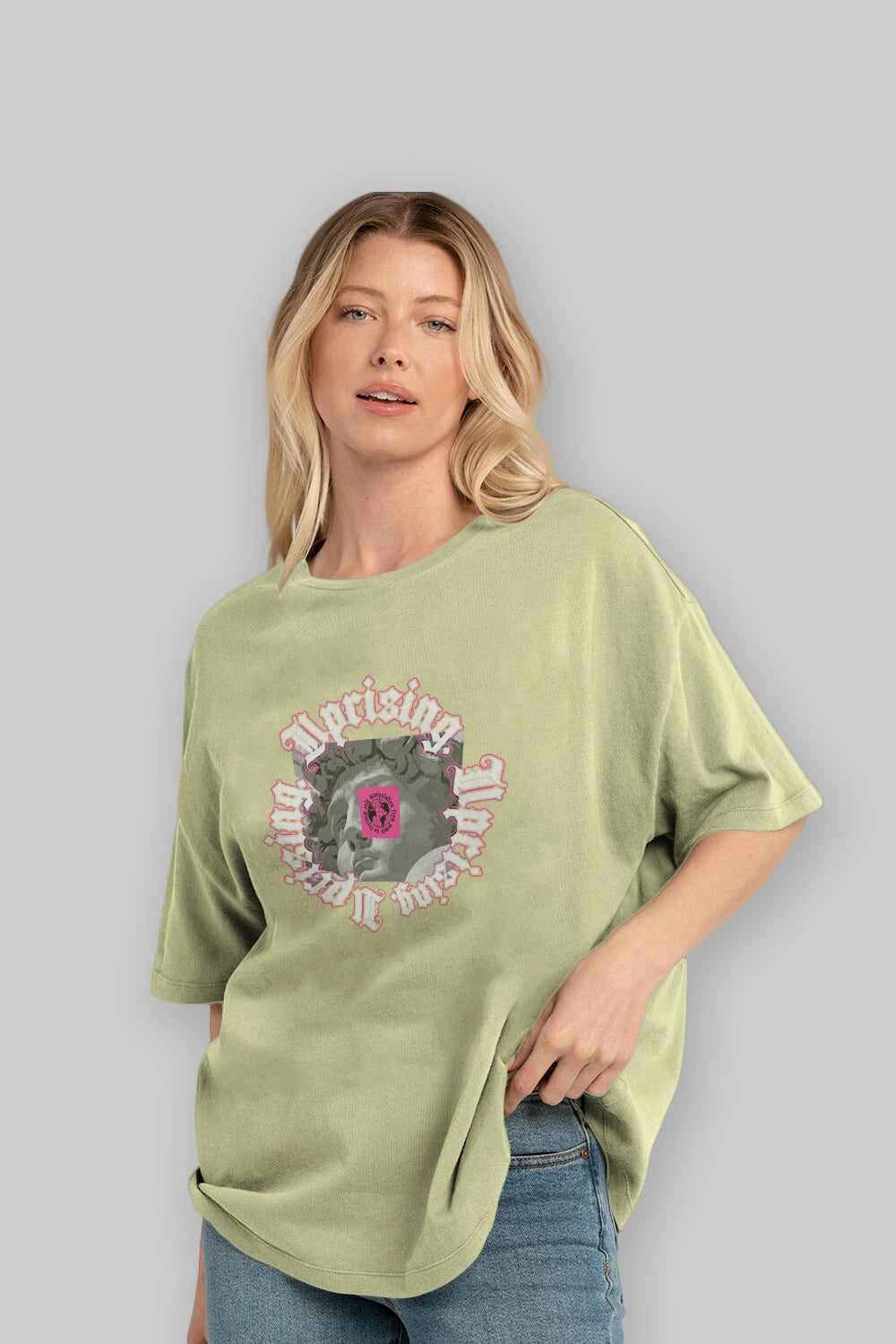 Hem erkekler hem de kadınlar için uygun, taze, modern bir baskıya sahip baskılı oversize t-shirt.