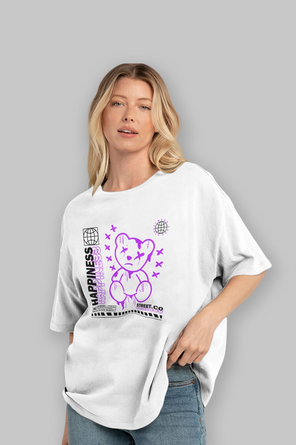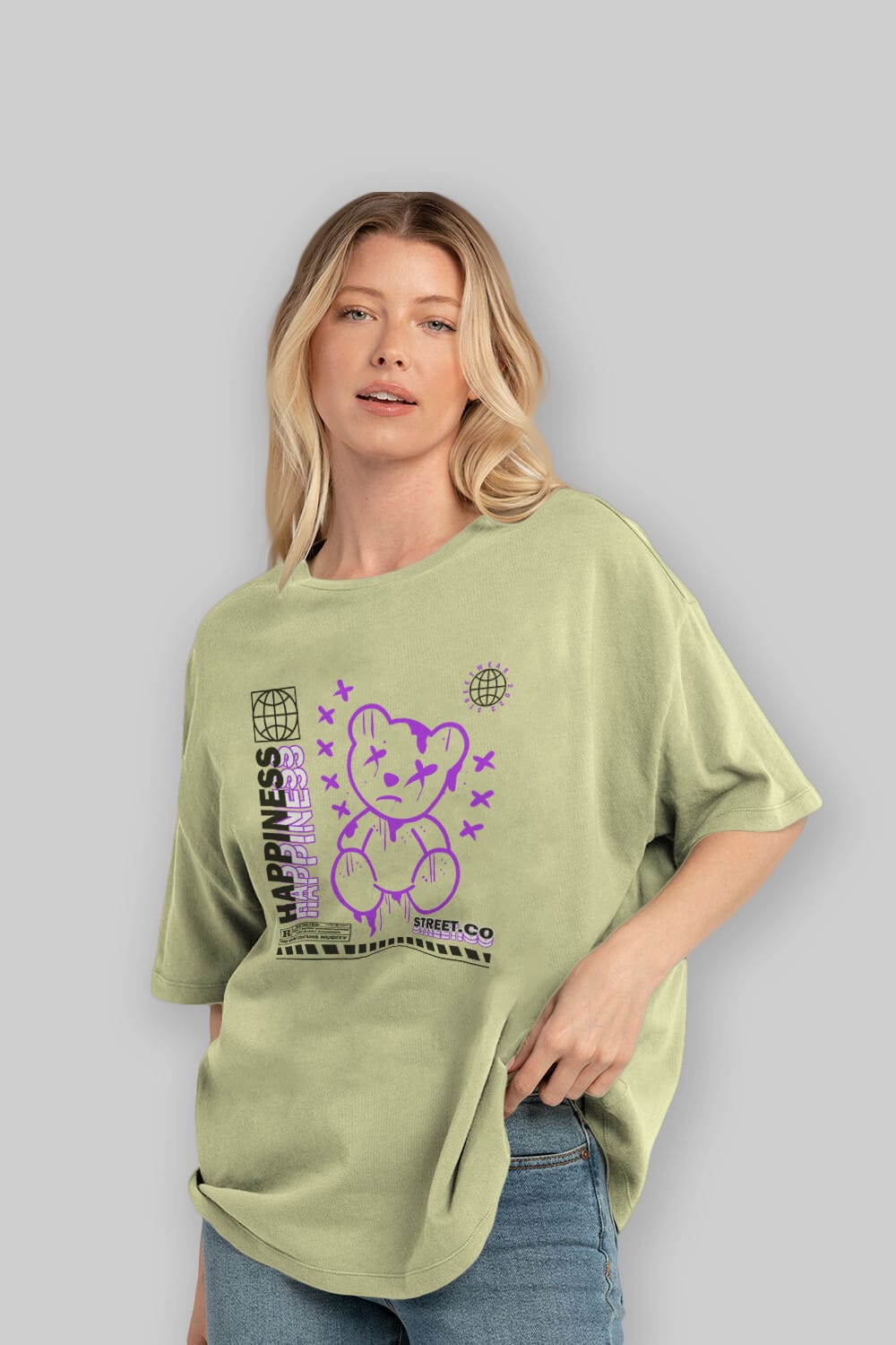 Hem erkekler hem de kadınlar için uygun, taze, modern bir baskıya sahip baskılı oversize t-shirt.