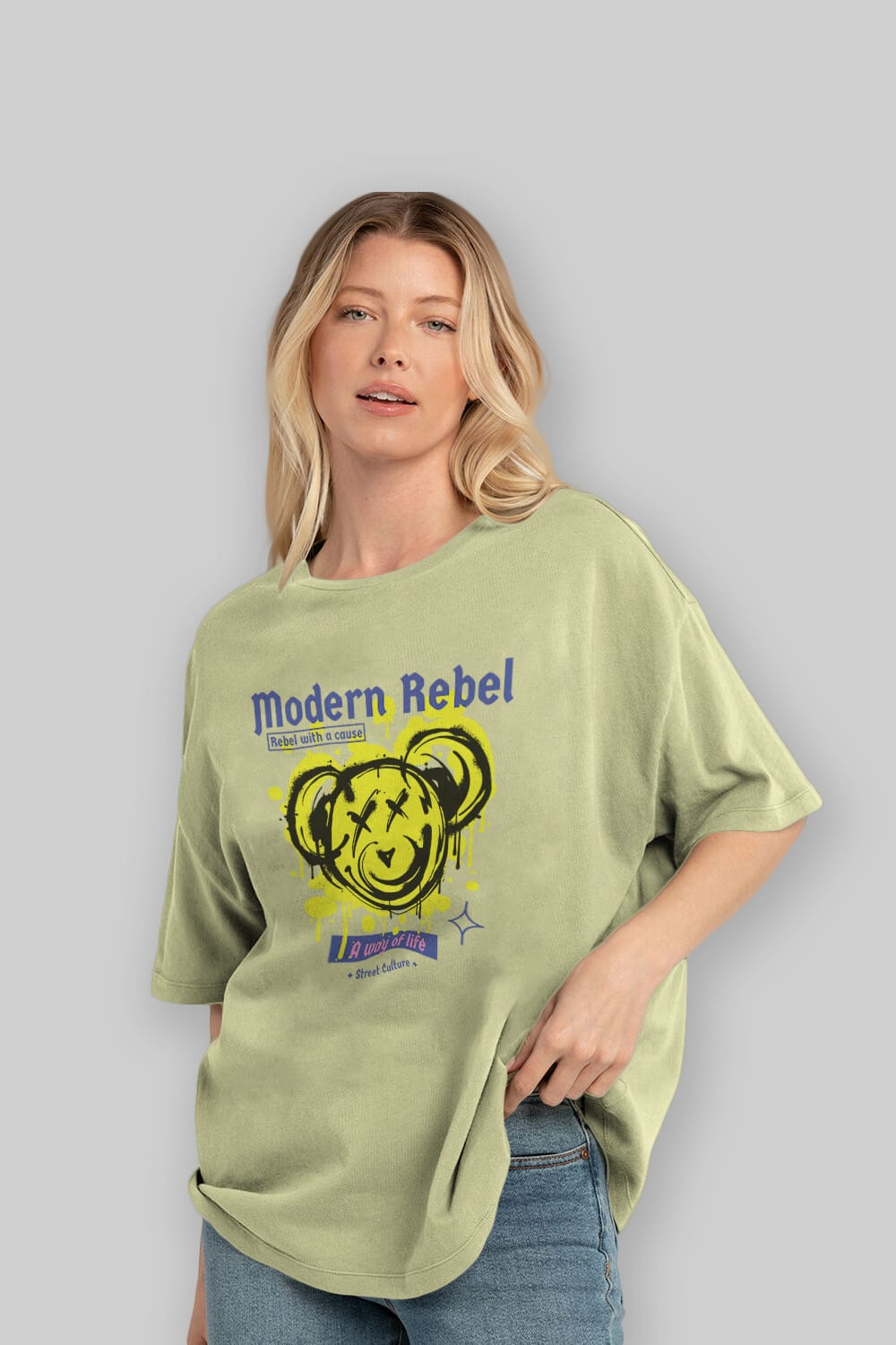 Hem erkekler hem de kadınlar için uygun, taze, modern bir baskıya sahip baskılı oversize t-shirt.