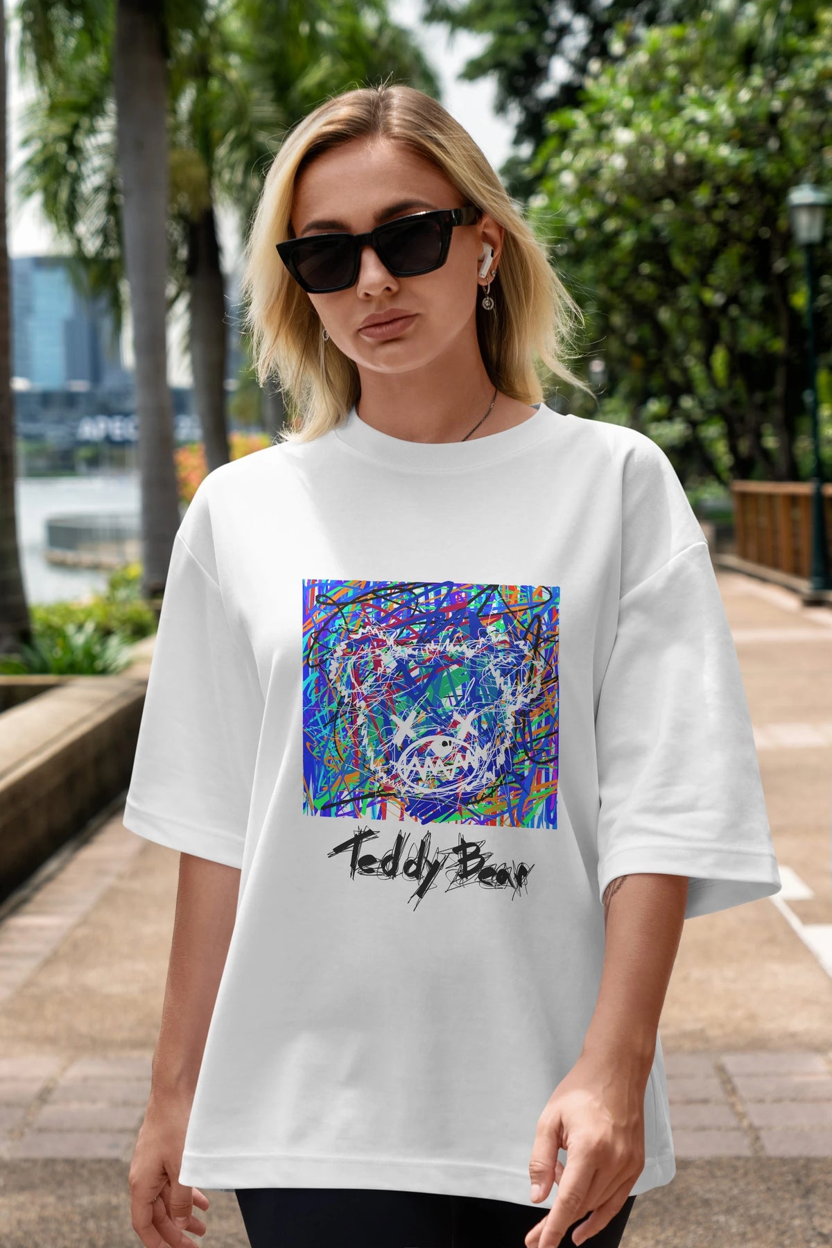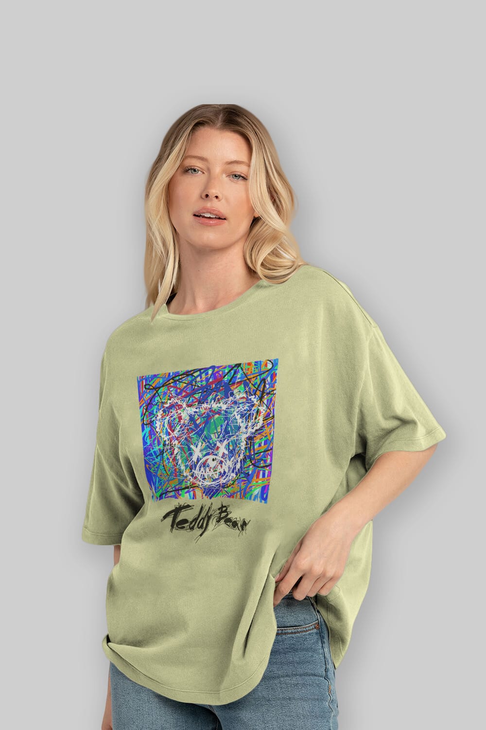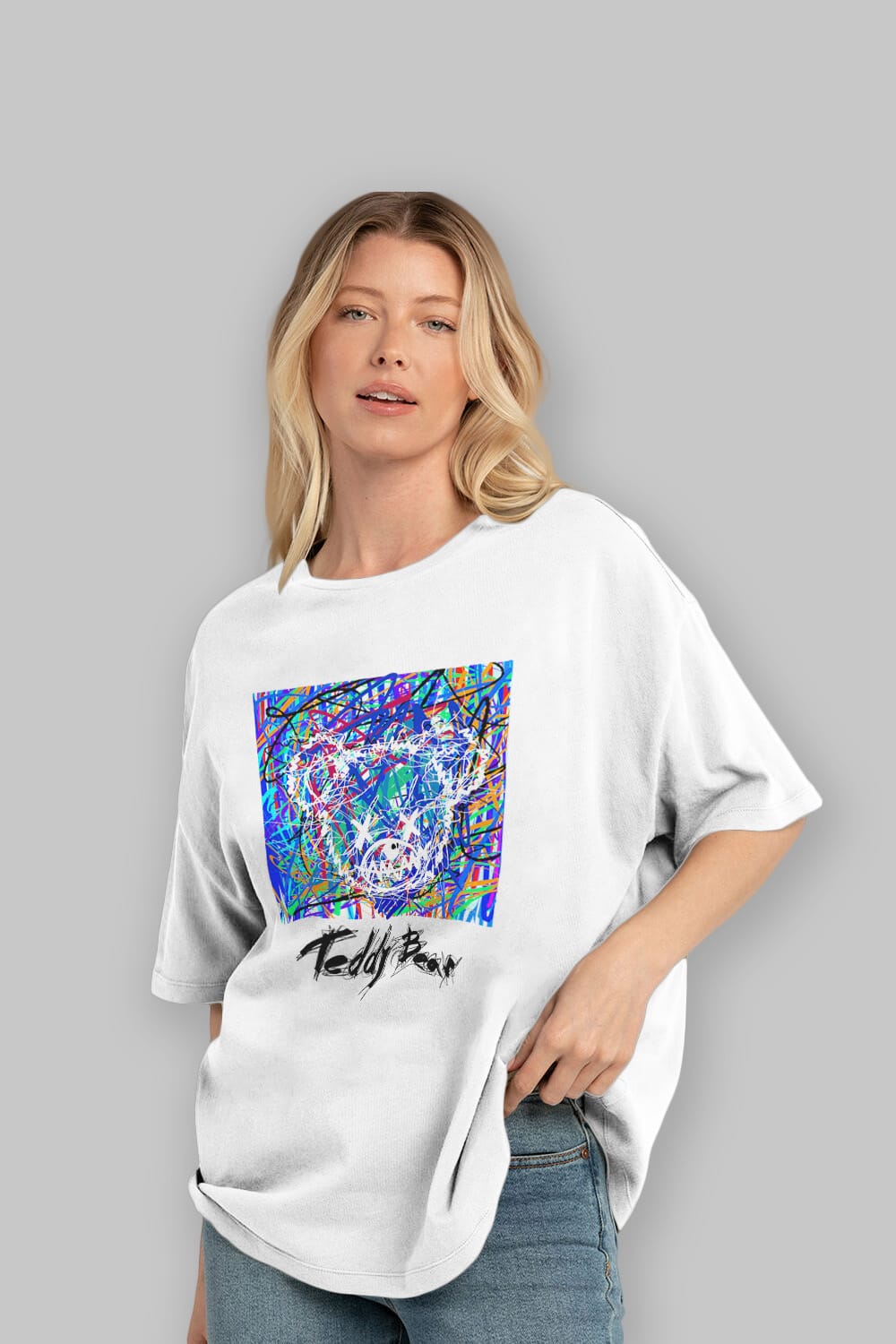 Hem erkekler hem de kadınlar için uygun, taze, modern bir baskıya sahip baskılı oversize t-shirt.