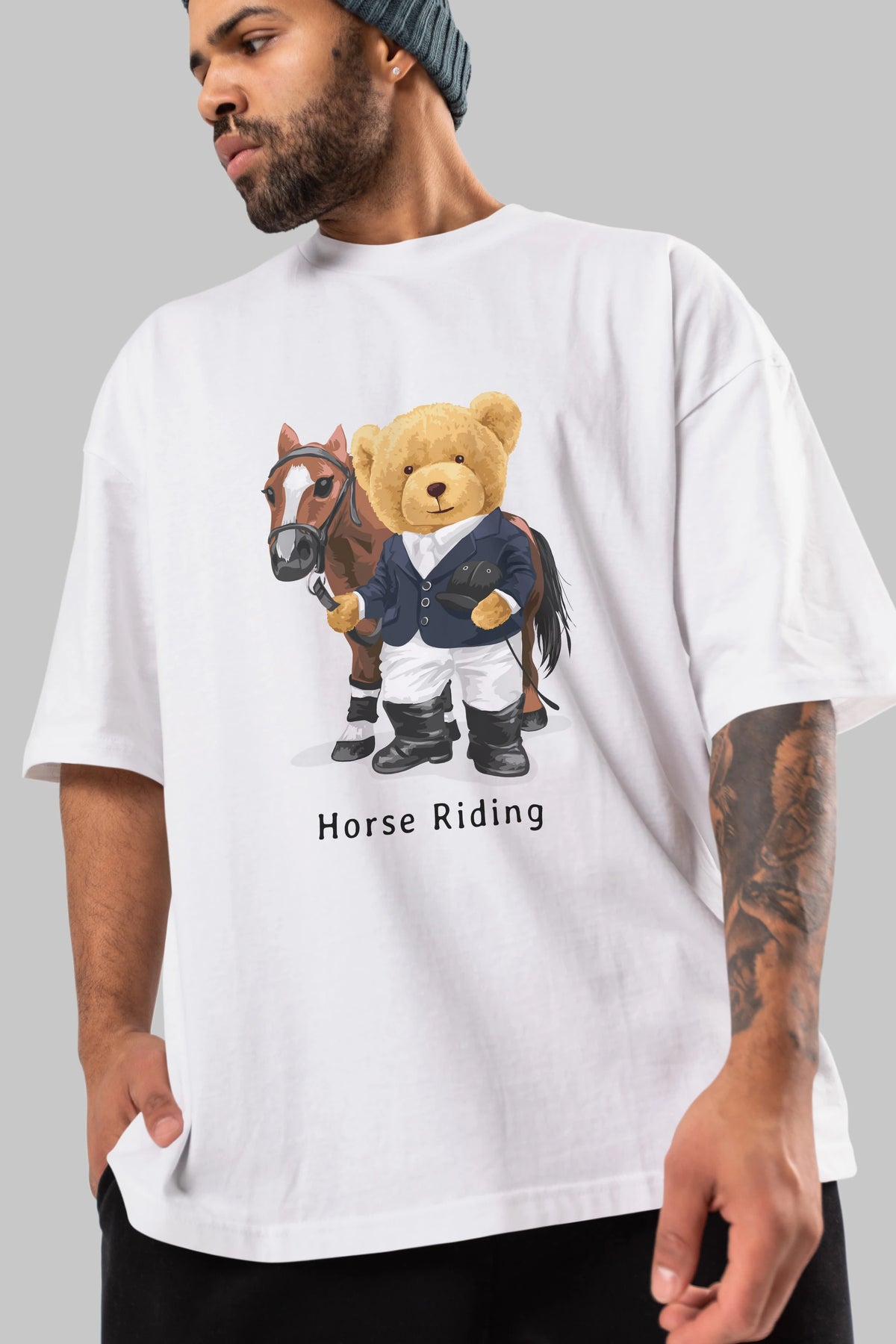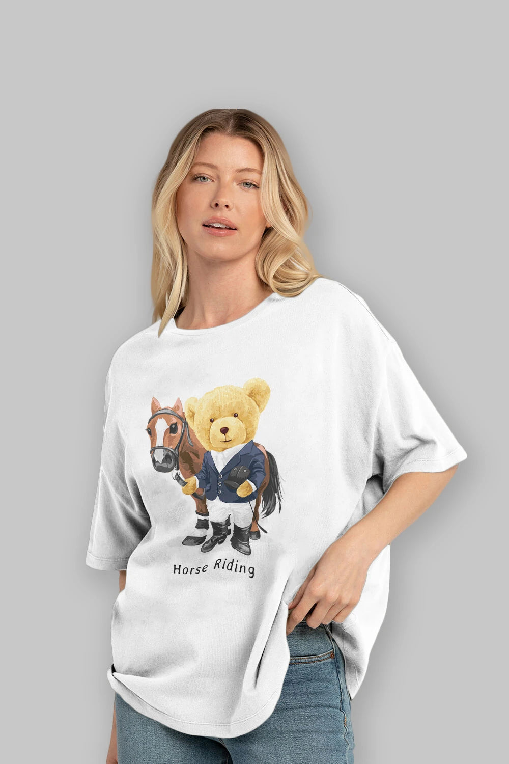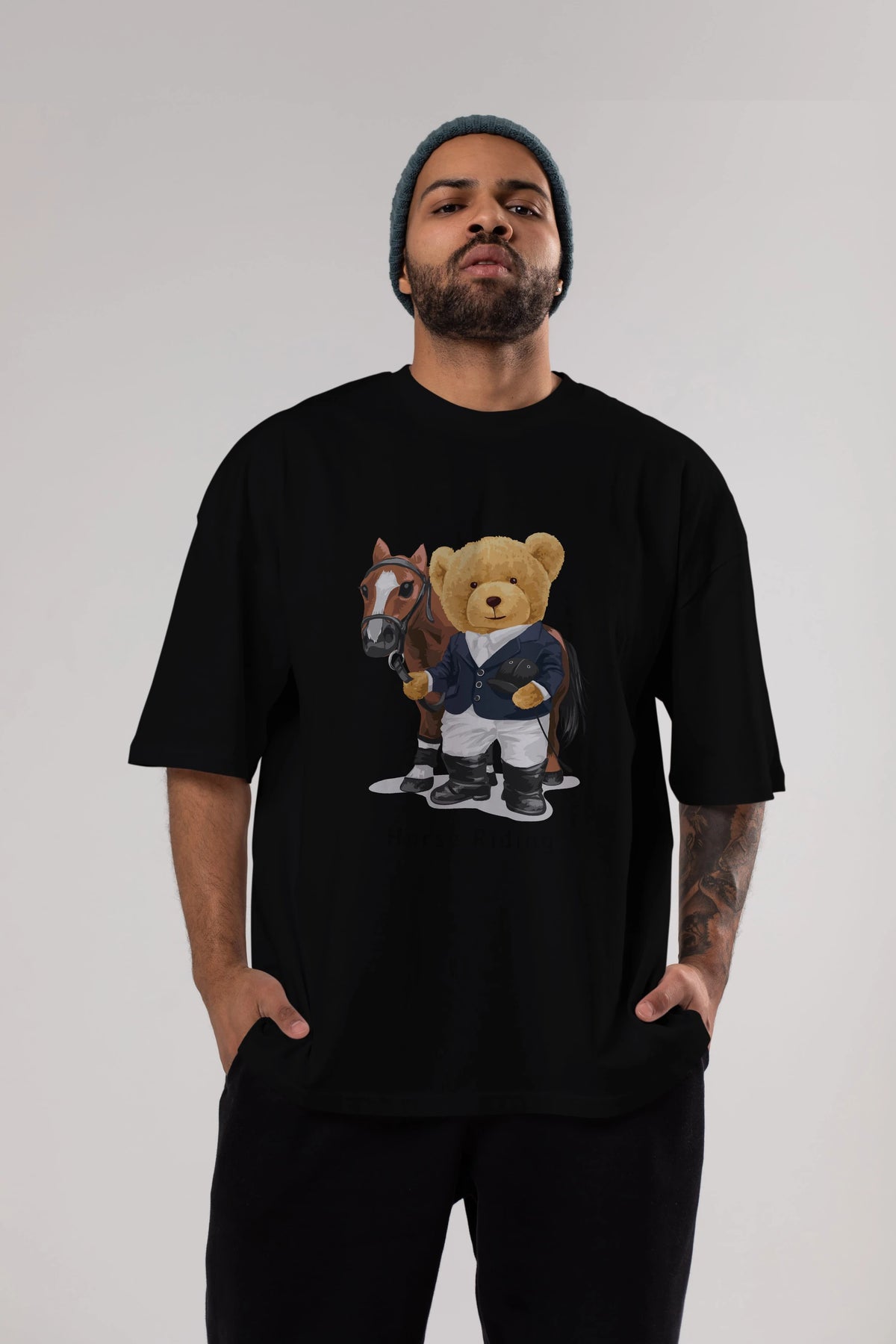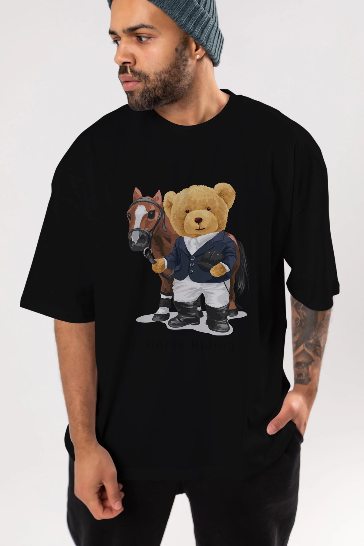 Teddy Bear Horse Riding Ön Baskılı Oversize t-shirt Erkek Kadın Unisex %100 Pamuk