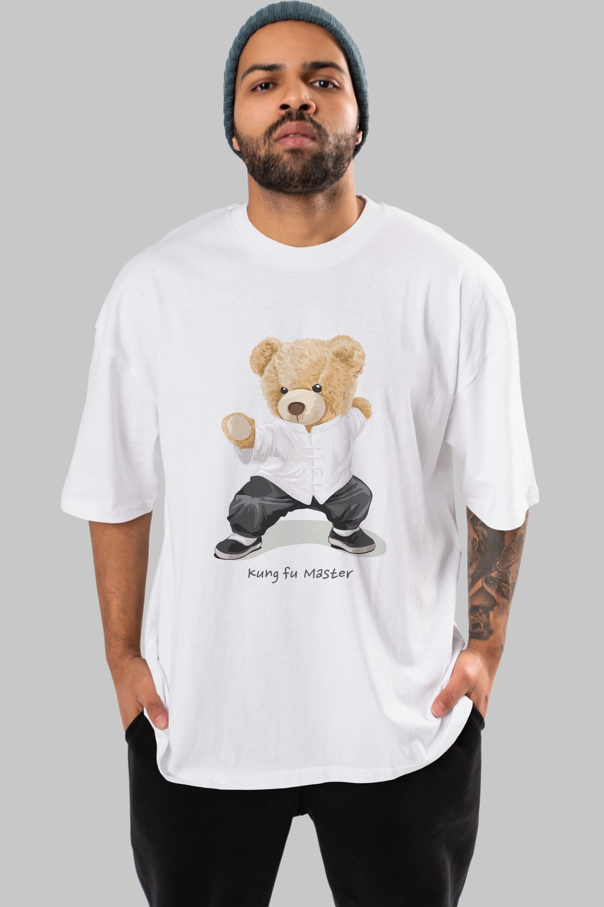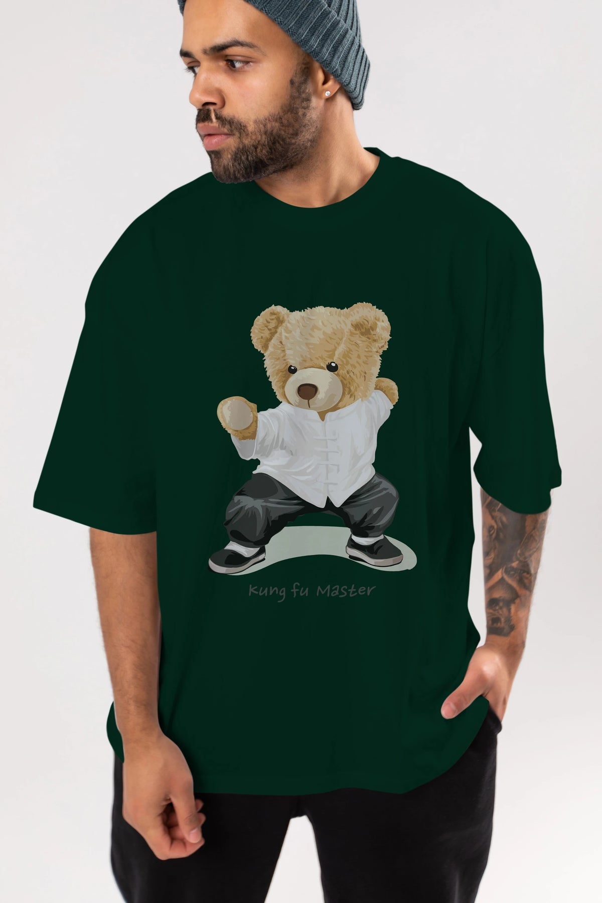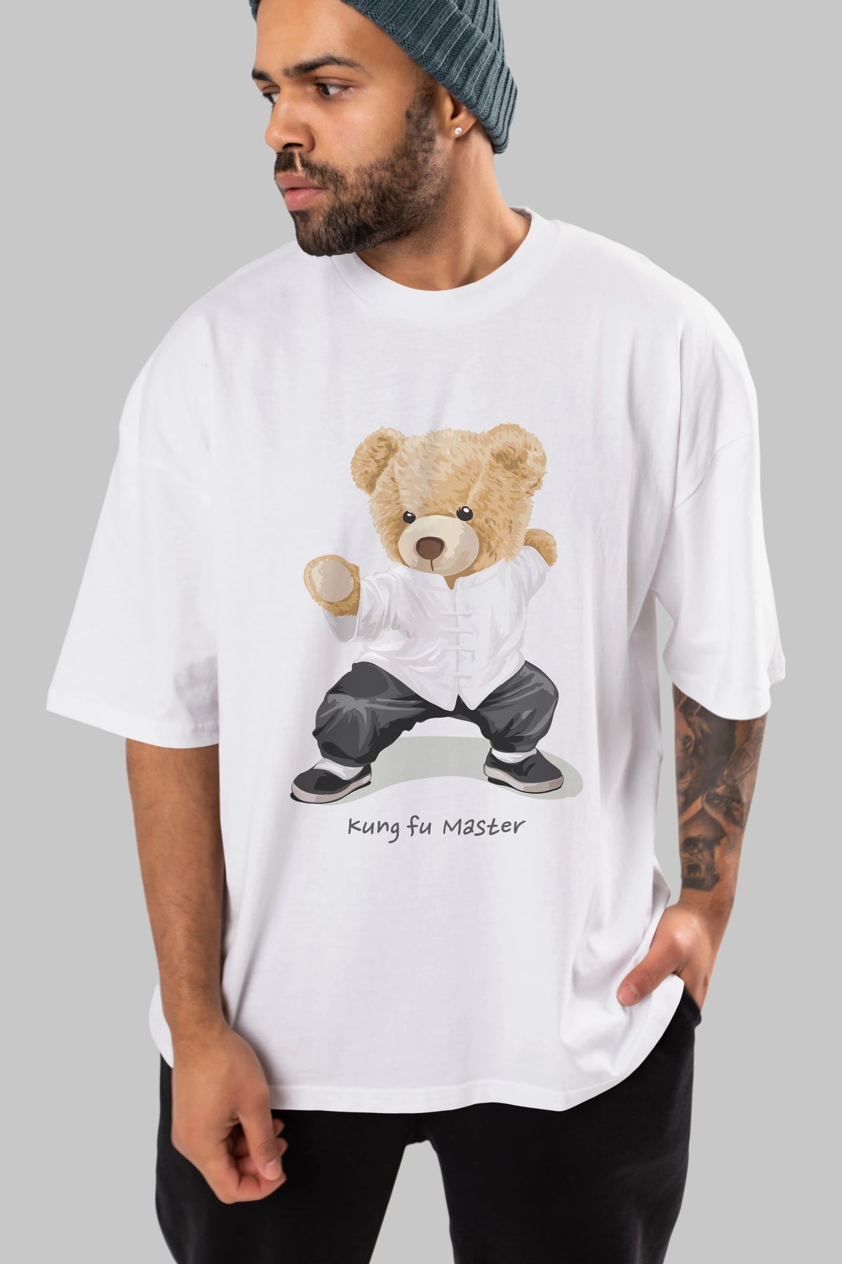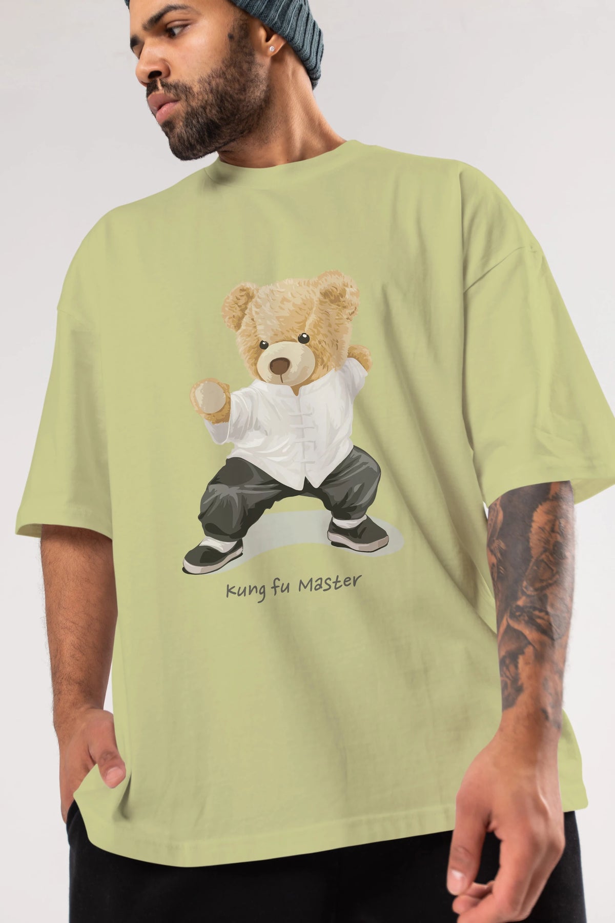 Teddy Bear Kung Fu Master Ön Baskılı Oversize t-shirt Erkek Kadın Unisex %100 Pamuk