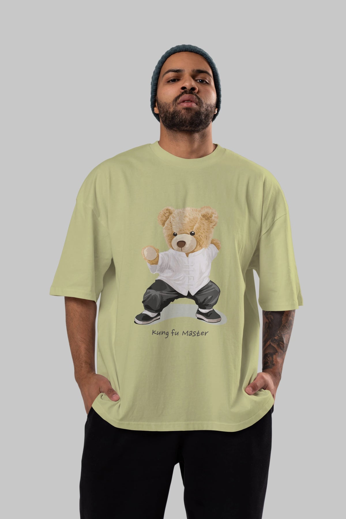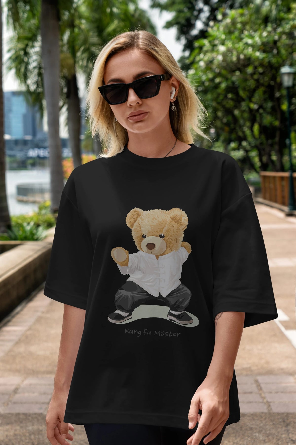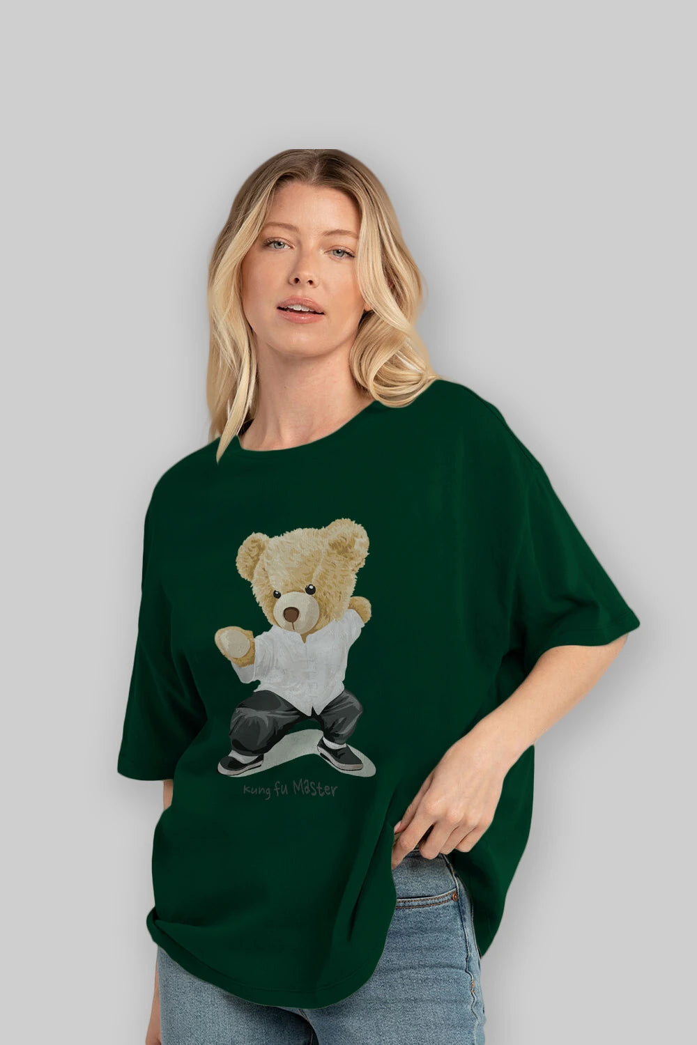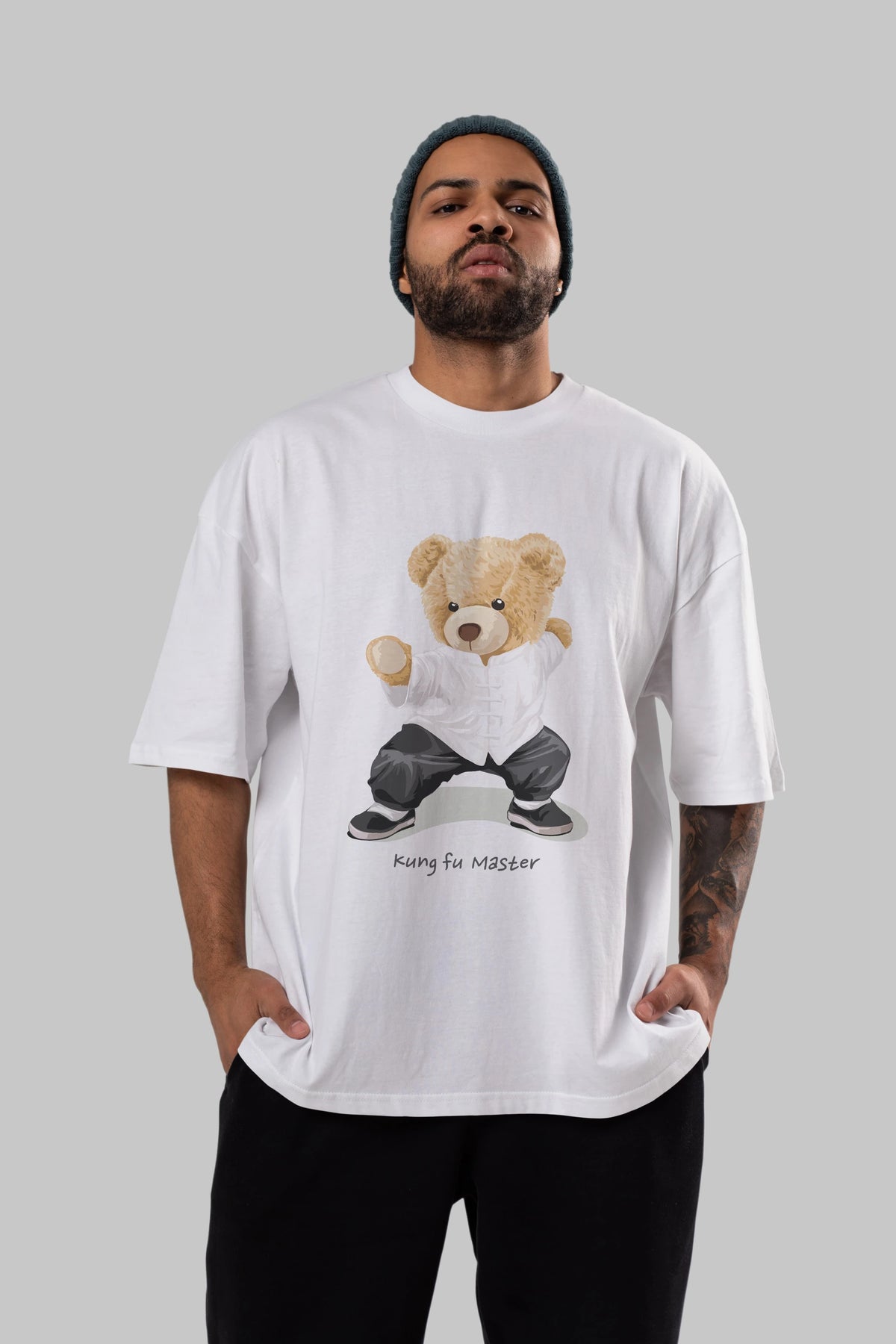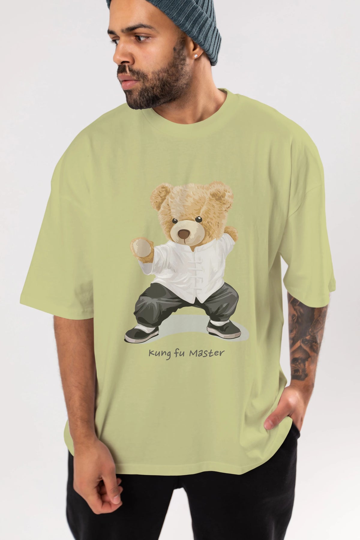 Teddy Bear Kung Fu Master Ön Baskılı Oversize t-shirt Erkek Kadın Unisex %100 Pamuk
