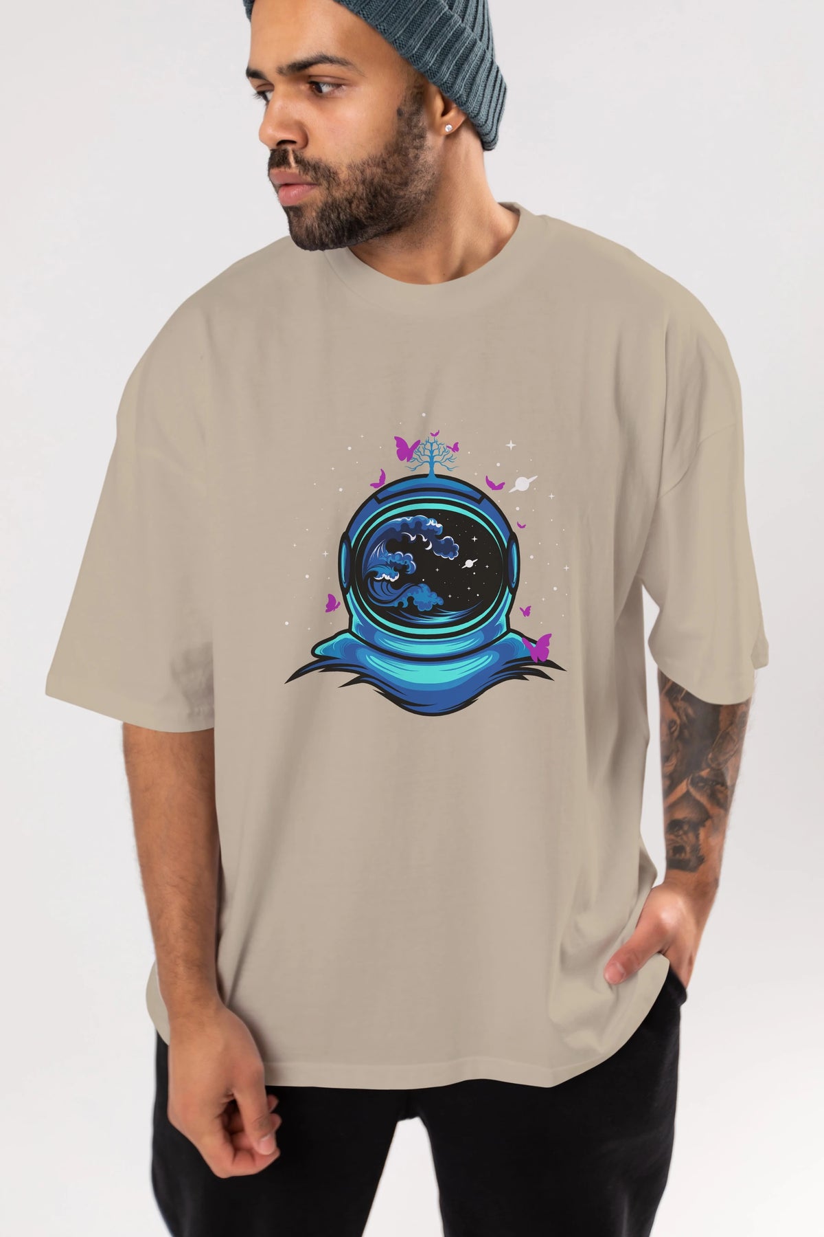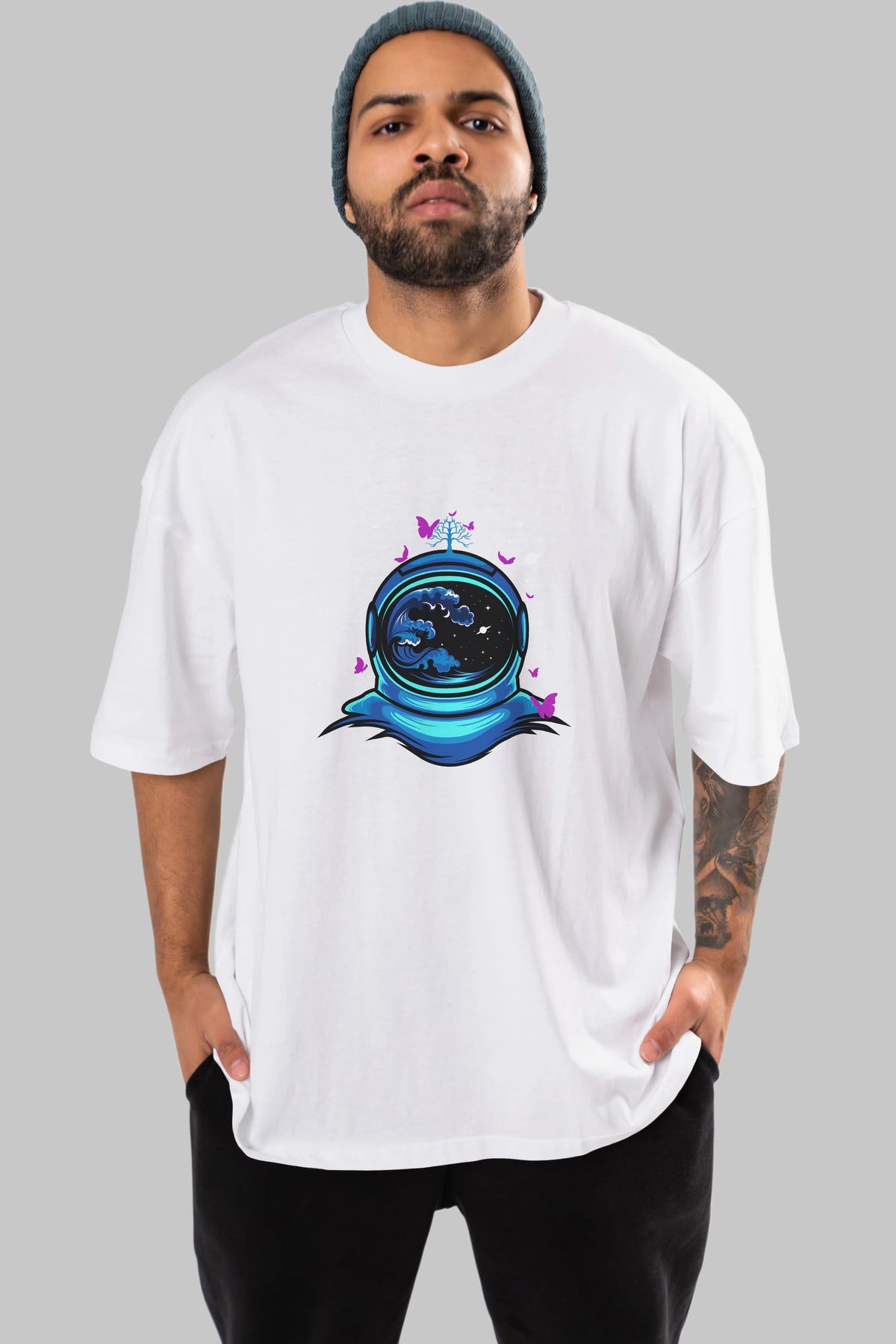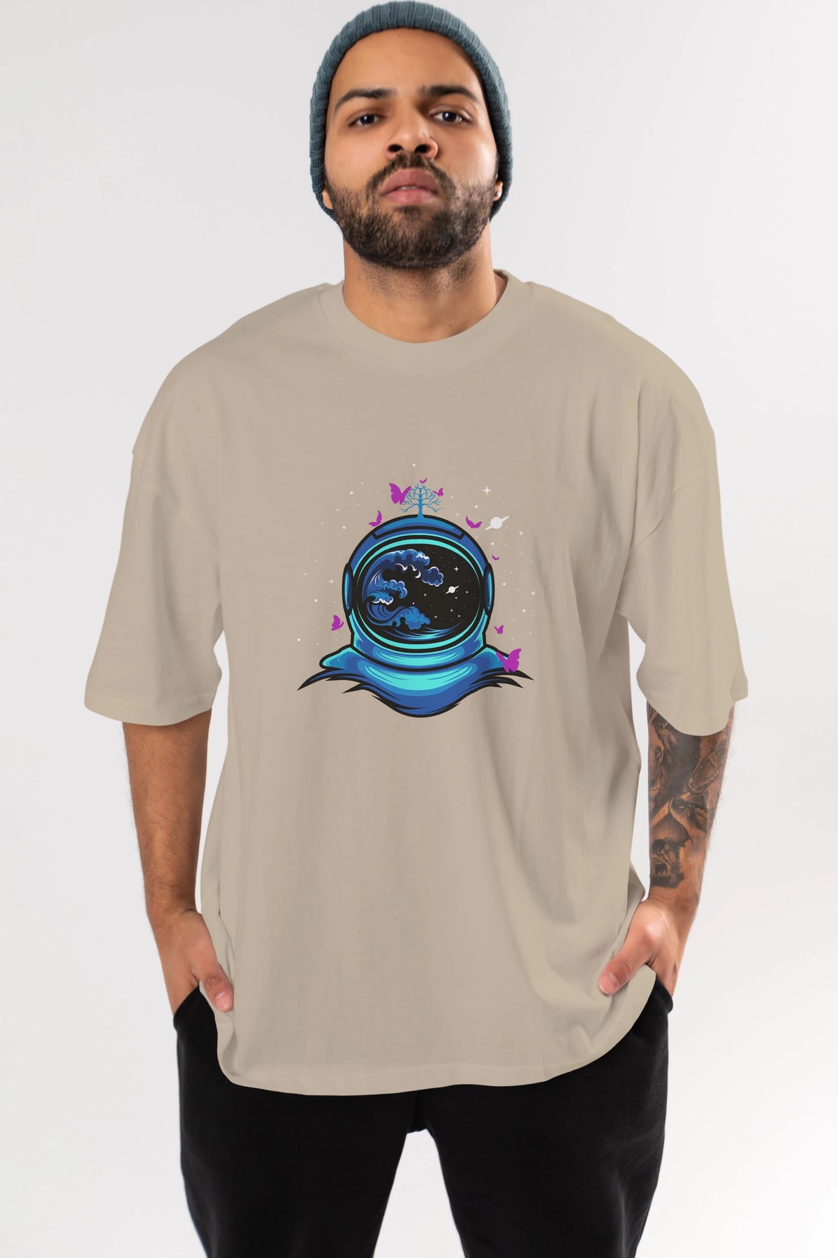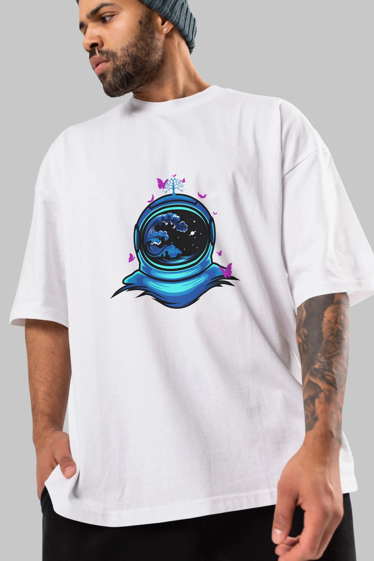 Astronaut and Butterfly Ön Baskılı Oversize t-shirt Erkek Kadın Unisex