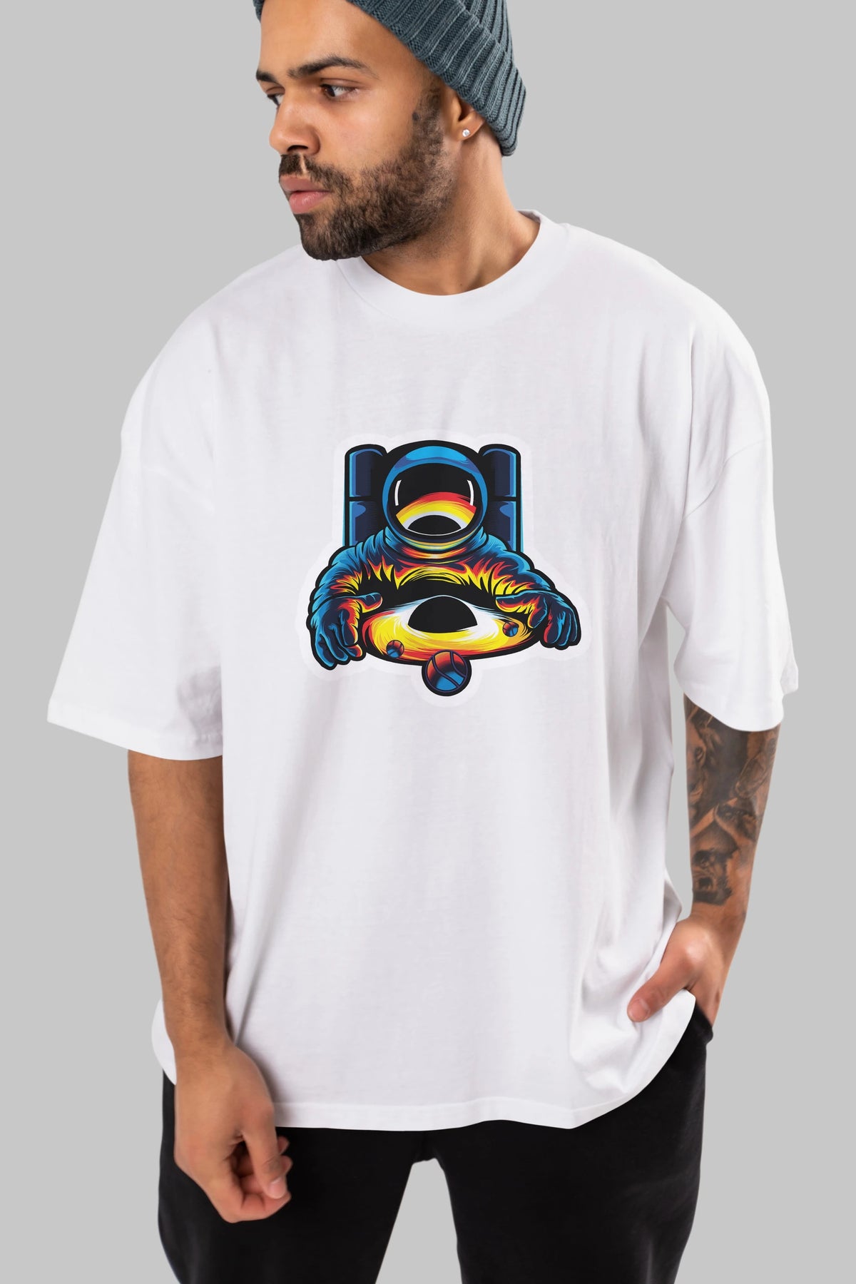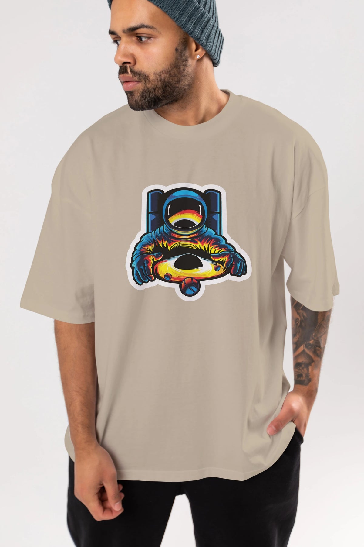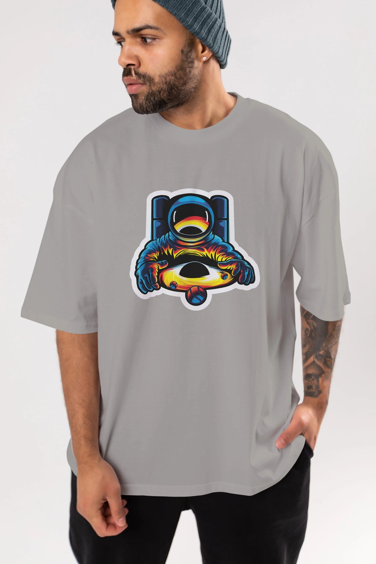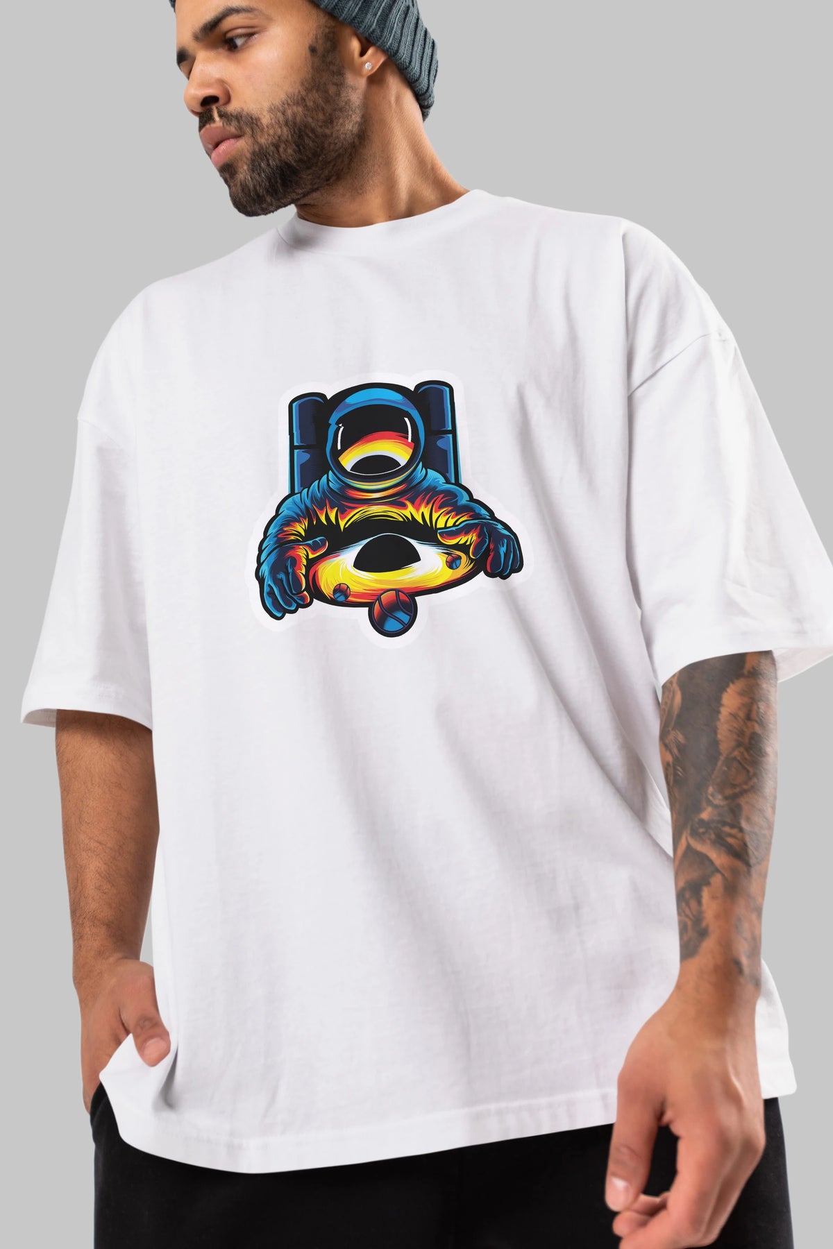 Astronaut & Black Hole Sticker Ön Baskılı Oversize t-shirt Erkek Kadın Unisex