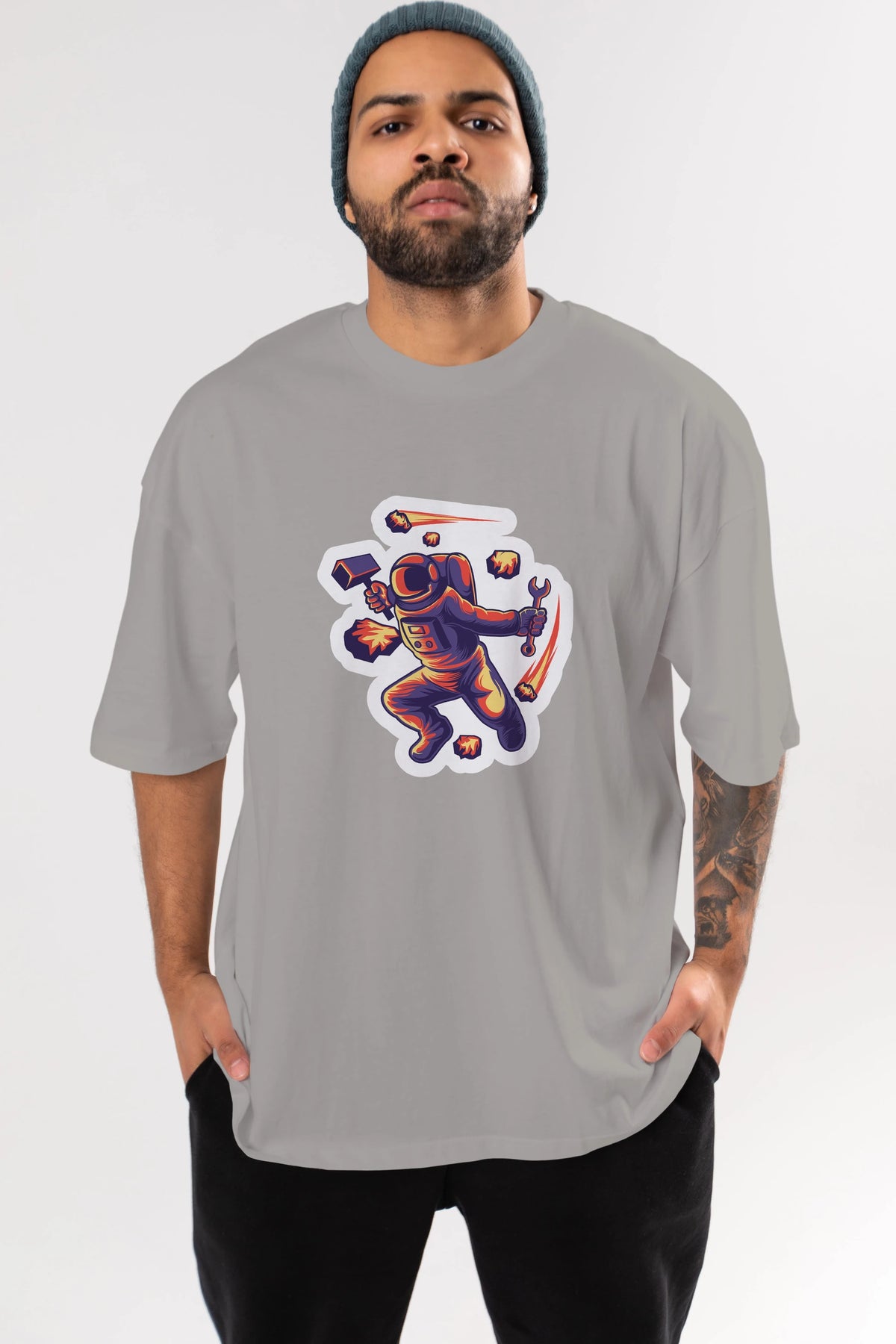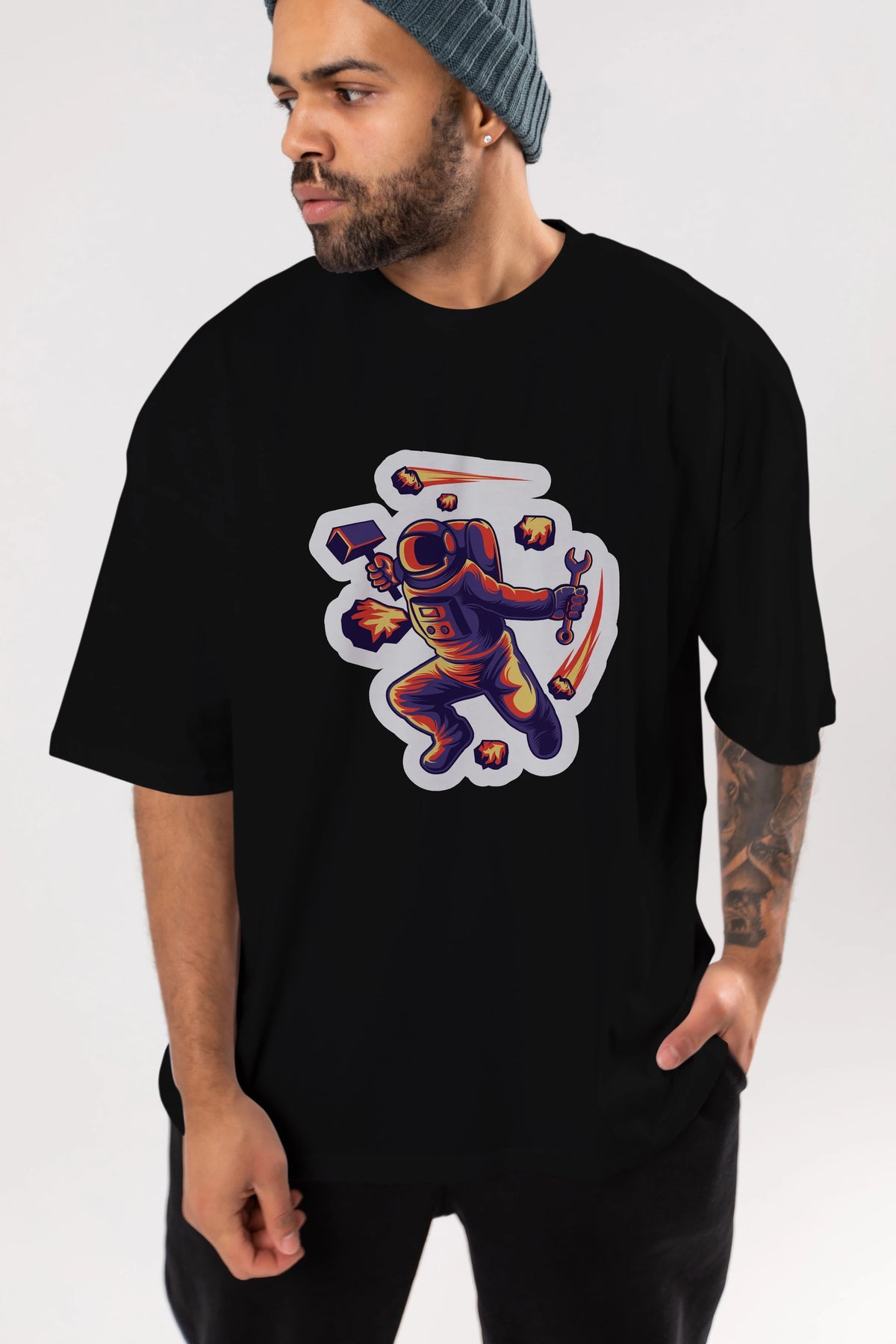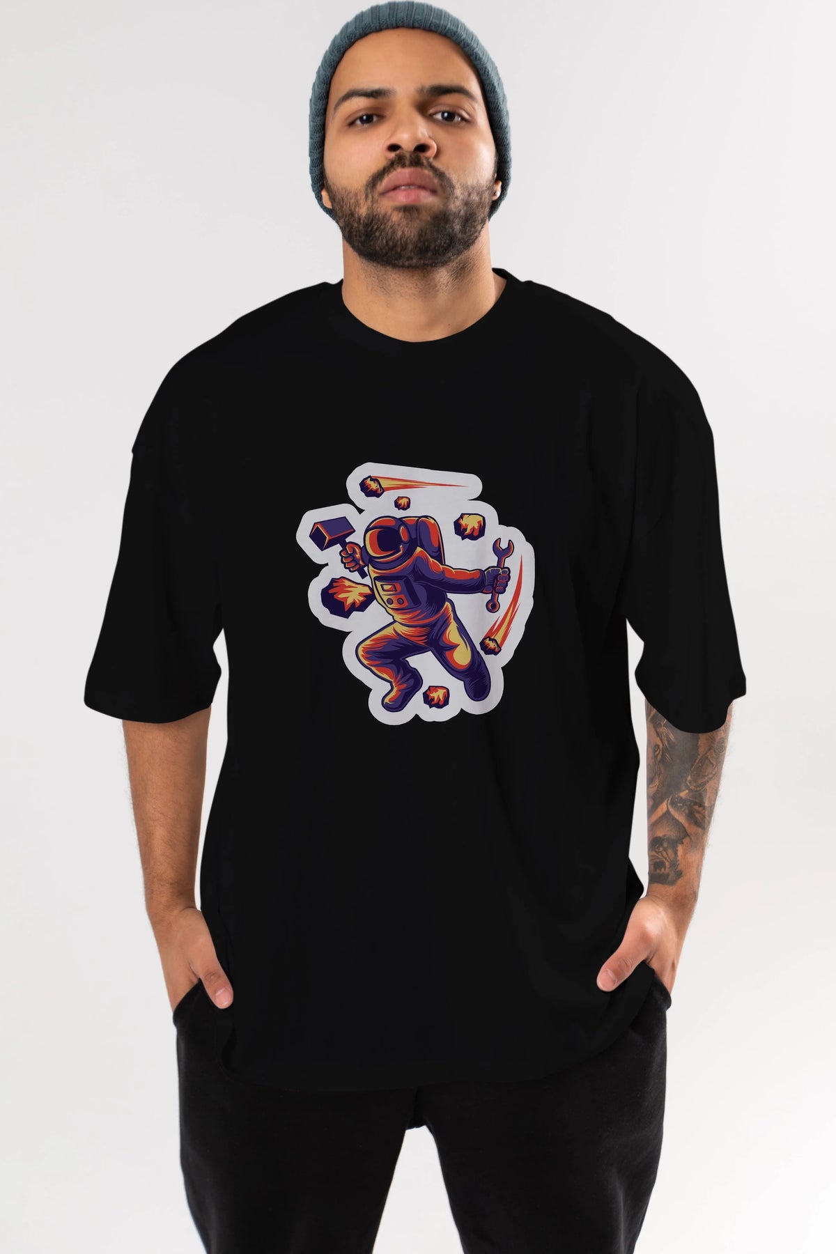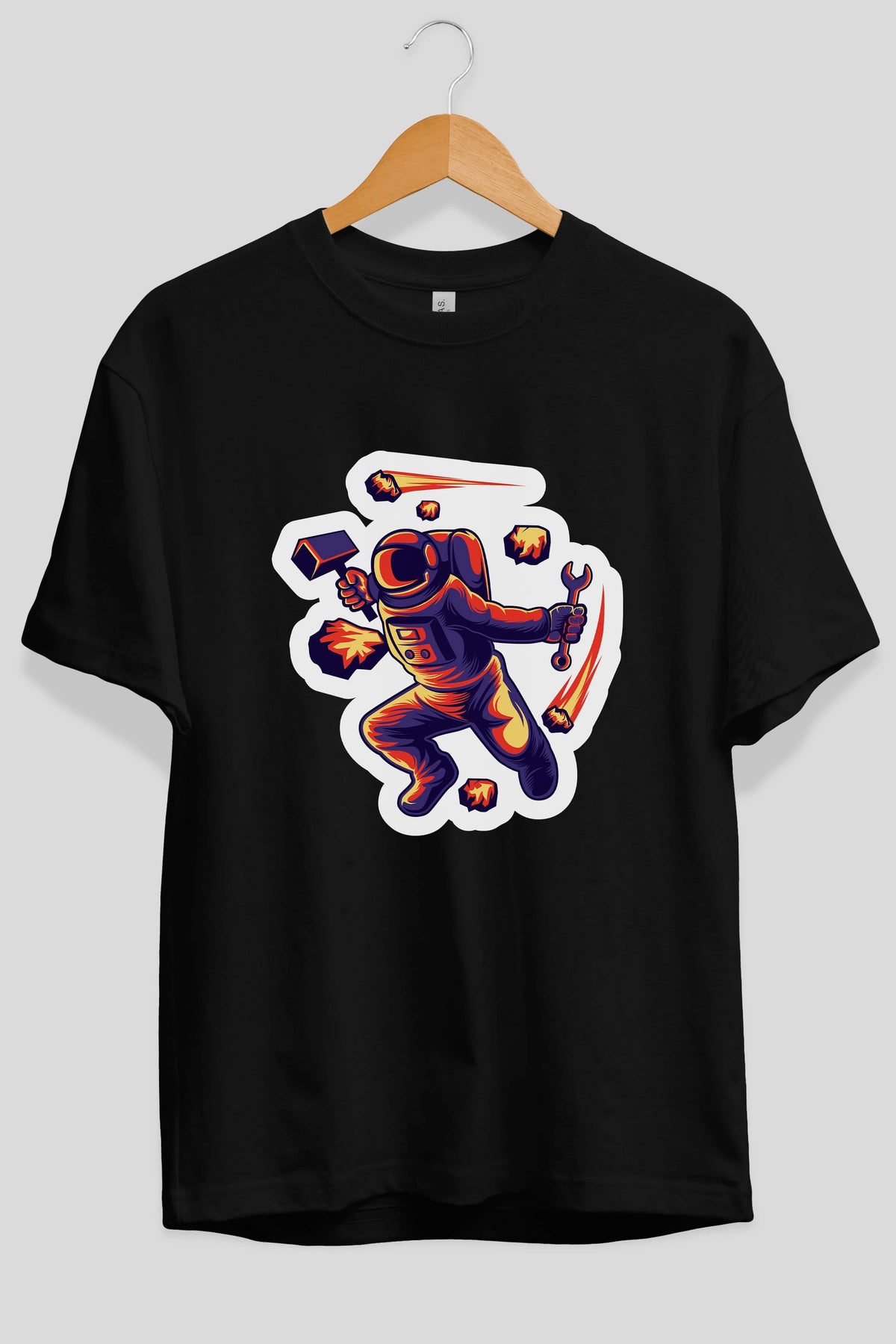 Astronaut Block Meteor Sticker Ön Baskılı Oversize t-shirt Erkek Kadın Unisex