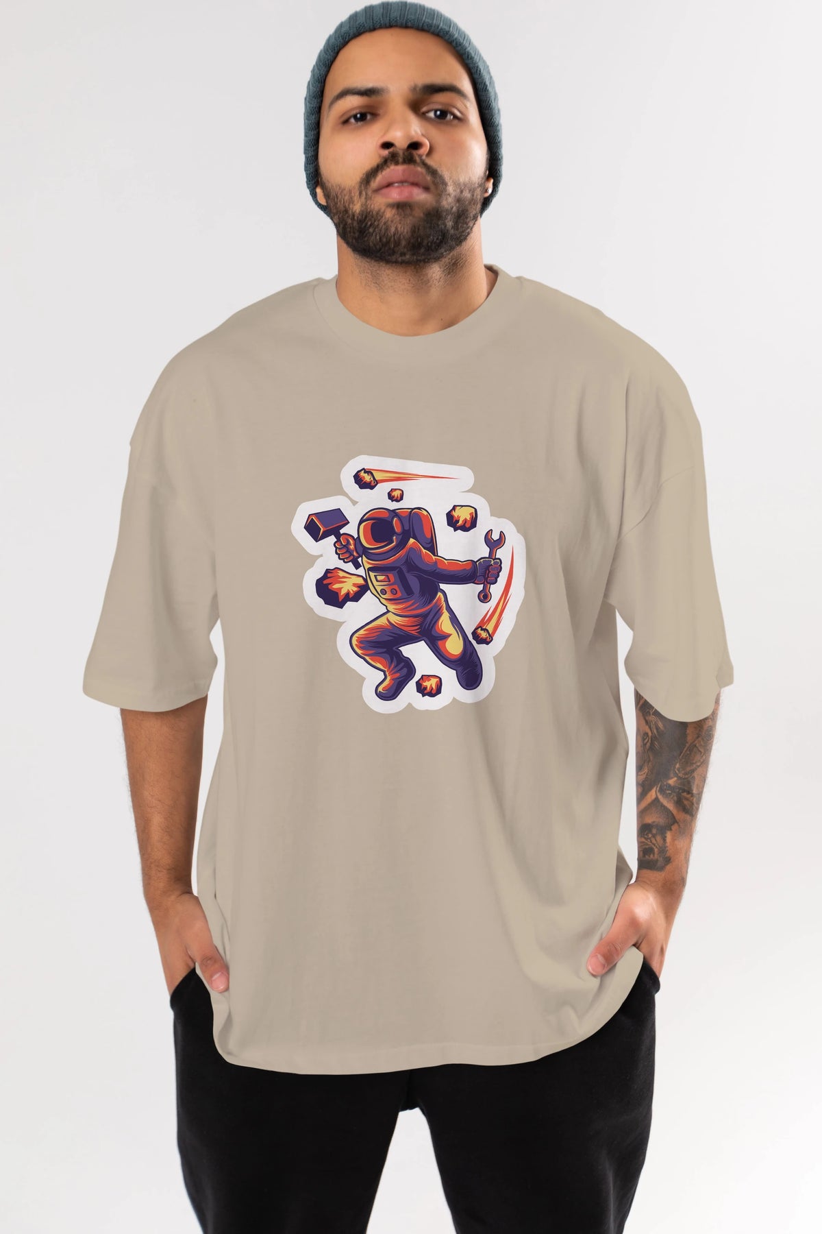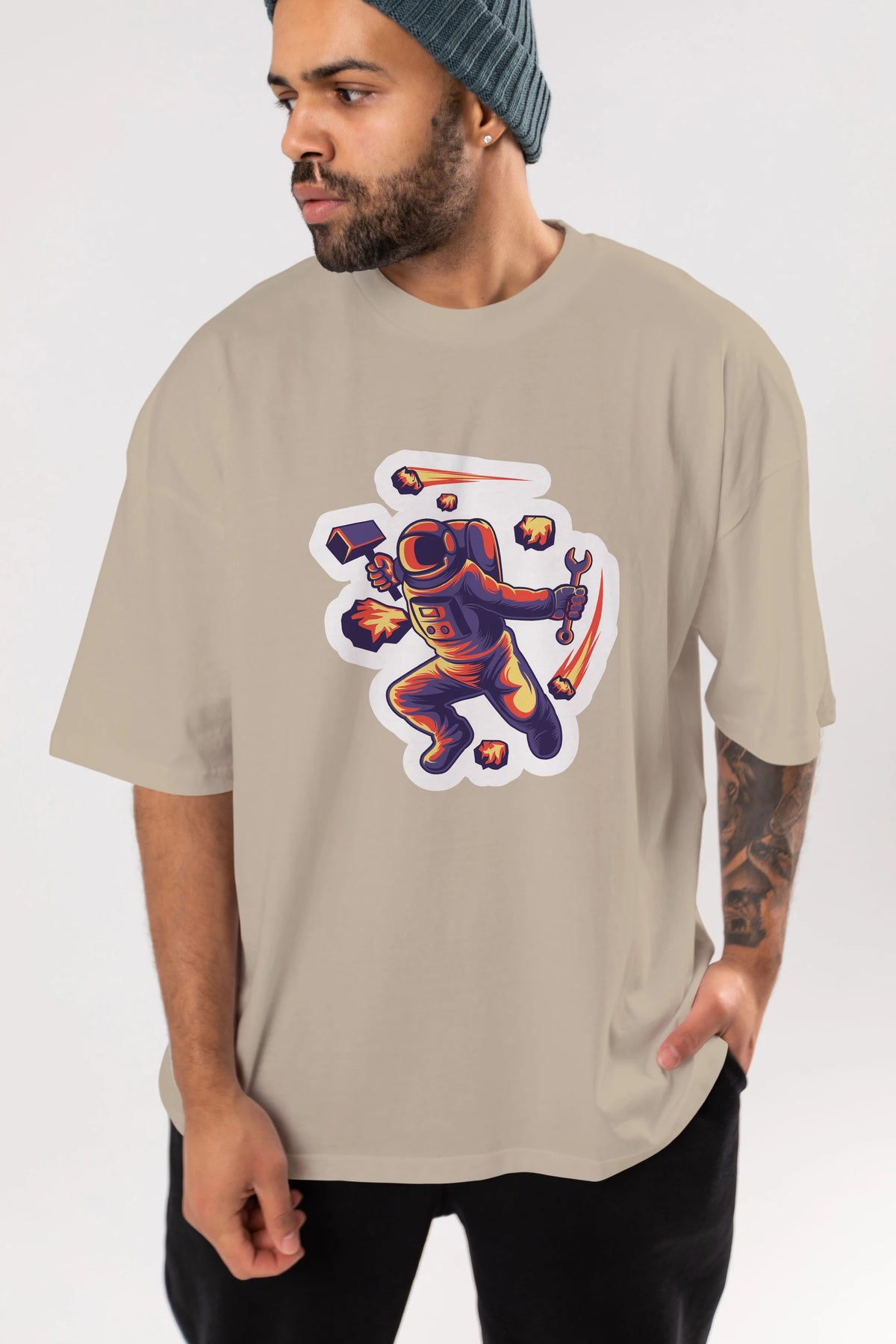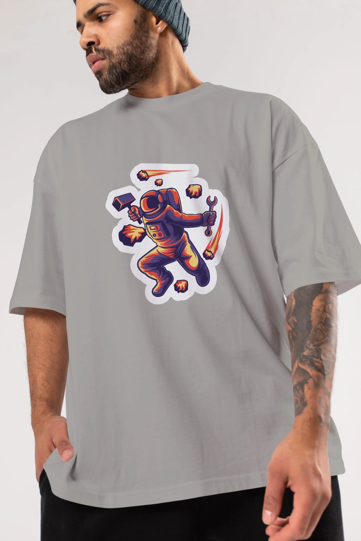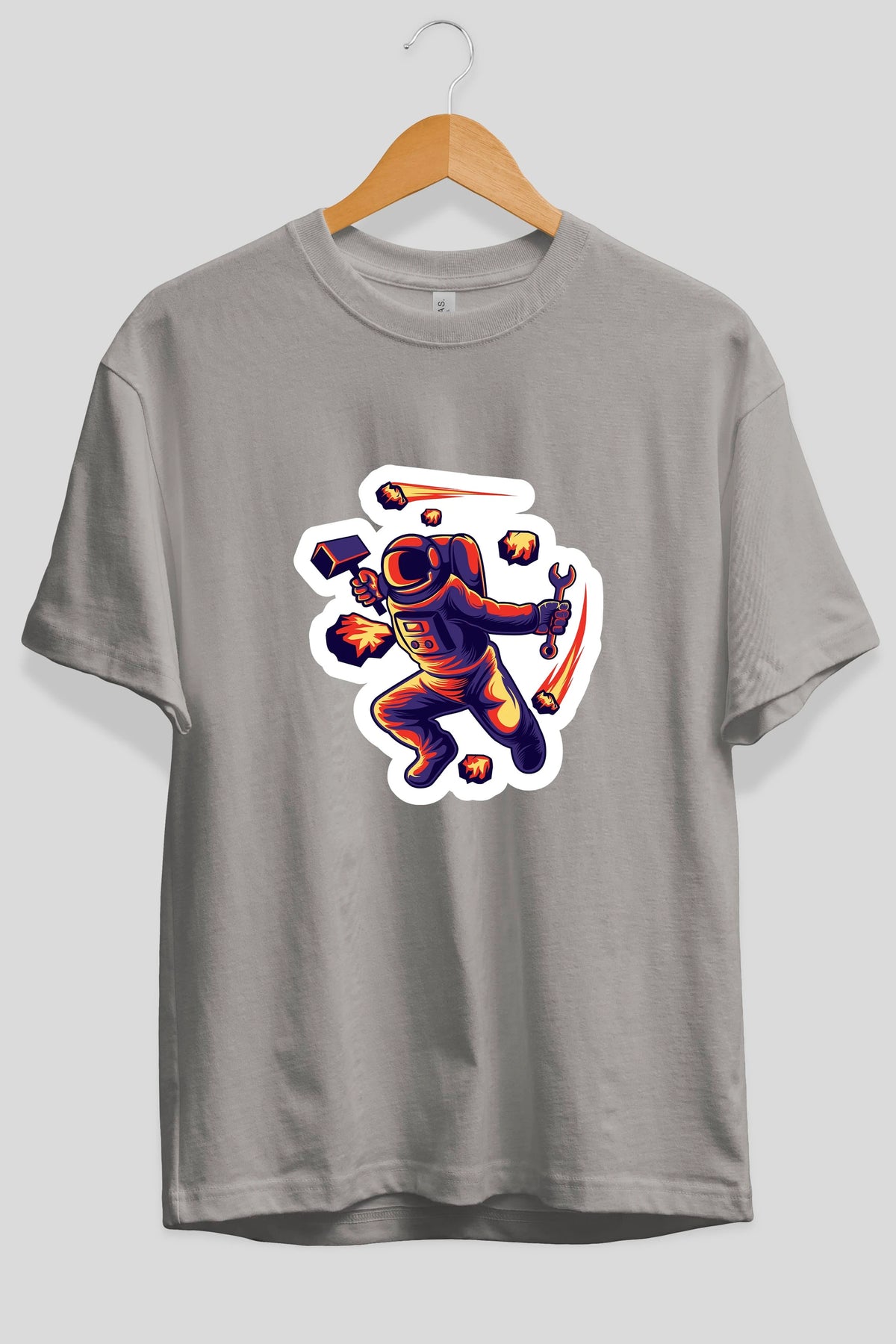 Astronaut Block Meteor Sticker Ön Baskılı Oversize t-shirt Erkek Kadın Unisex