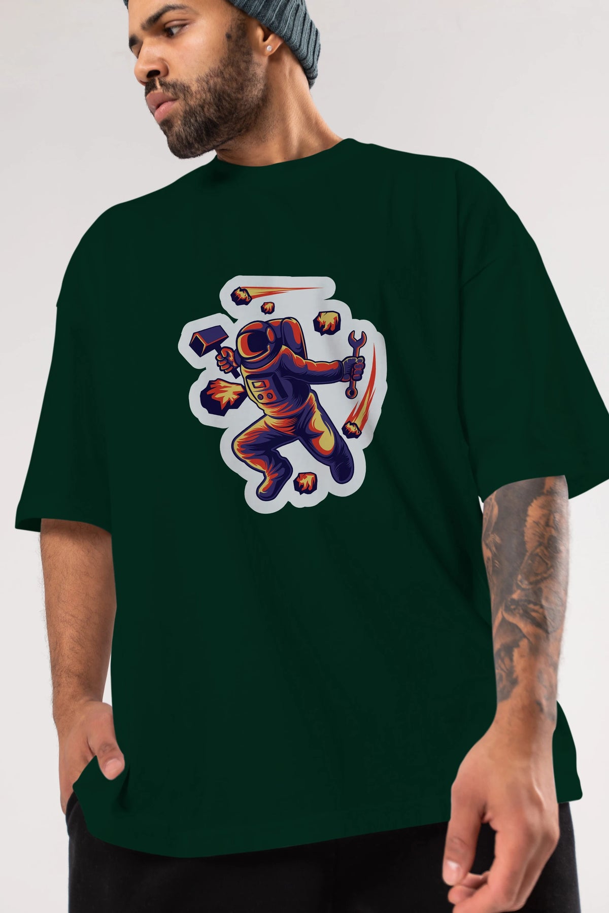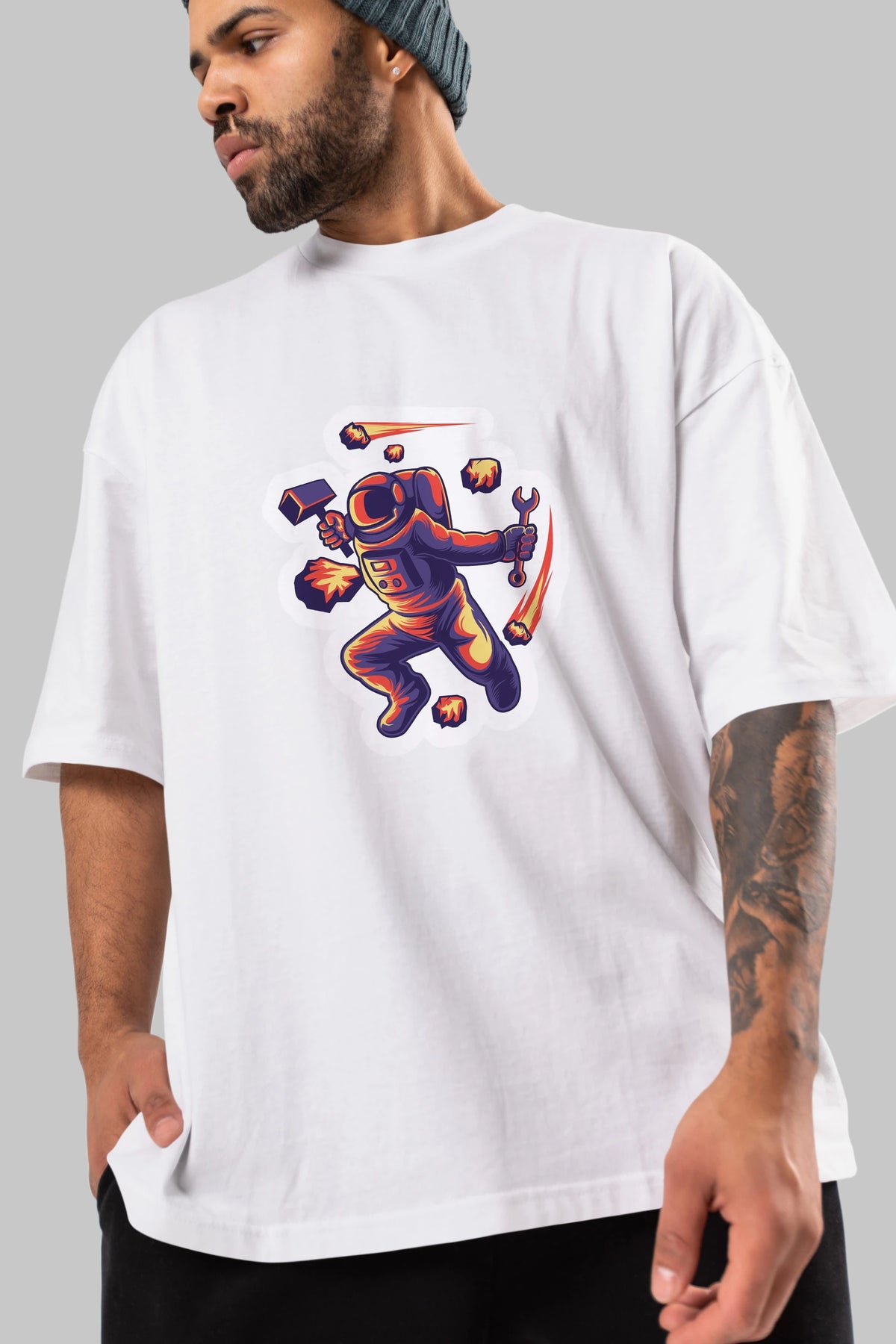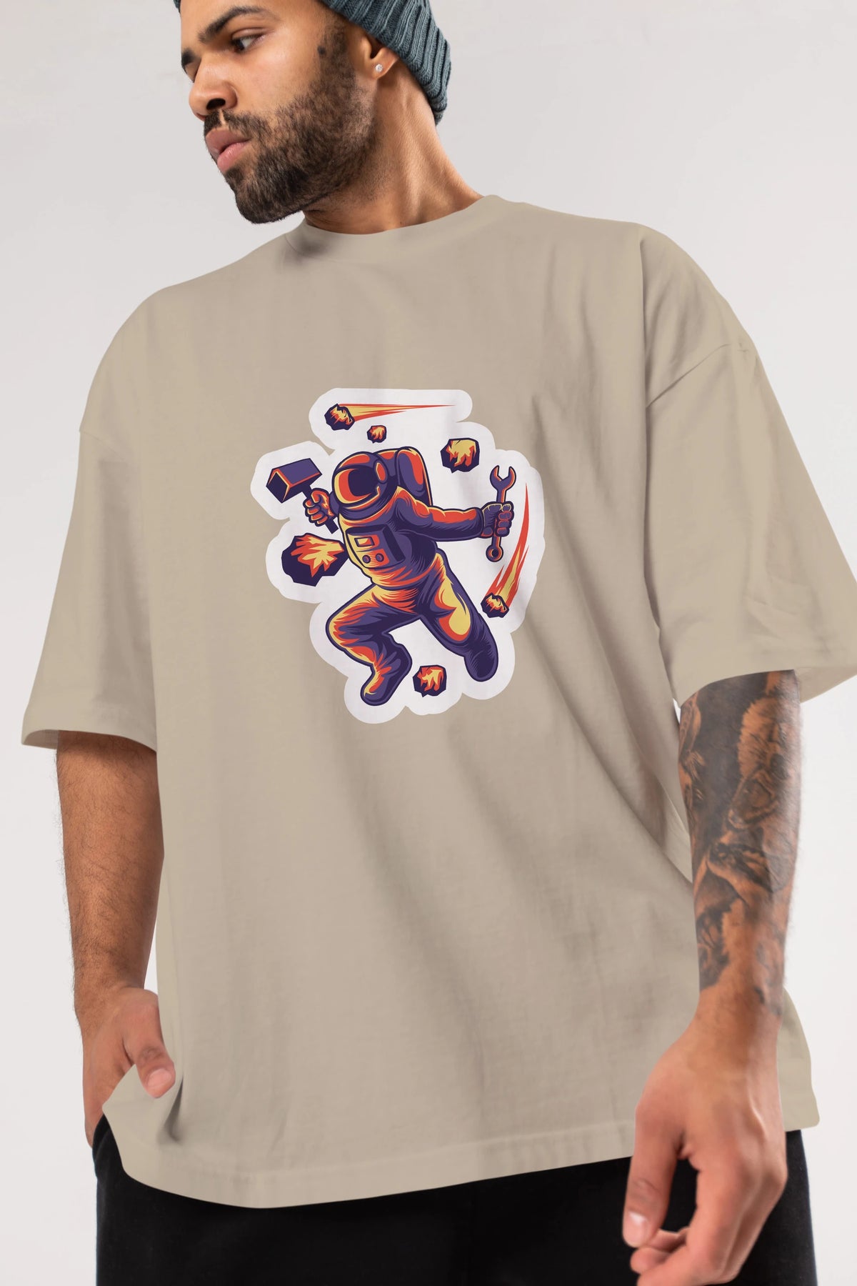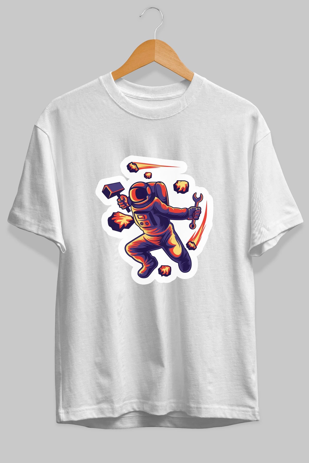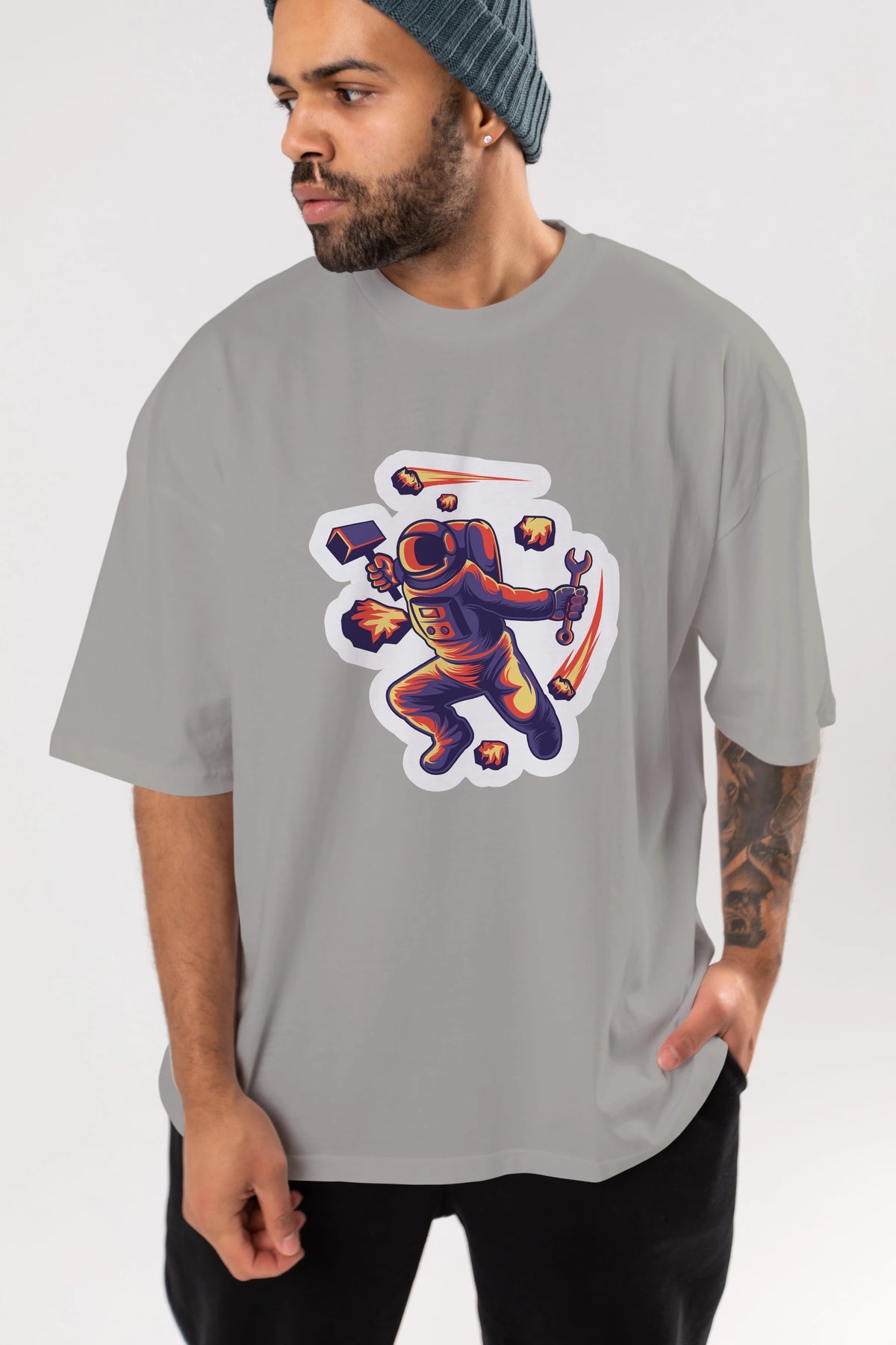 Astronaut Block Meteor Sticker Ön Baskılı Oversize t-shirt Erkek Kadın Unisex