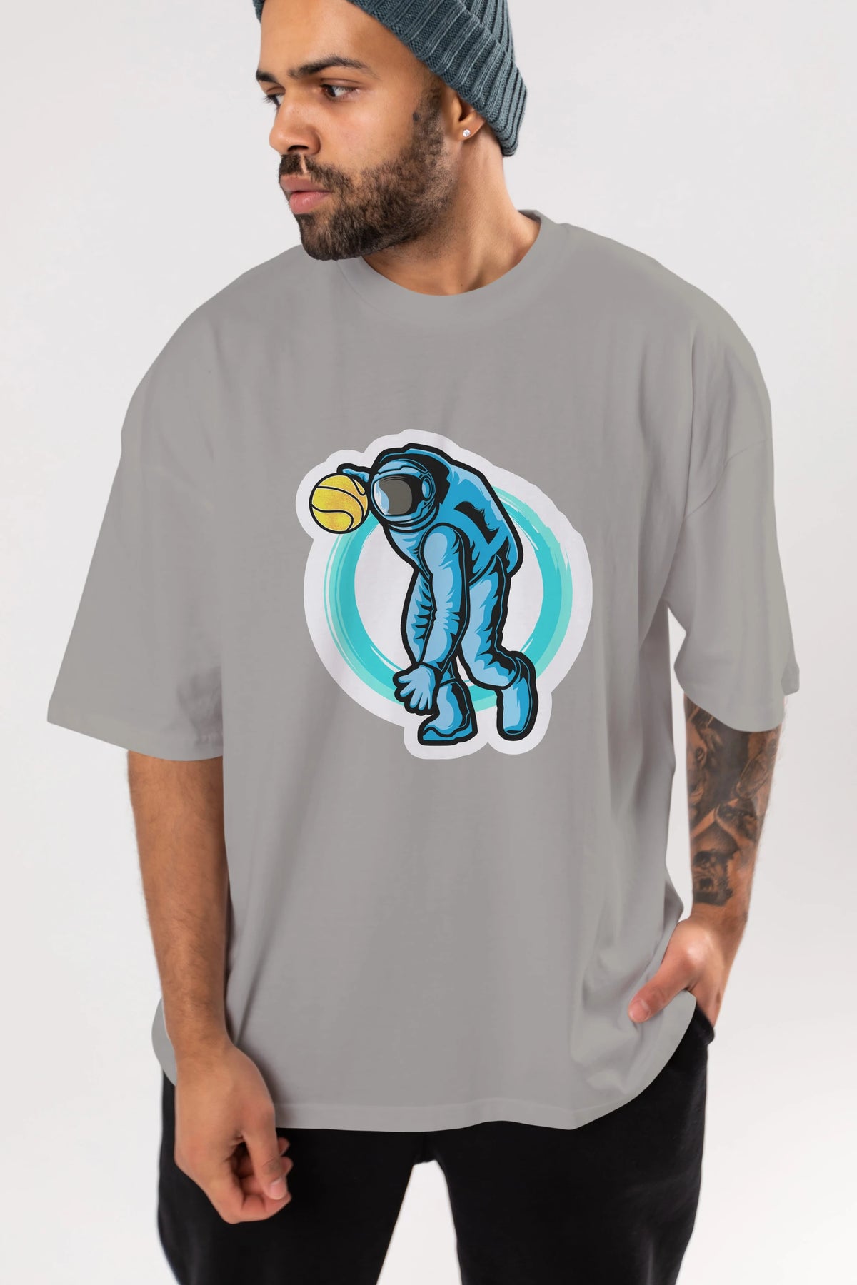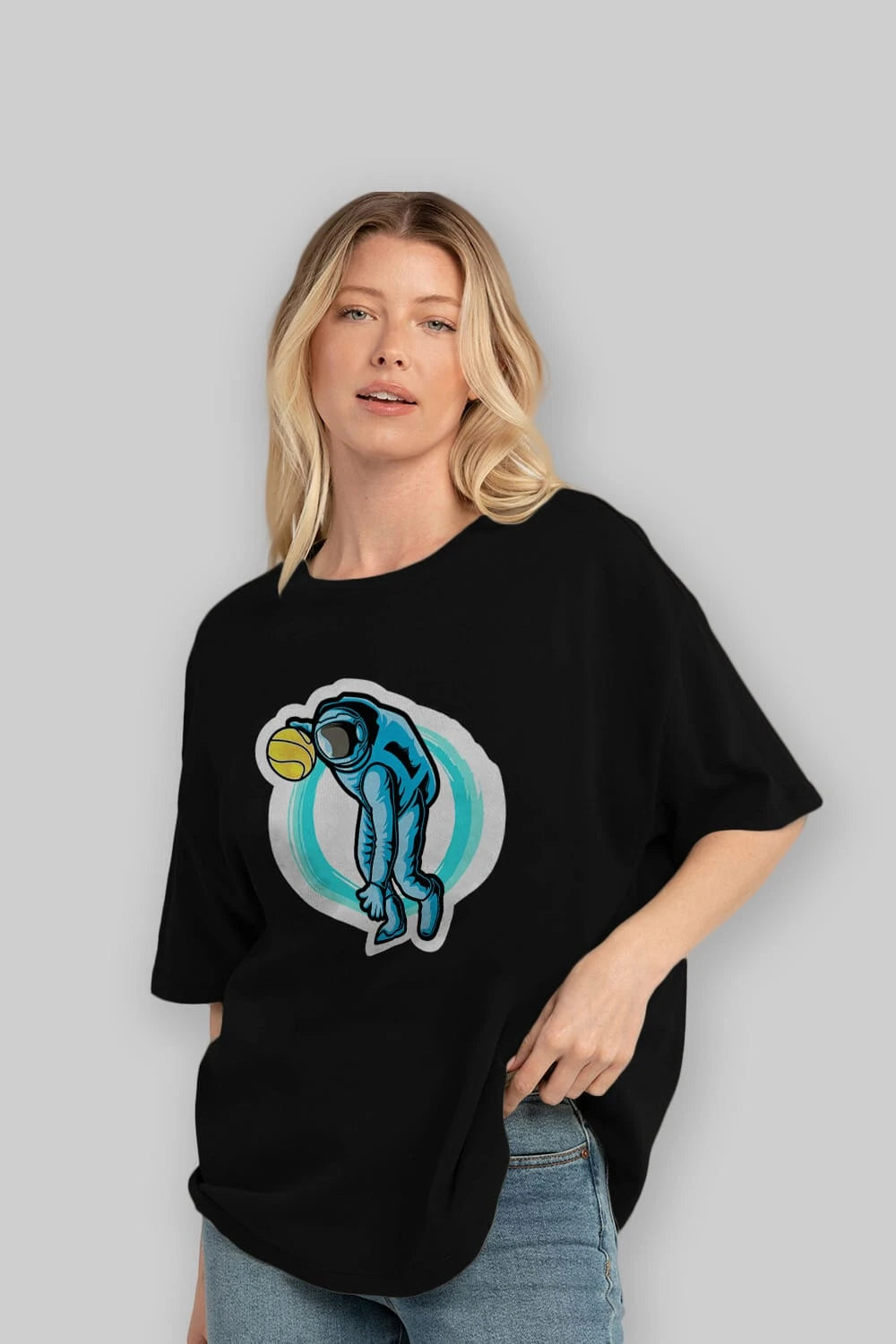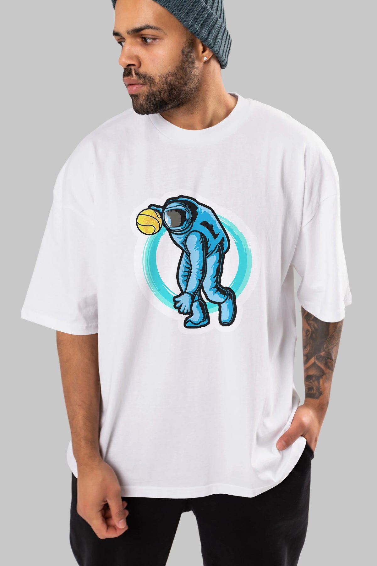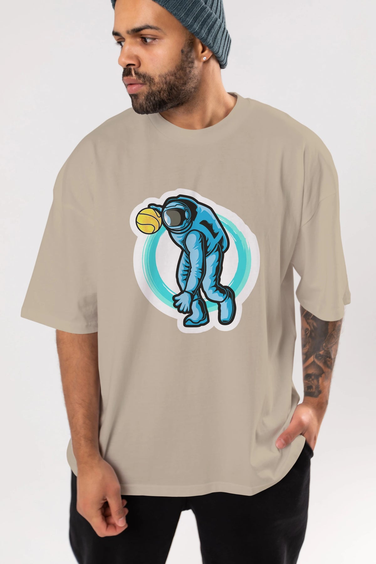 Astronaut Dribble Sticker Ön Baskılı Oversize t-shirt Erkek Kadın Unisex