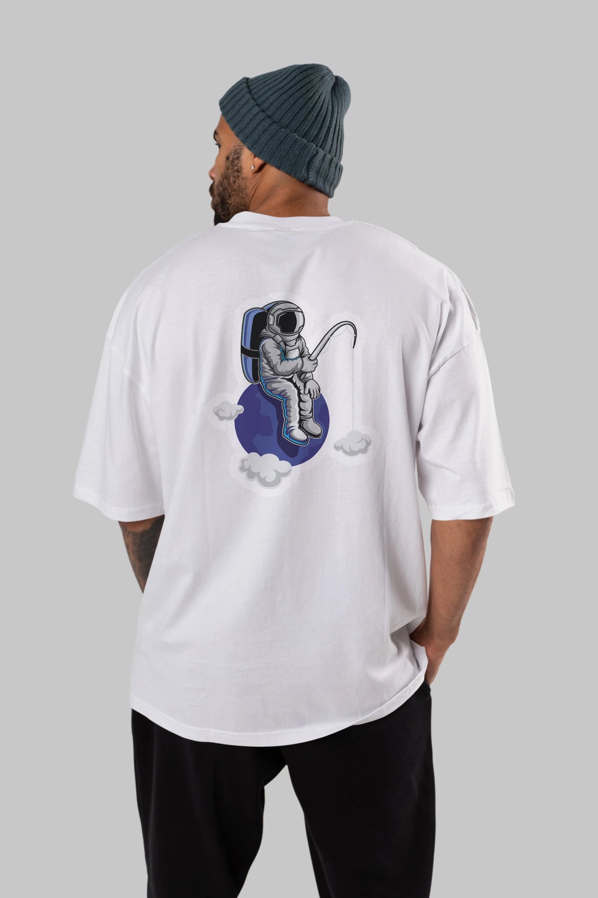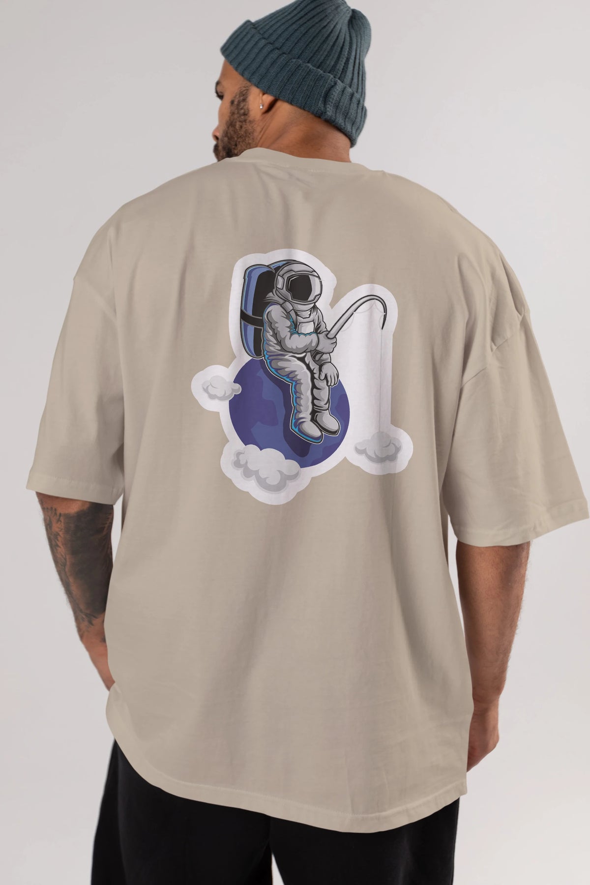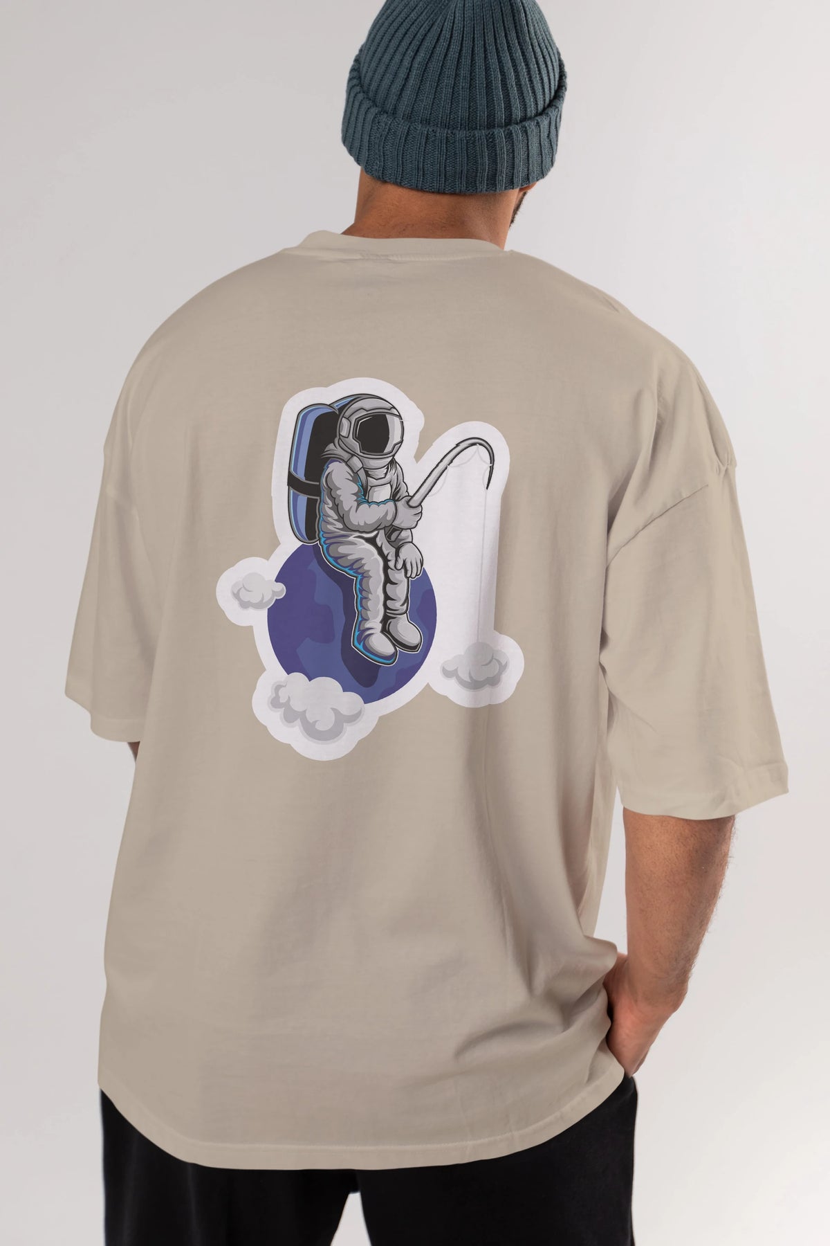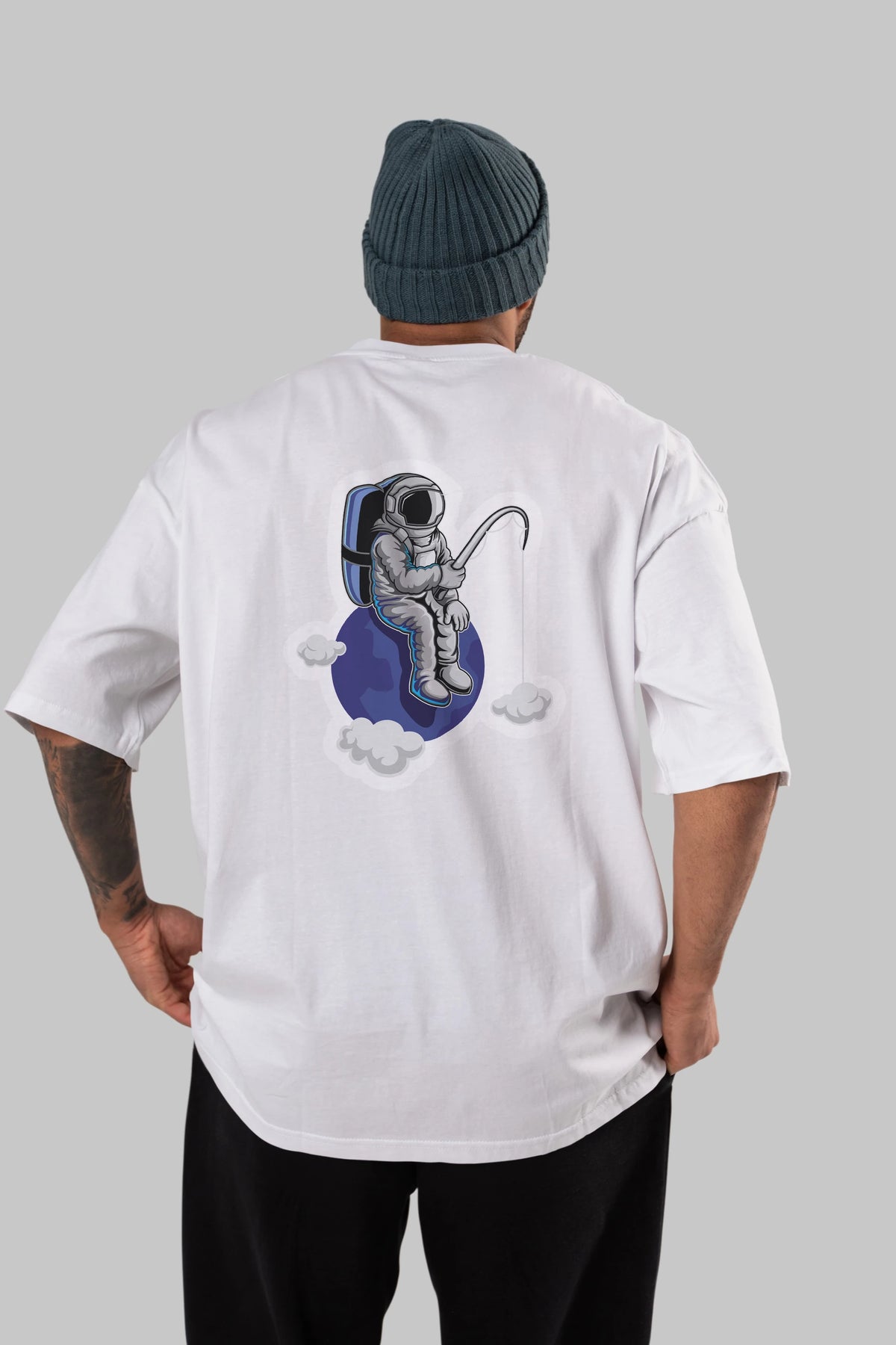 Astronaut Fishing Sticker Arka Baskılı Oversize t-shirt Erkek Kadın Unisex