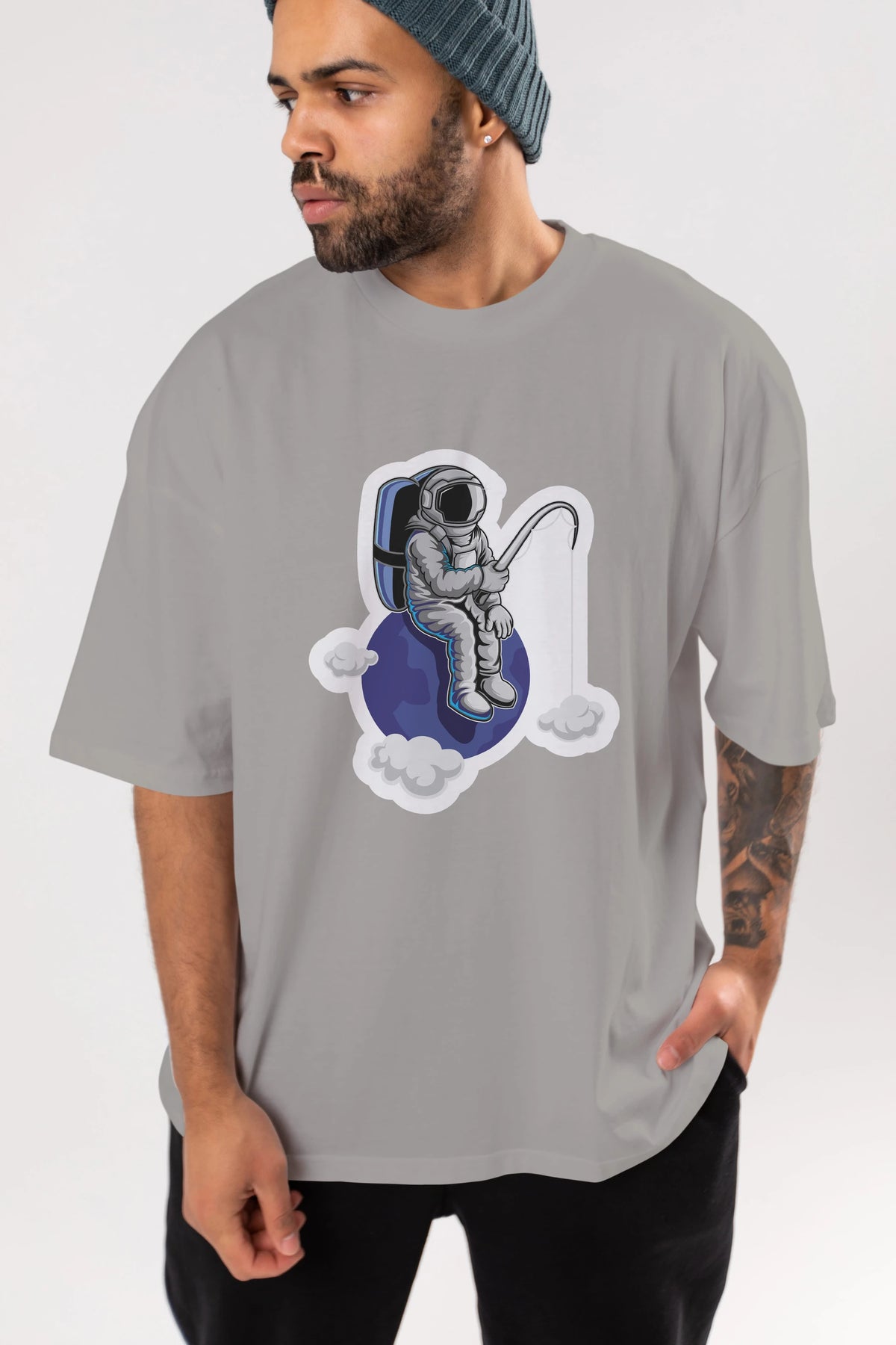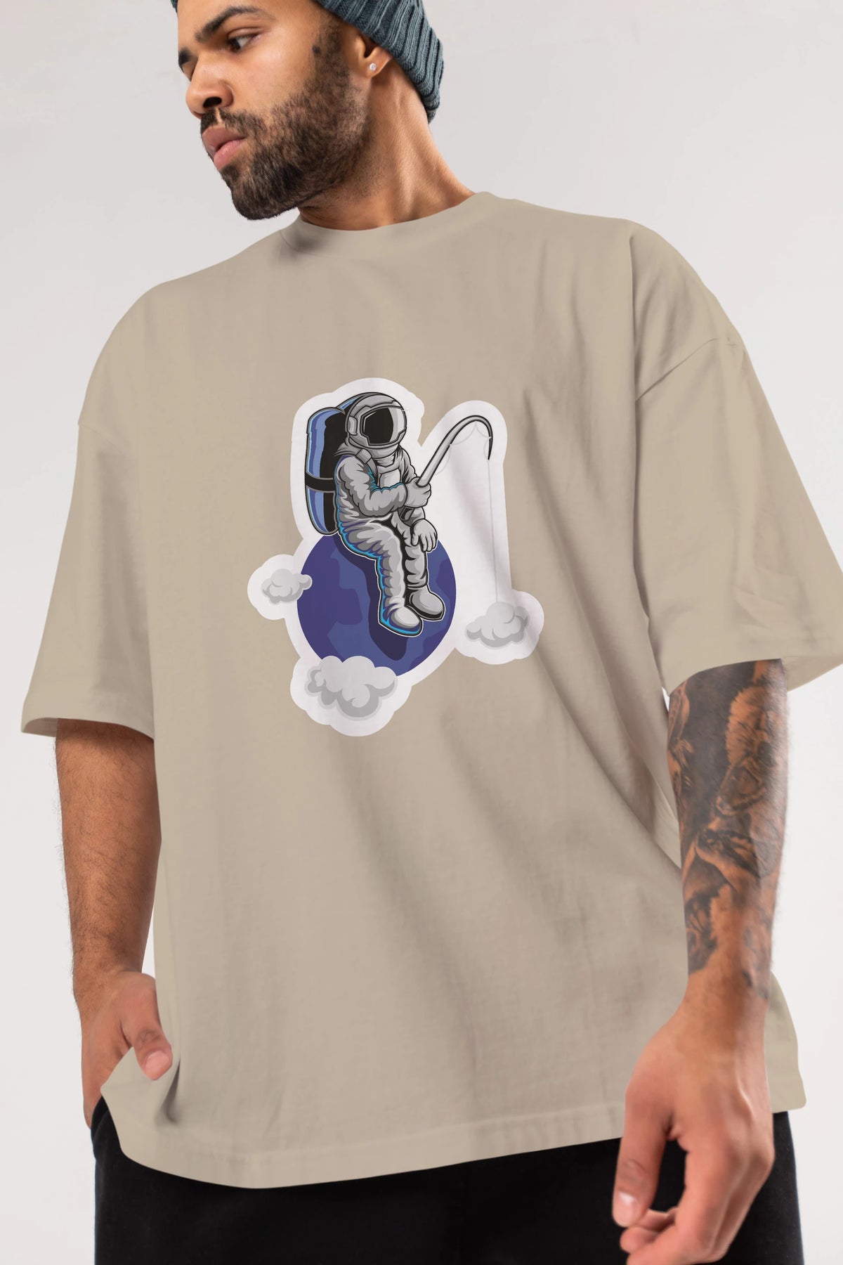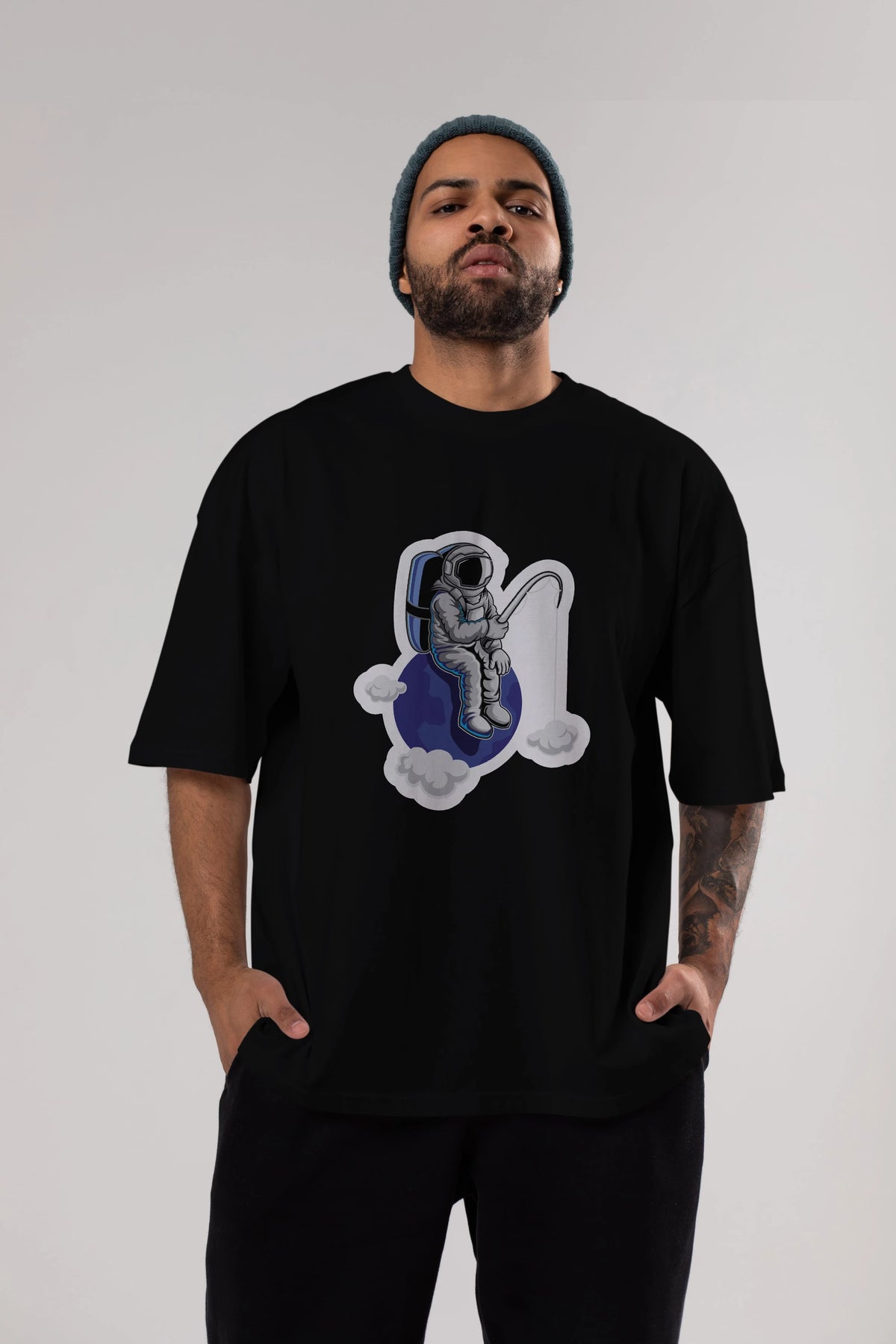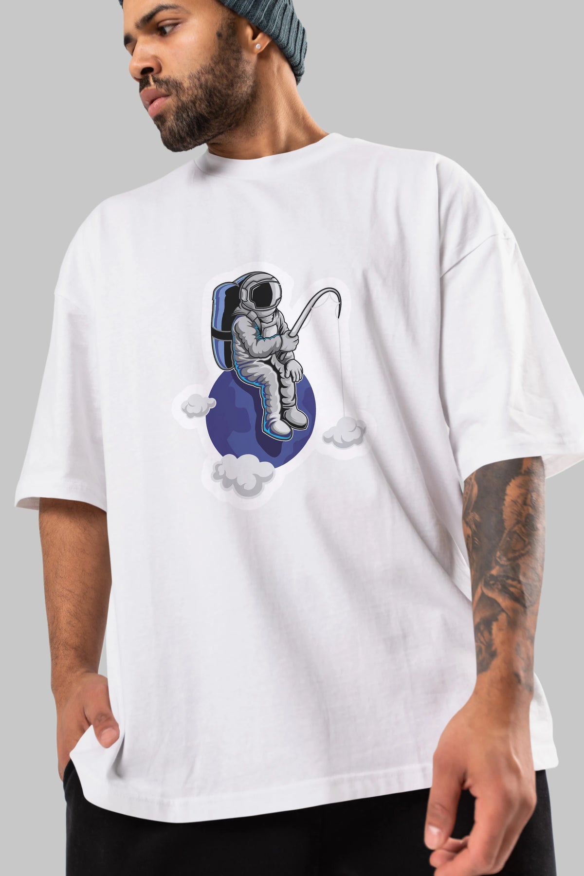 Astronaut Fishing Sticker Ön Baskılı Oversize t-shirt Erkek Kadın Unisex