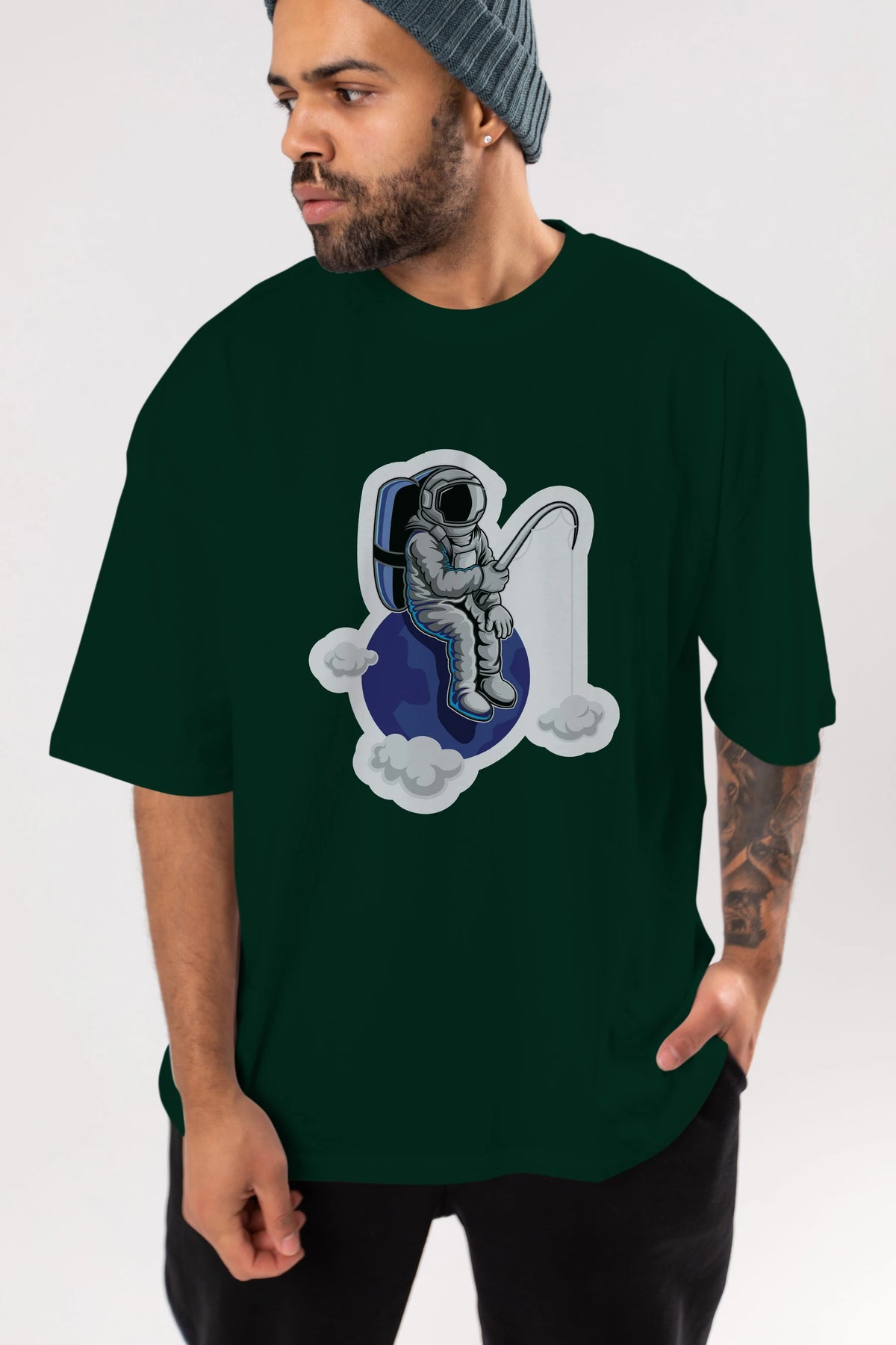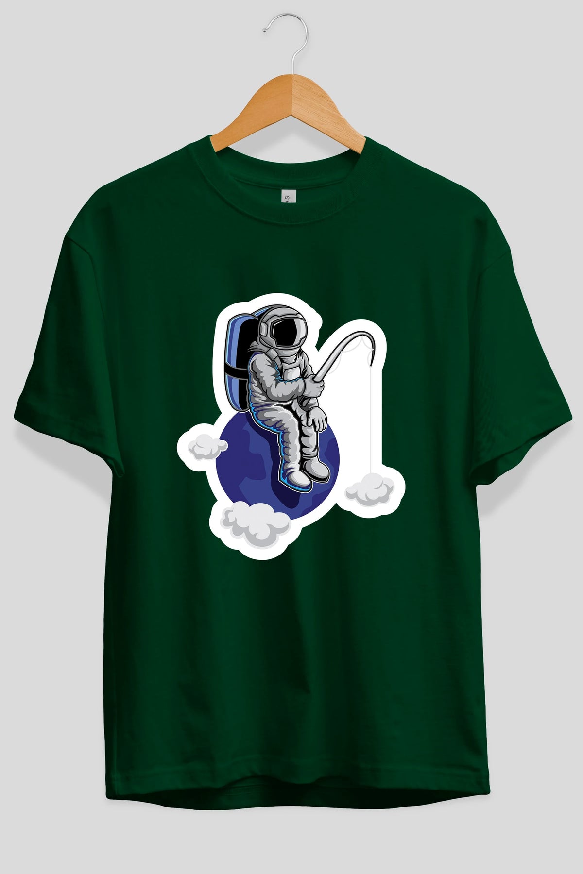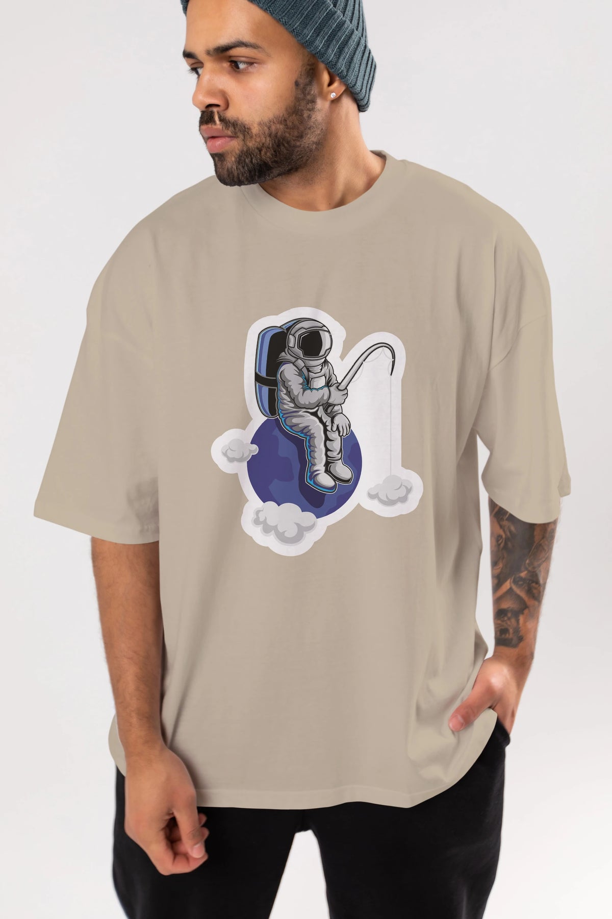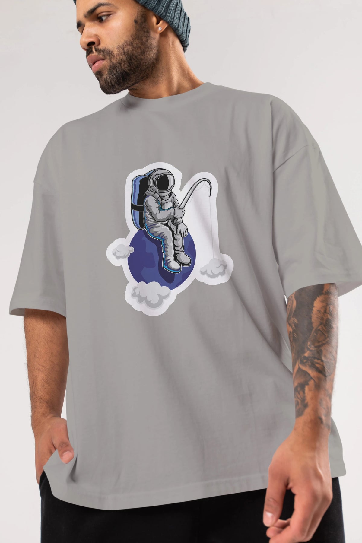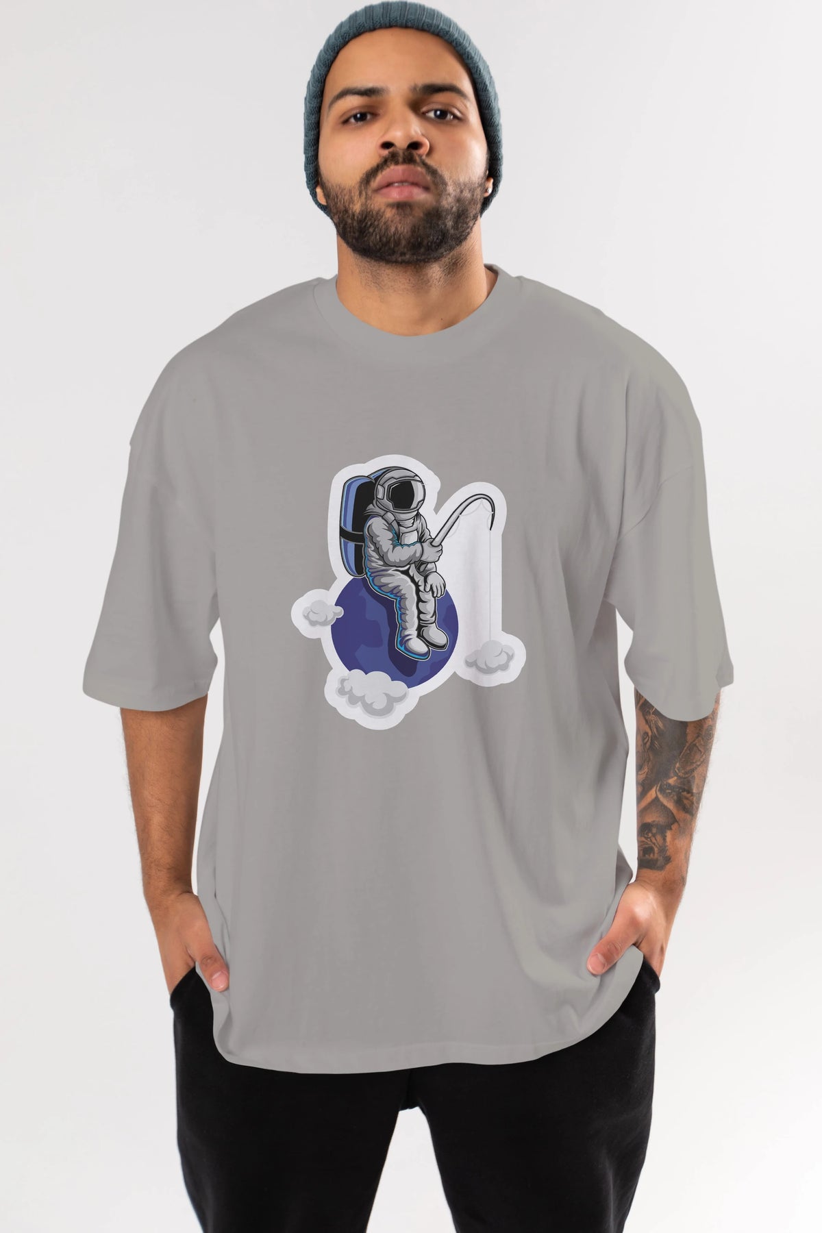 Astronaut Fishing Sticker Ön Baskılı Oversize t-shirt Erkek Kadın Unisex