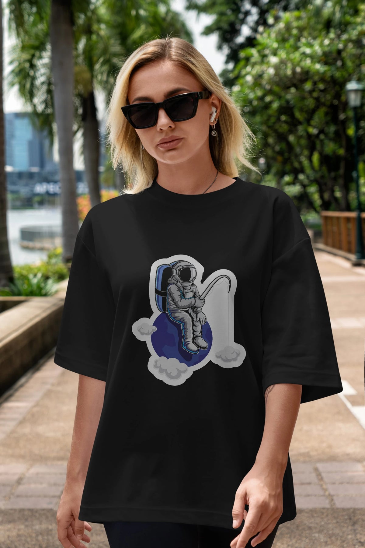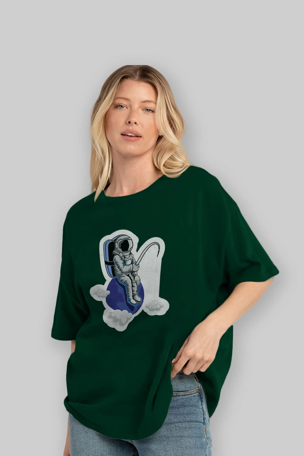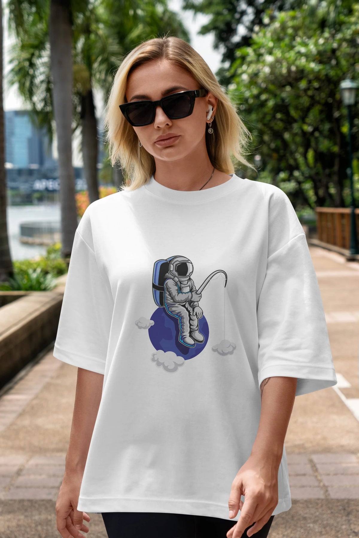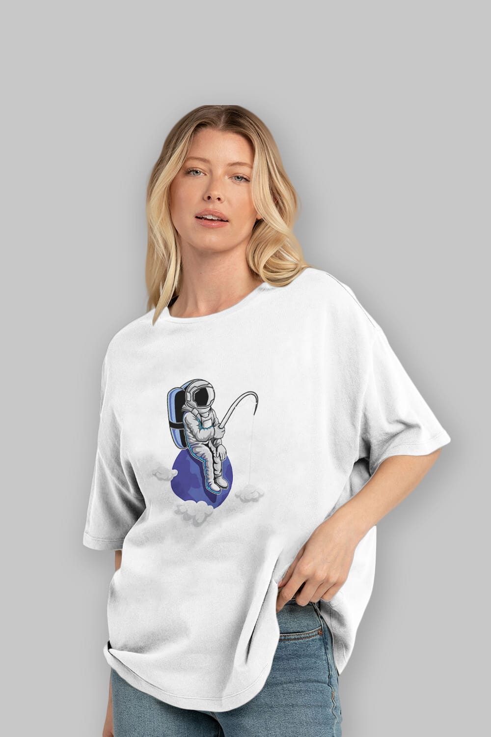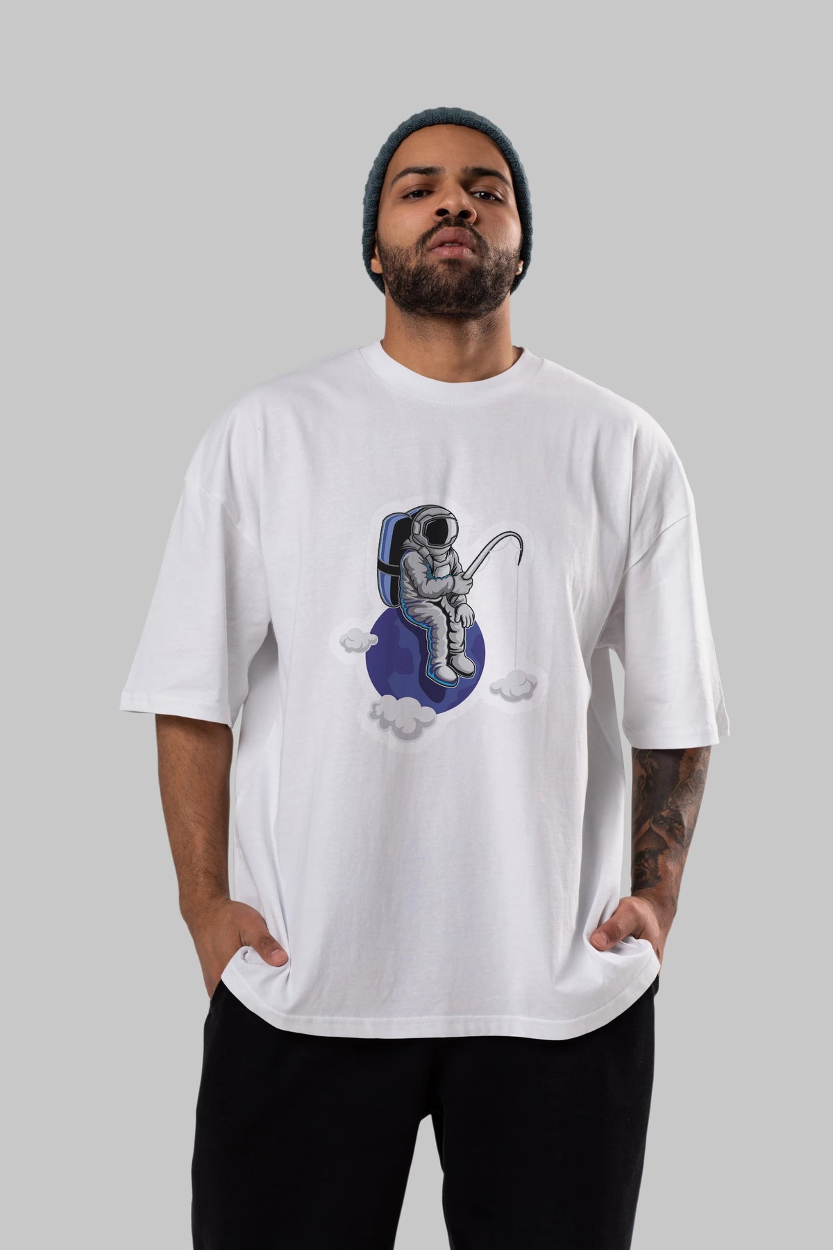 Astronaut Fishing Sticker Ön Baskılı Oversize t-shirt Erkek Kadın Unisex