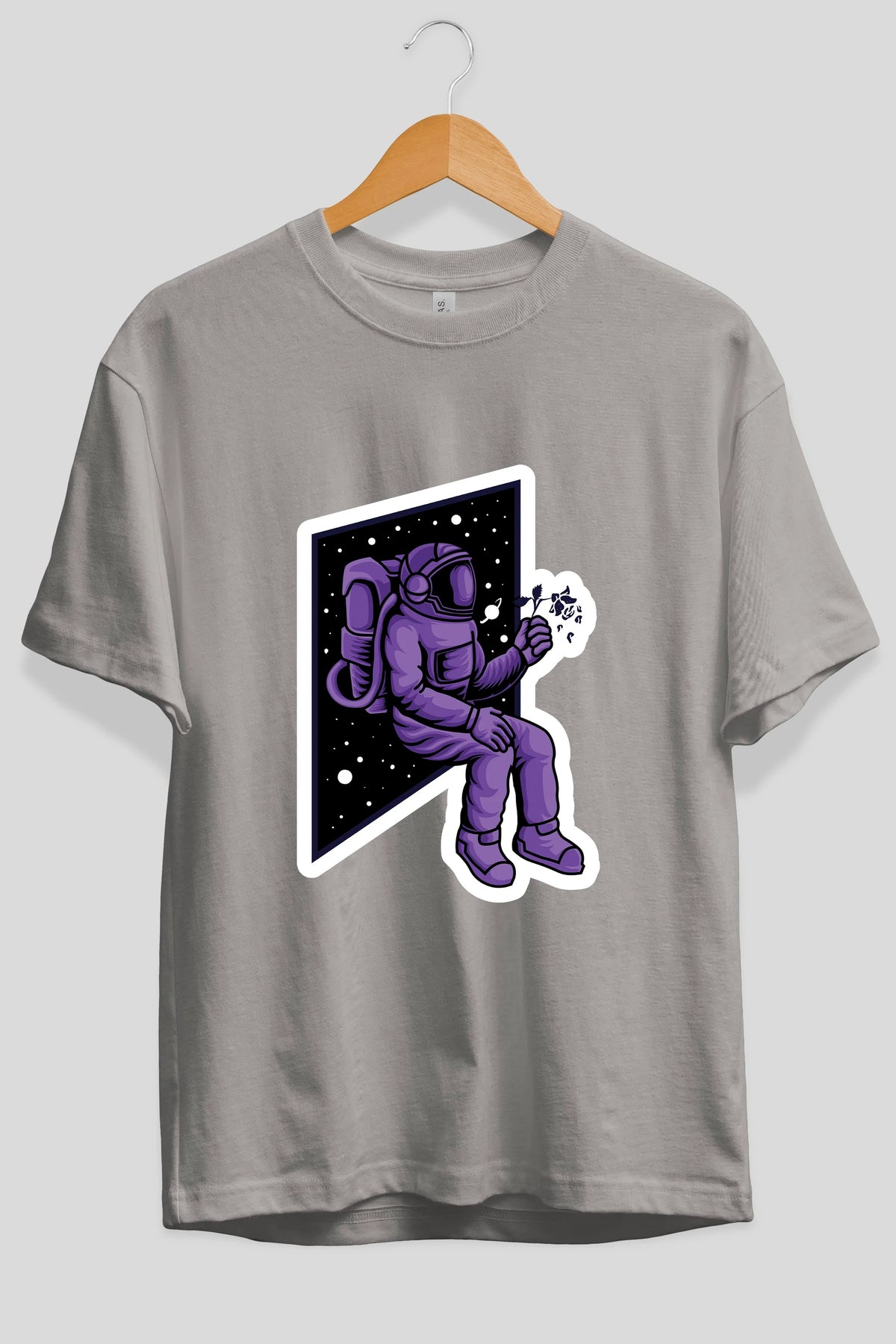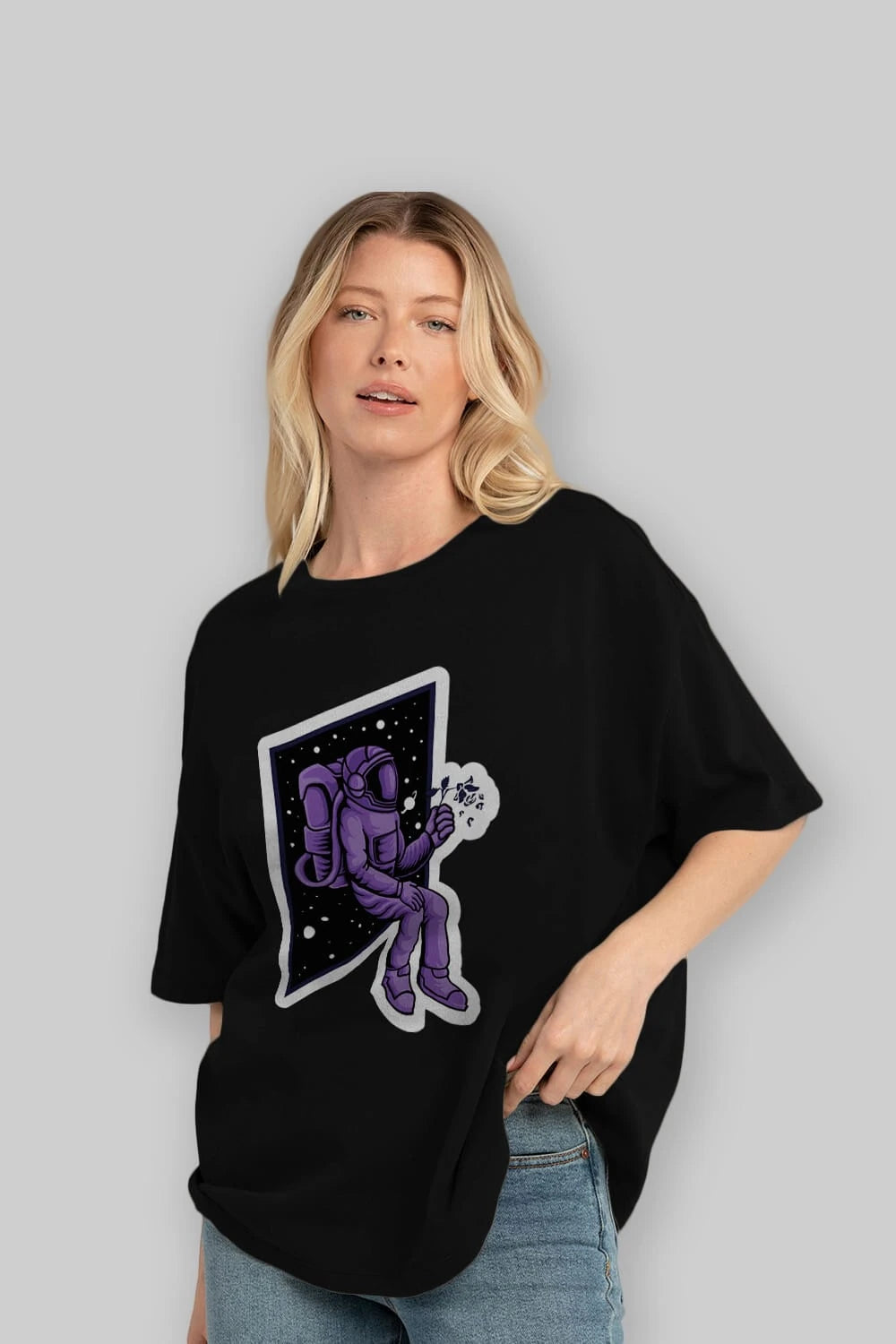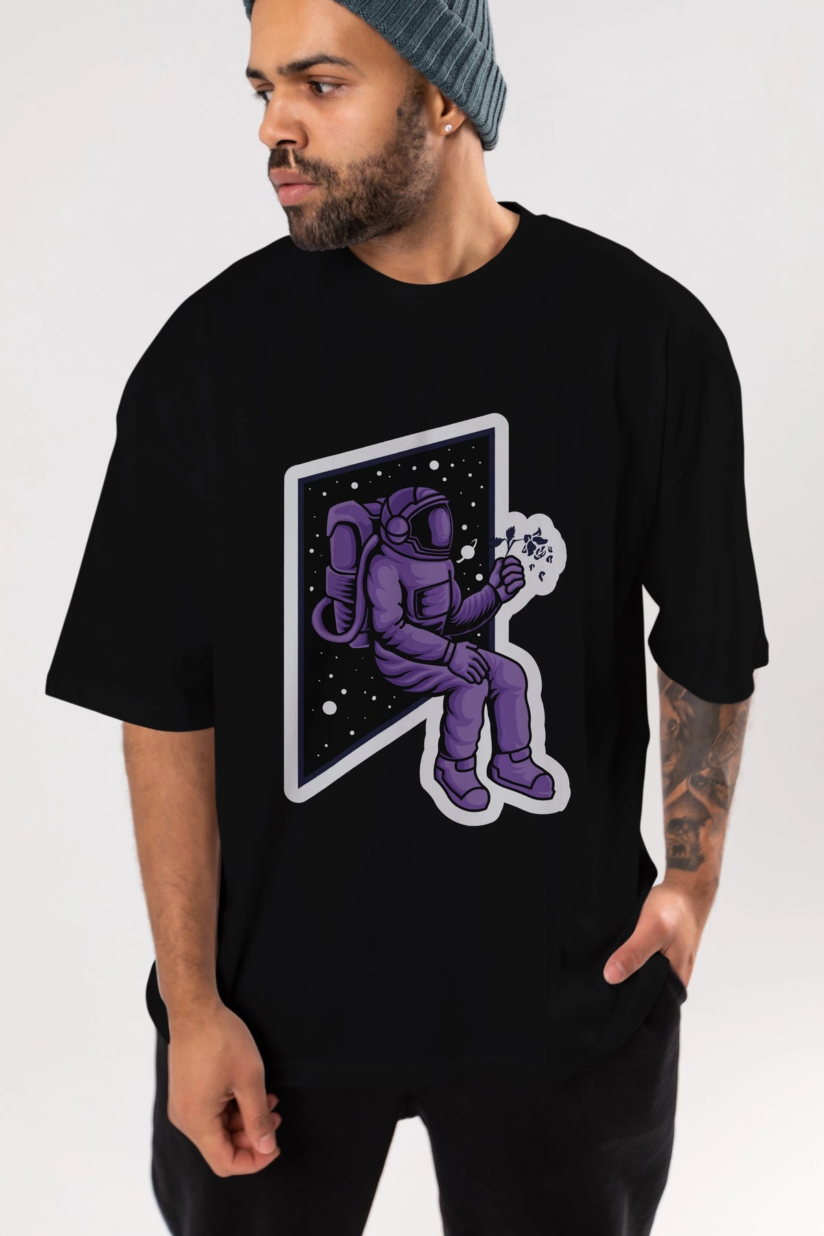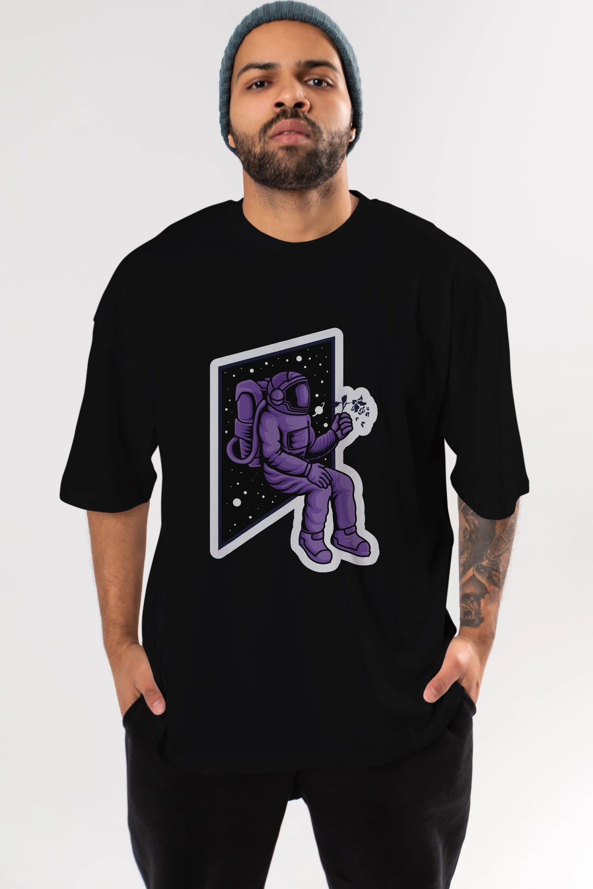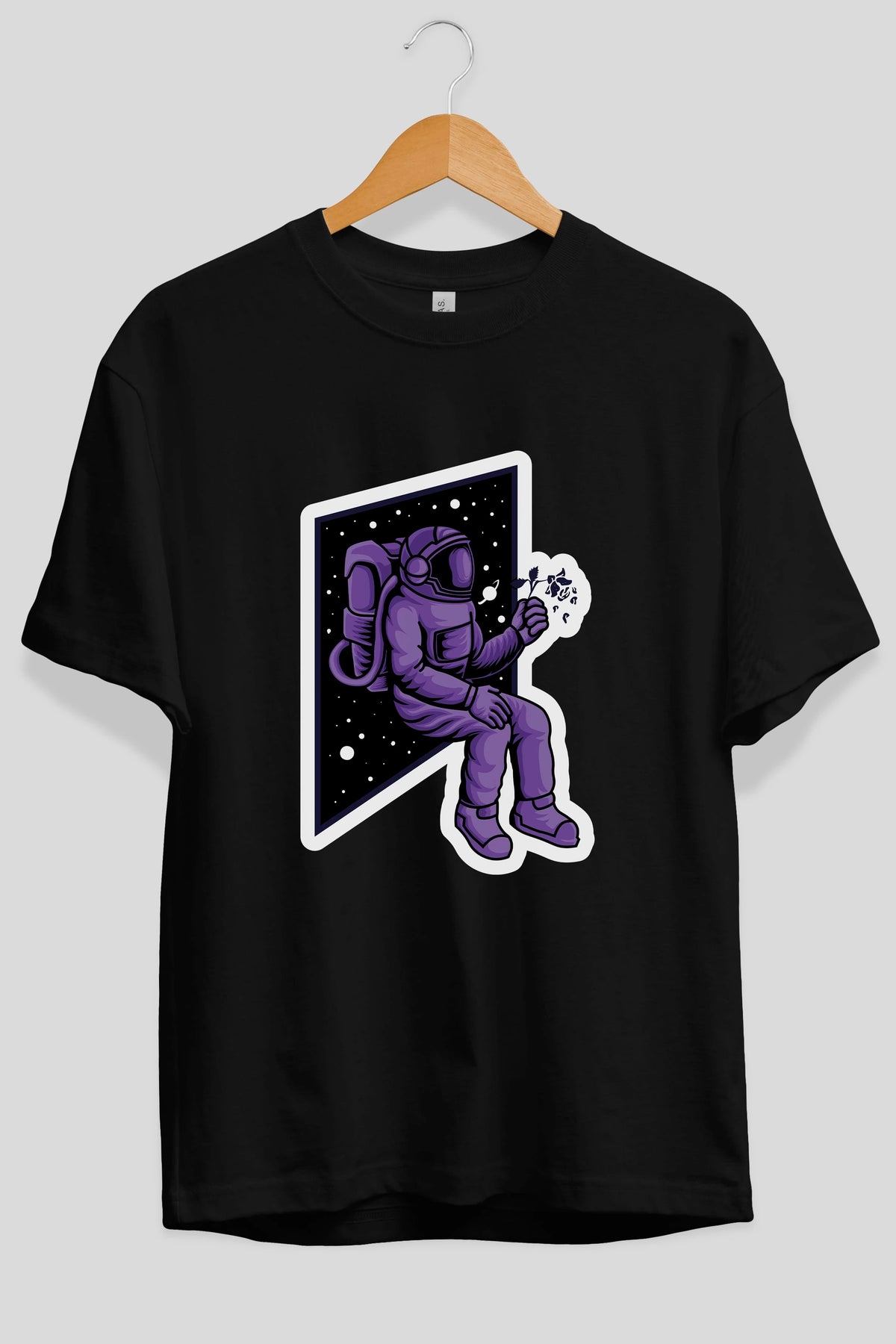 Astronaut holding black rose sticker Ön Baskılı Oversize t-shirt Erkek Kadın Unisex
