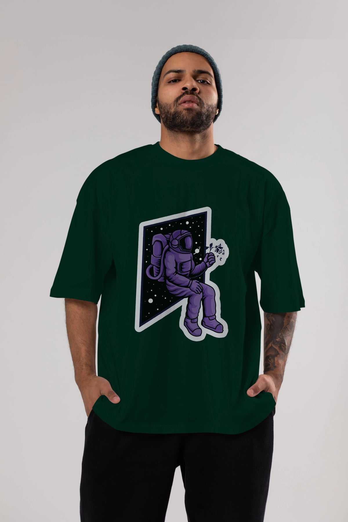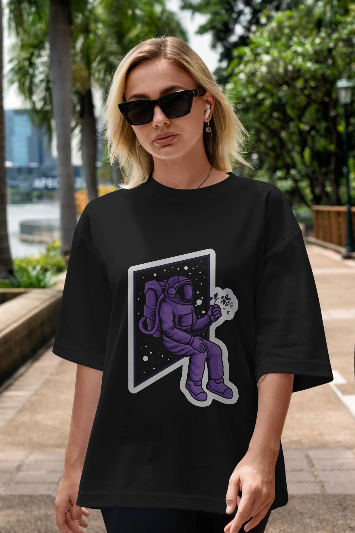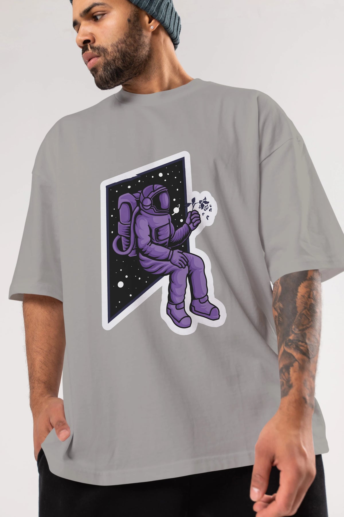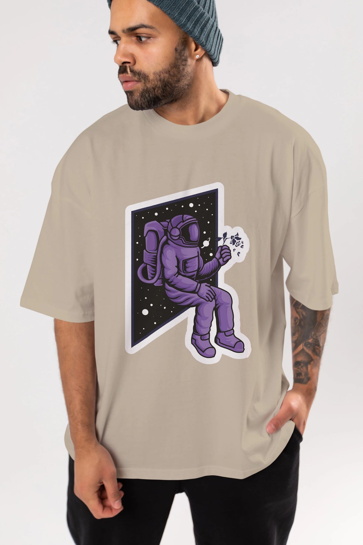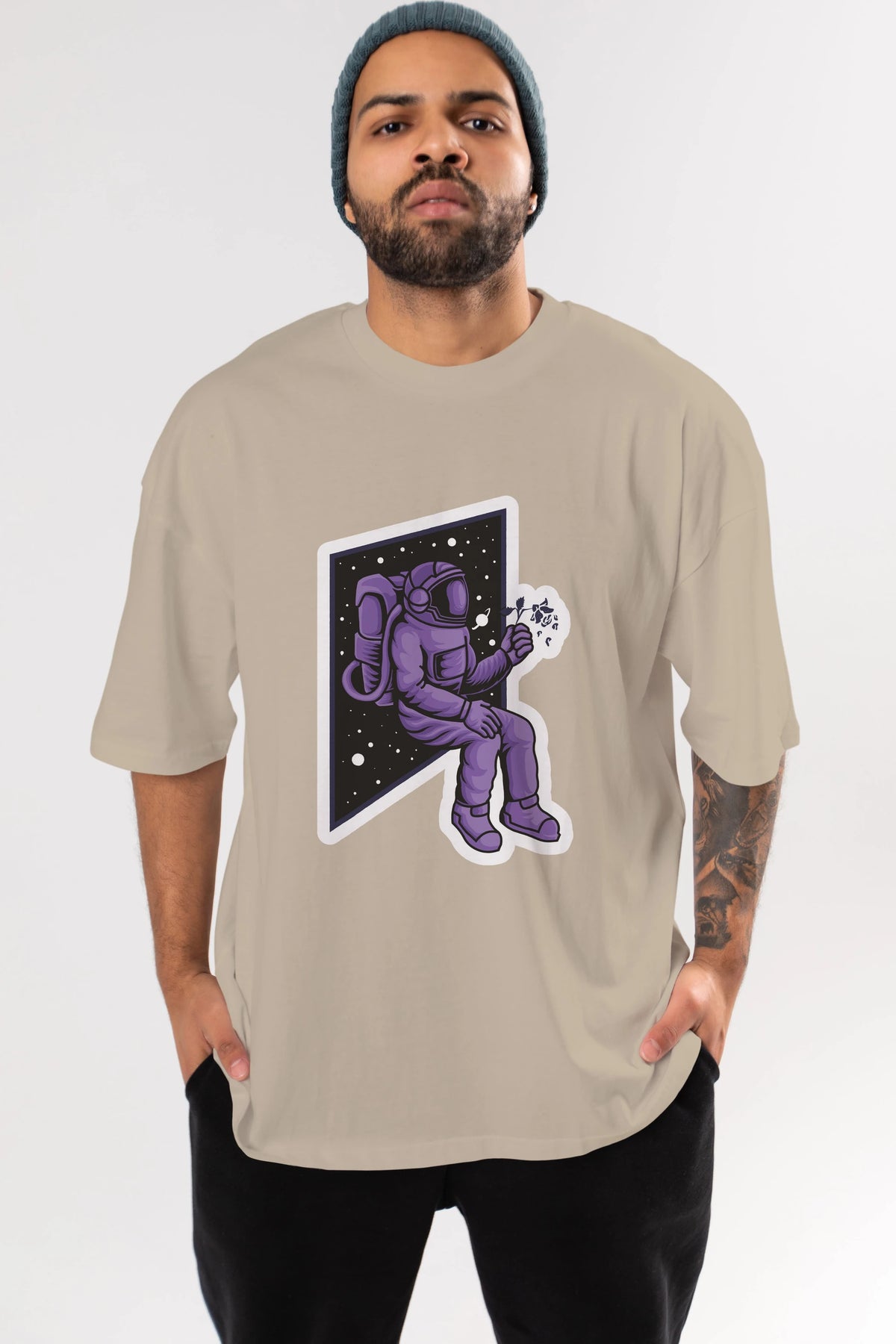 Astronaut holding black rose sticker Ön Baskılı Oversize t-shirt Erkek Kadın Unisex