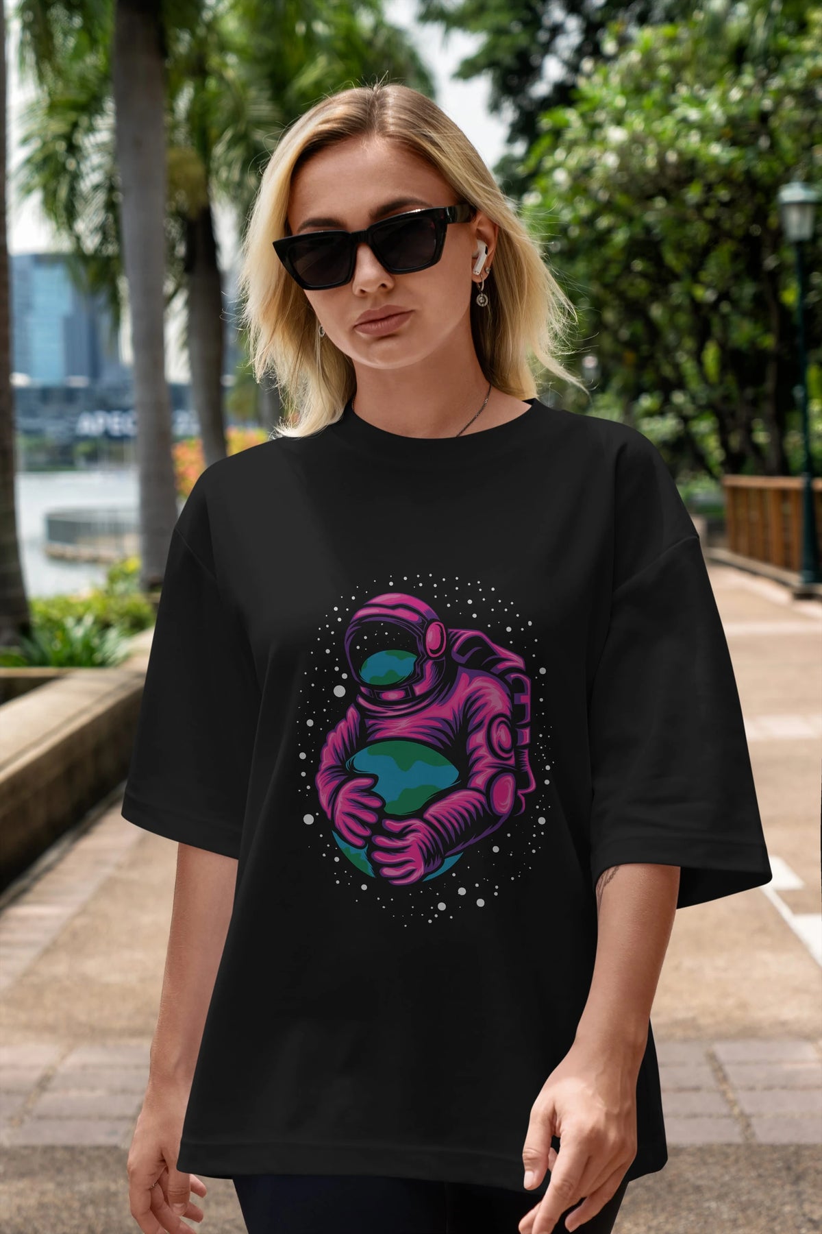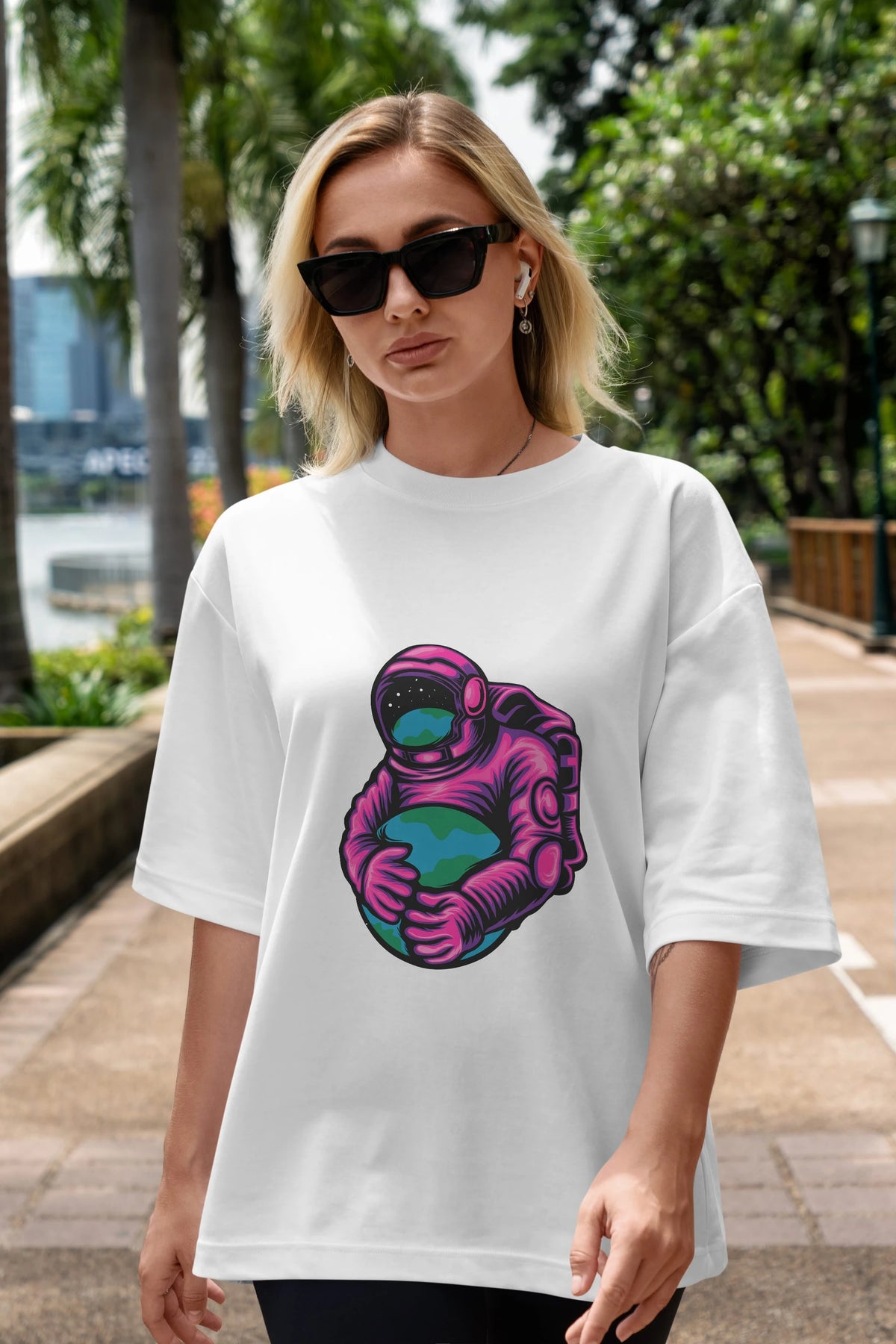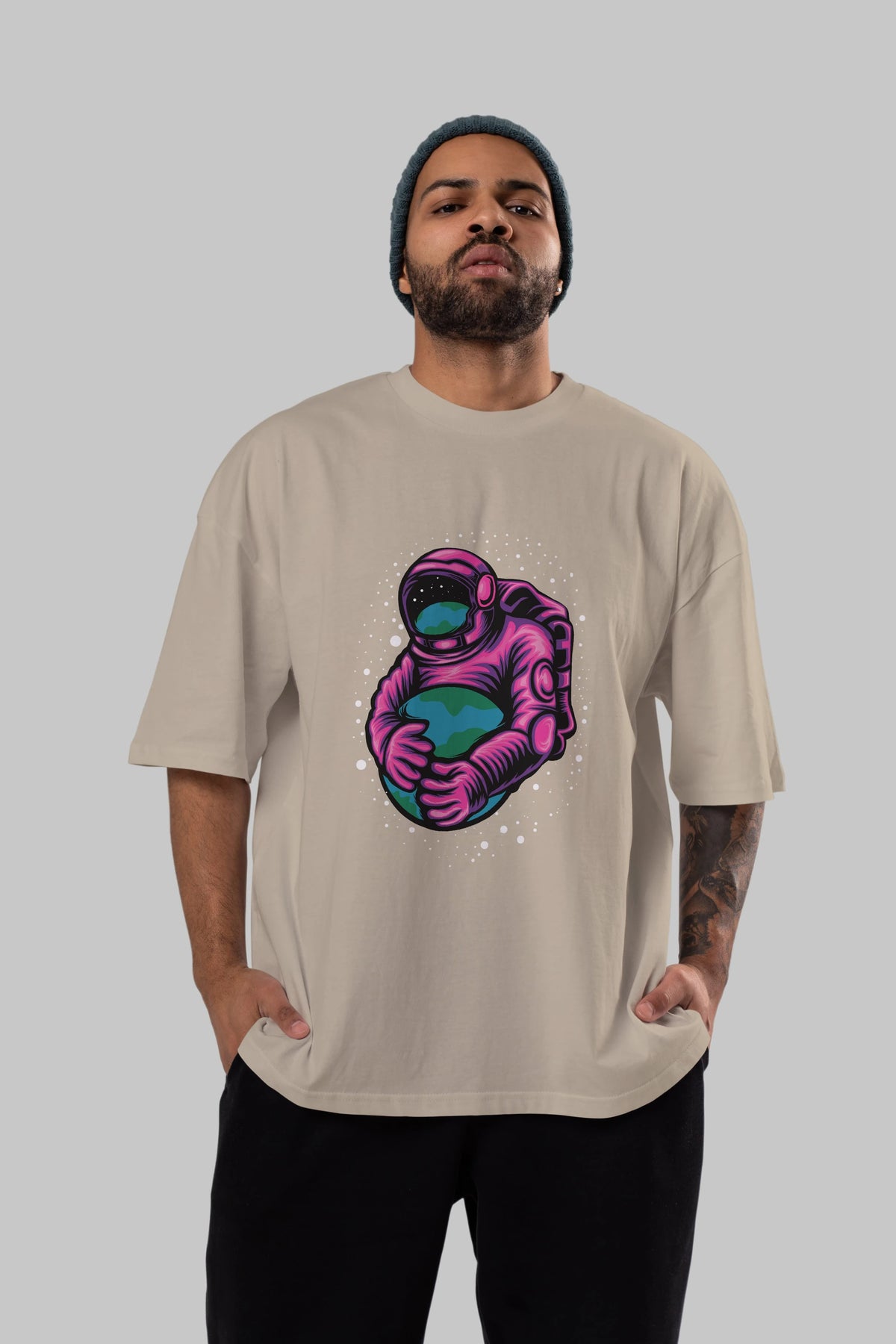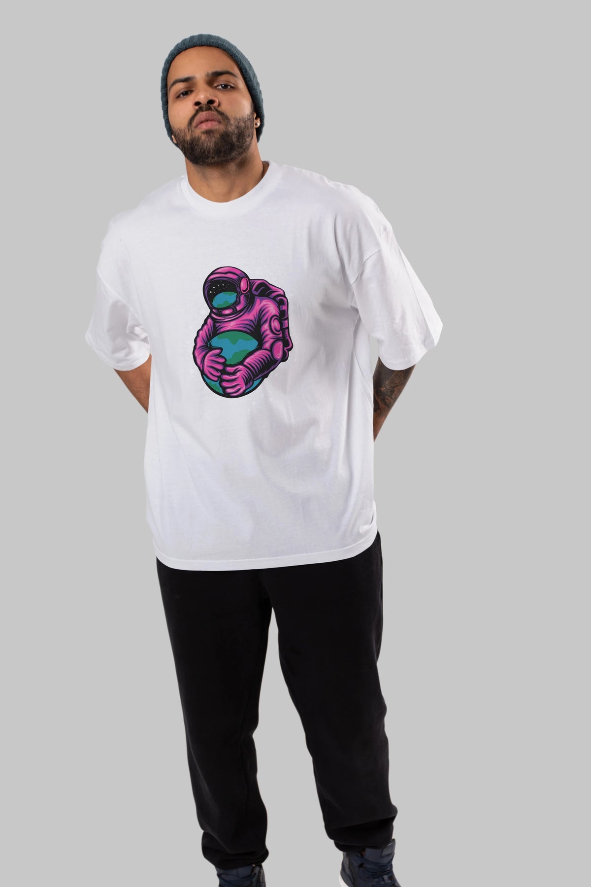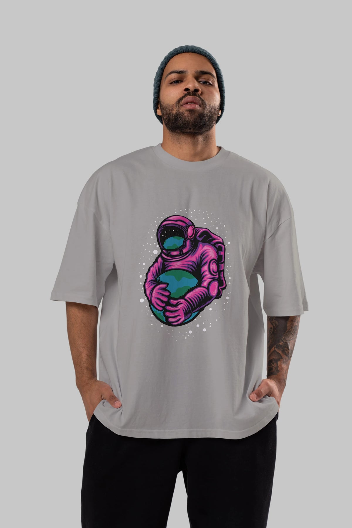 Astronaut Holding Up The Earth Ön Baskılı Oversize t-shirt Erkek Kadın Unisex