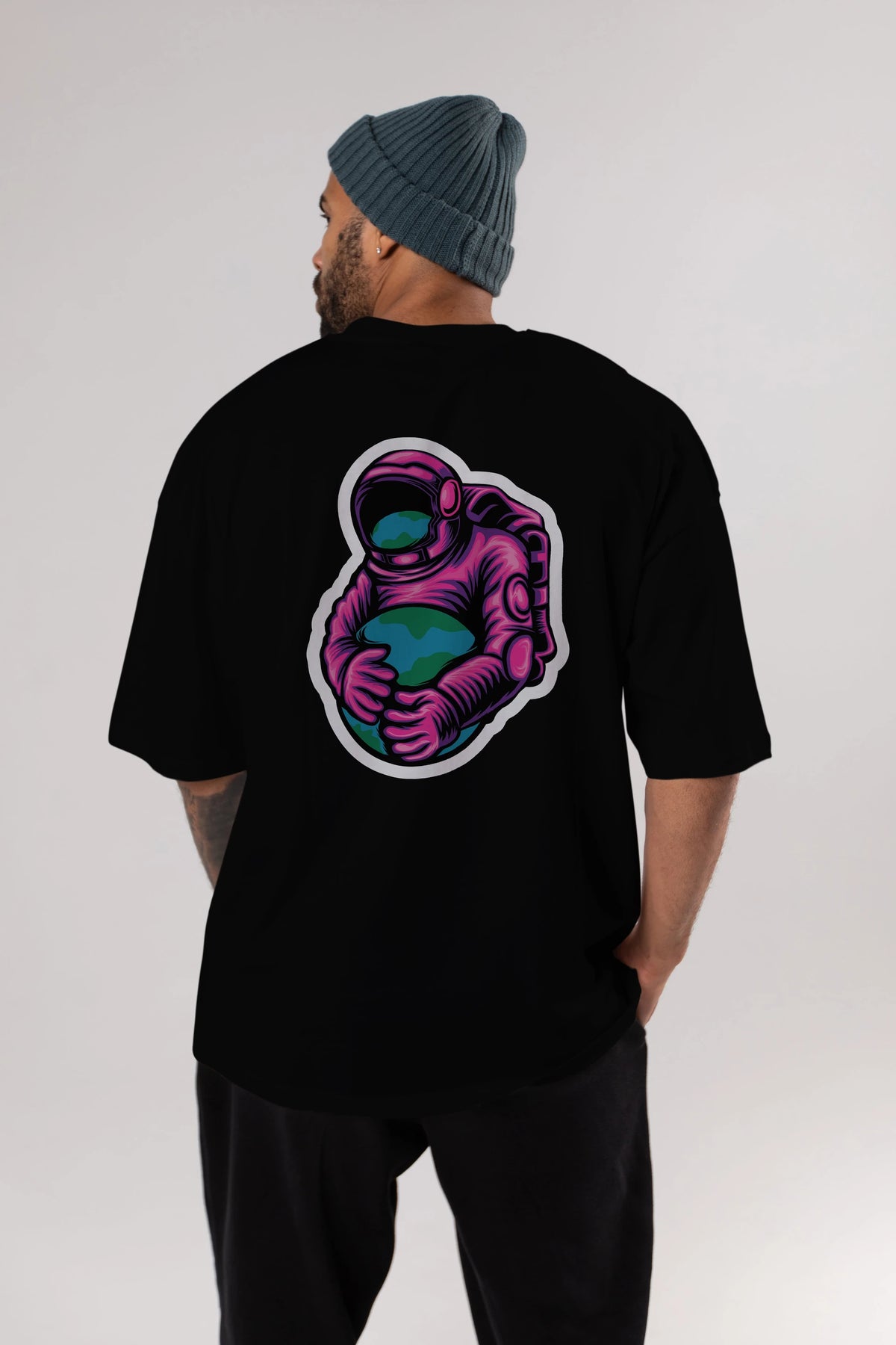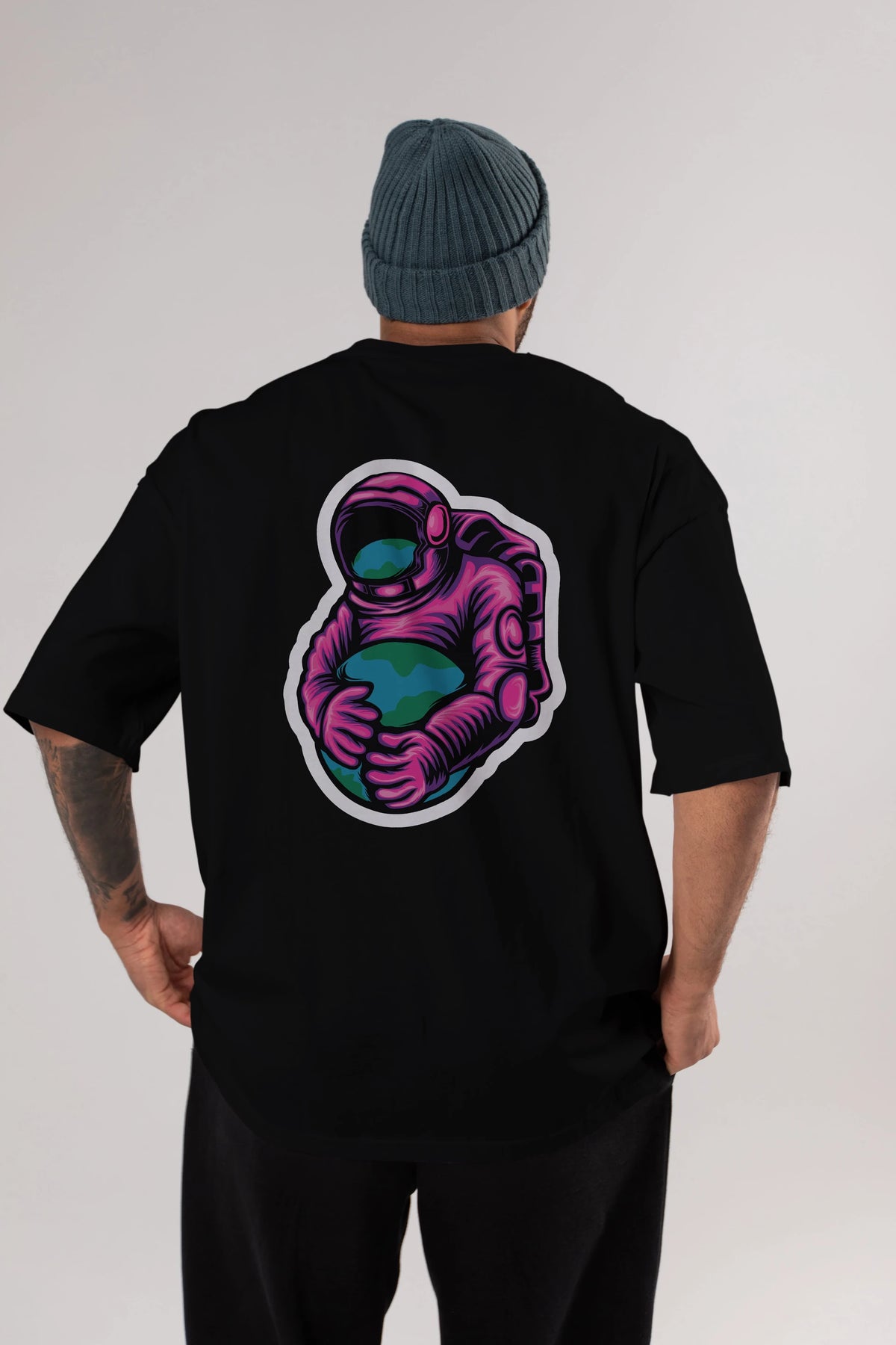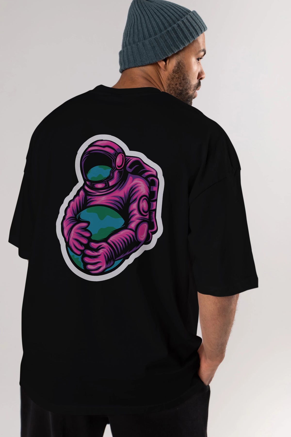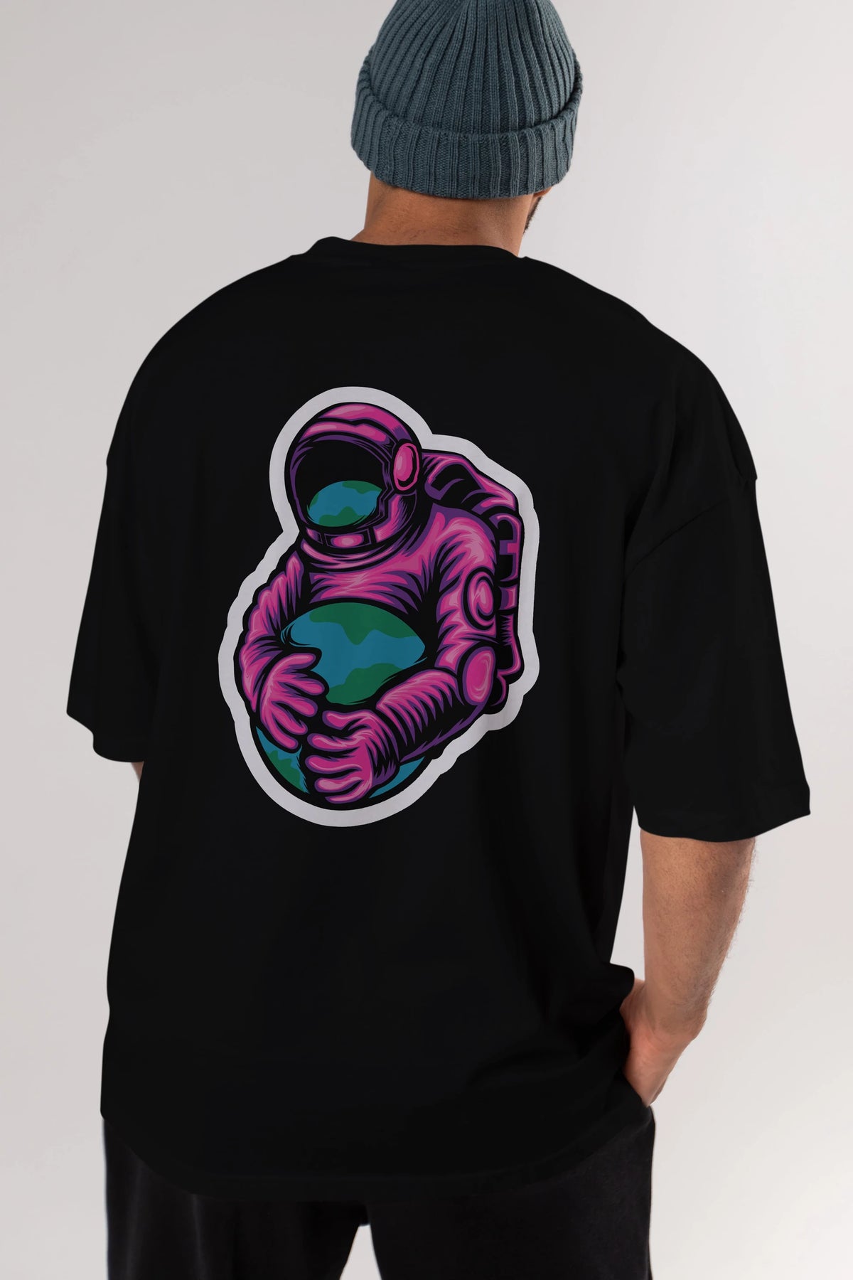 Astronaut Holding Up The Earth Sticker Arka Baskılı Oversize t-shirt Erkek Kadın Unisex