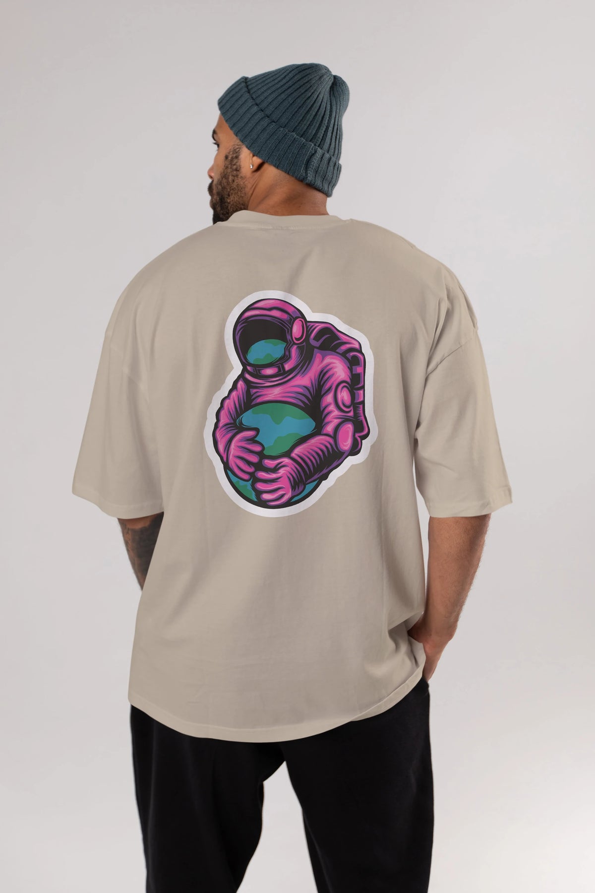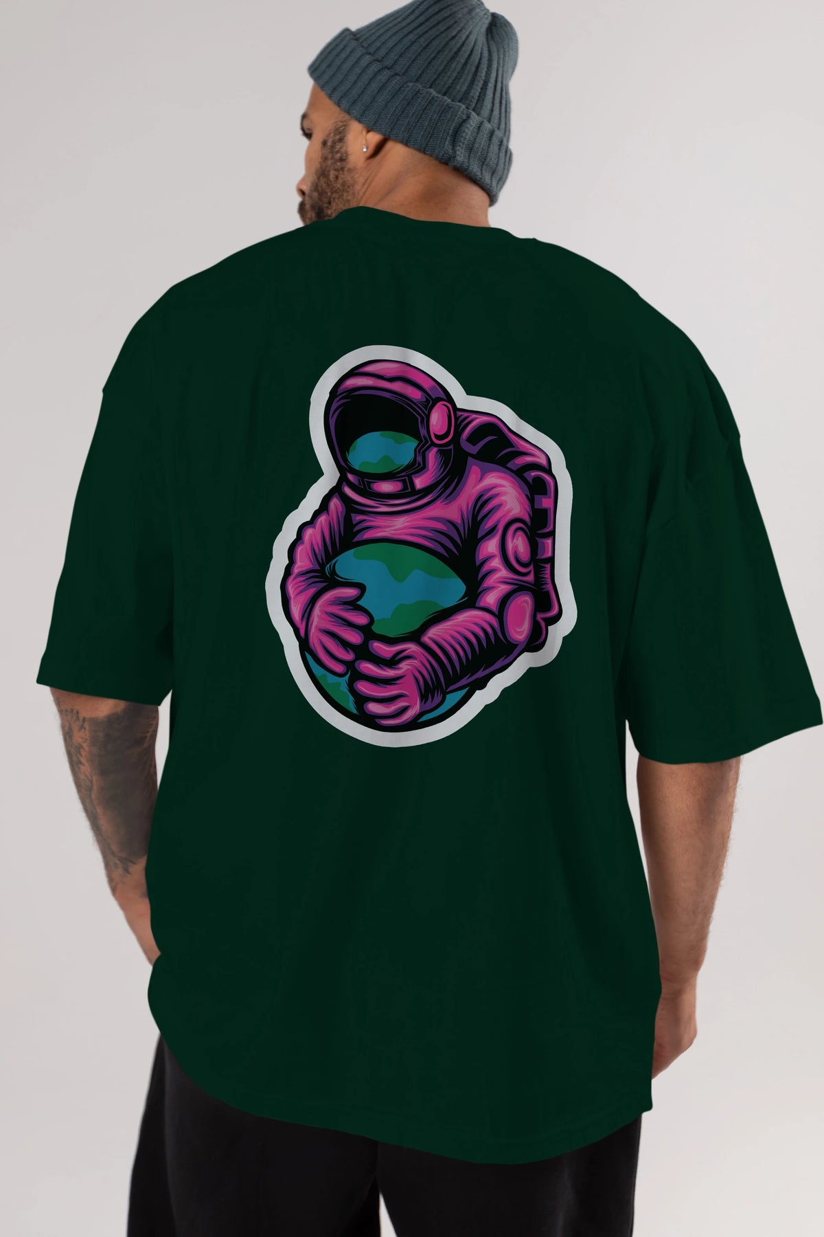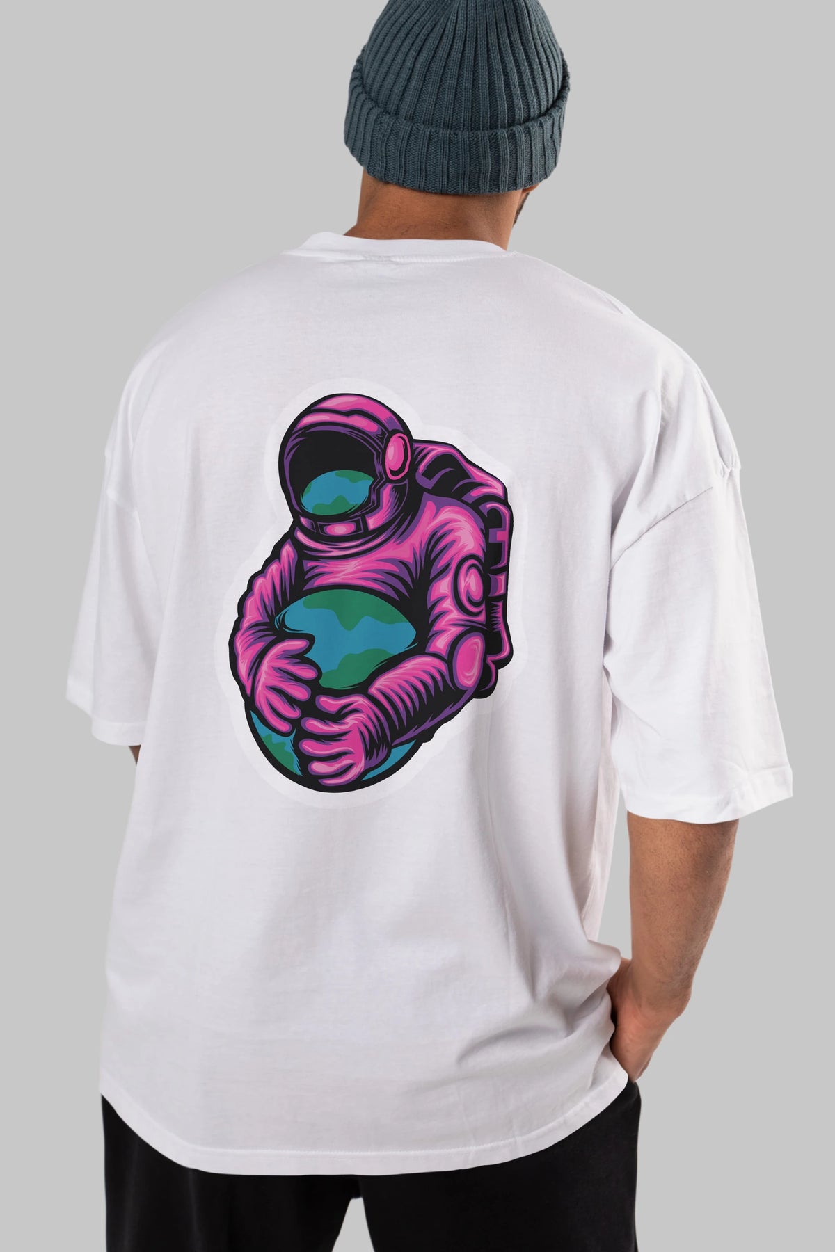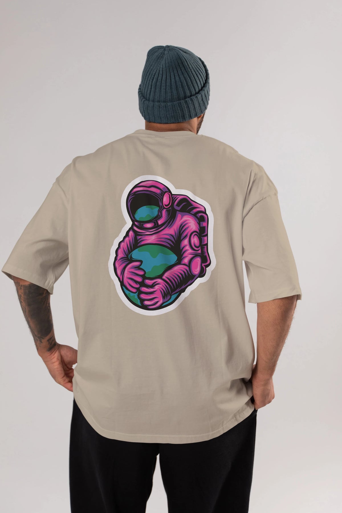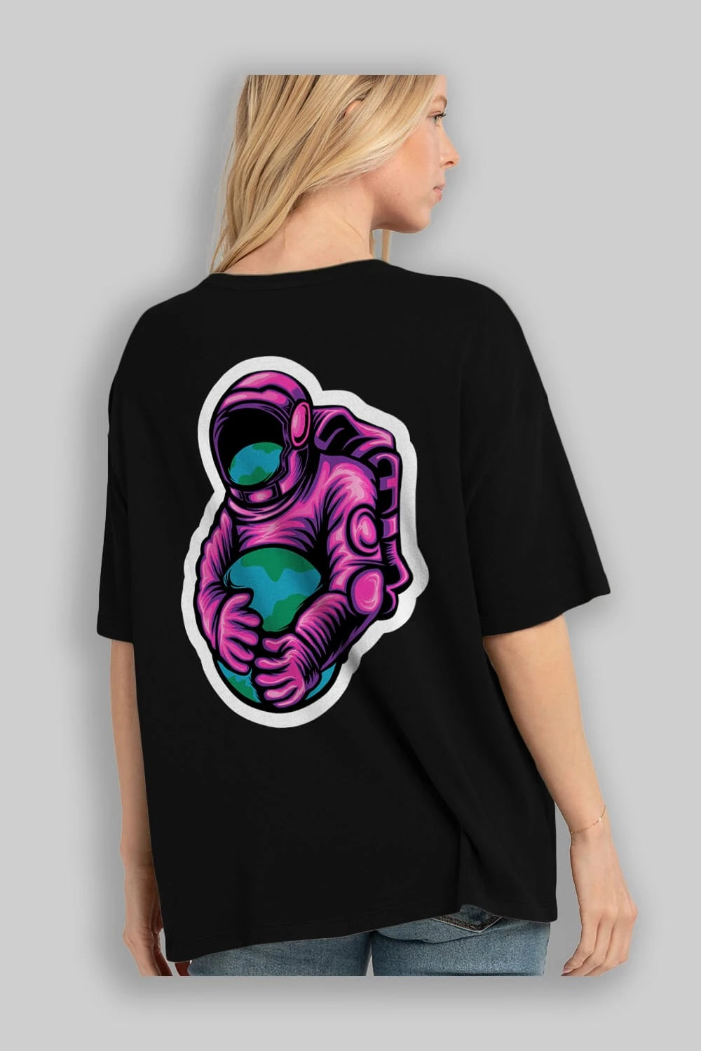 Astronaut Holding Up The Earth Sticker Arka Baskılı Oversize t-shirt Erkek Kadın Unisex