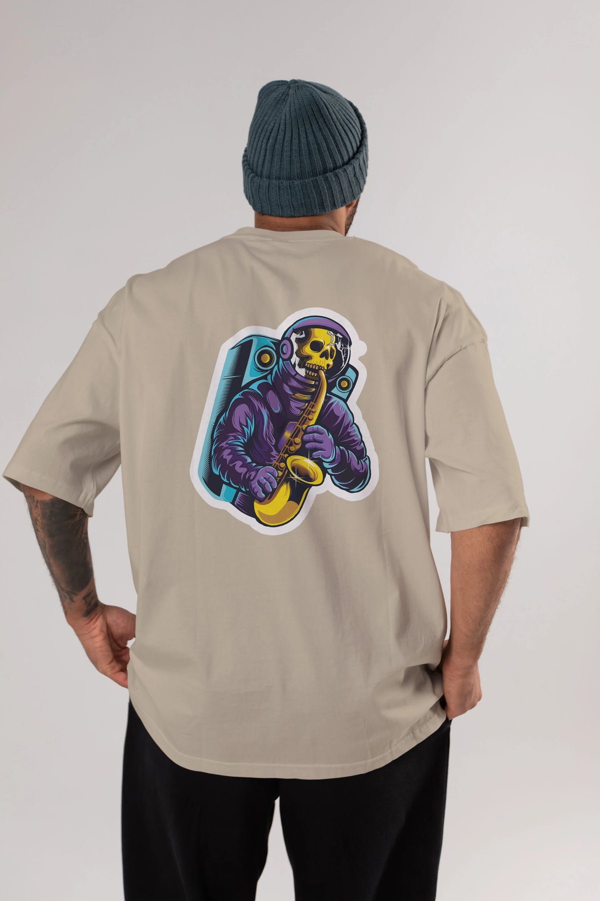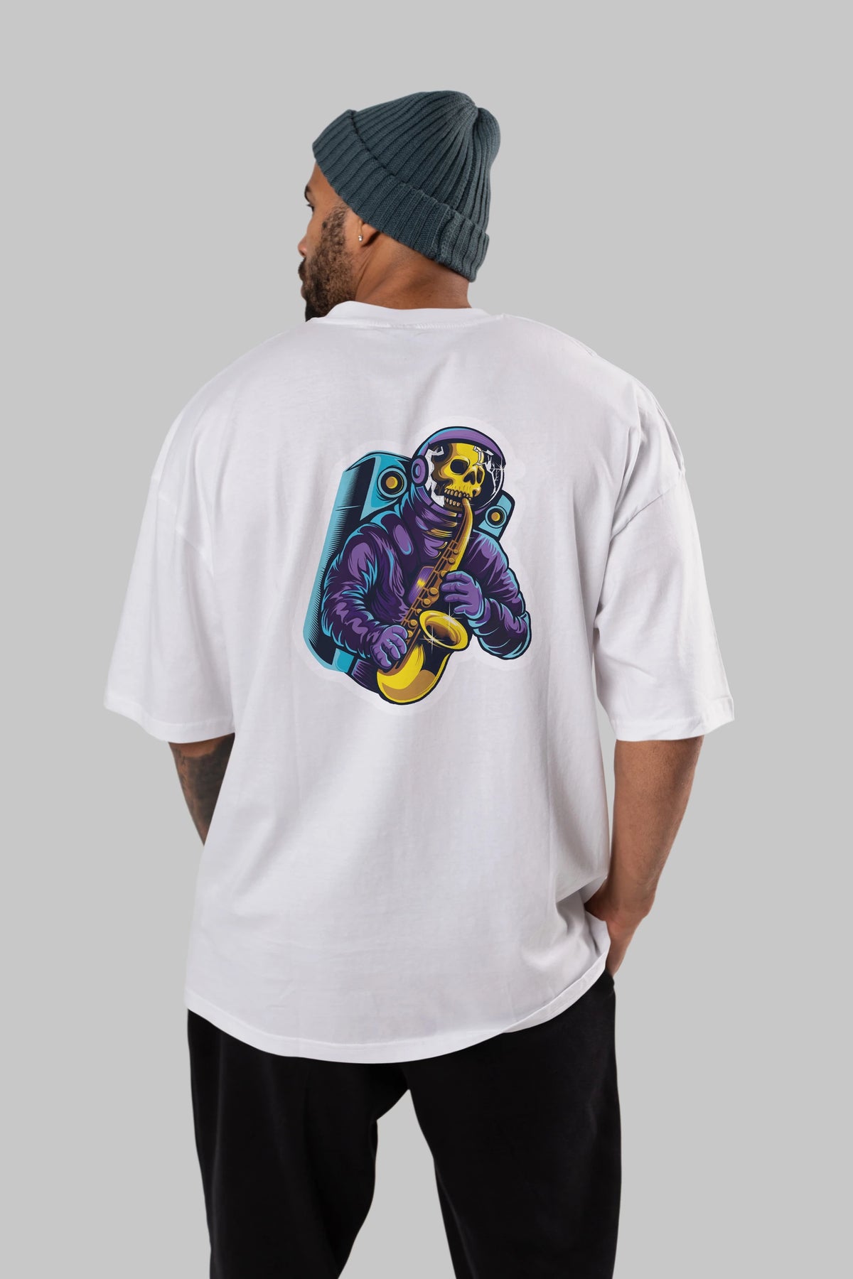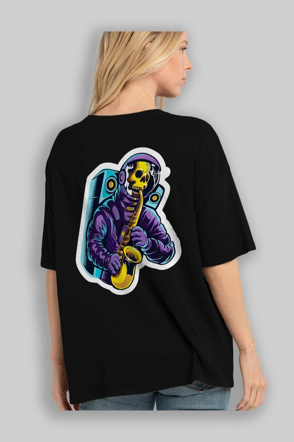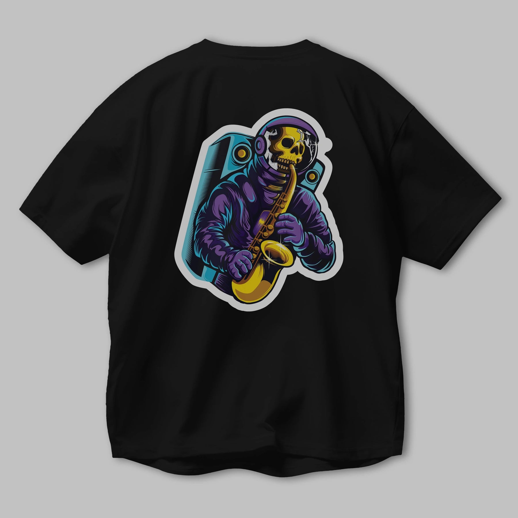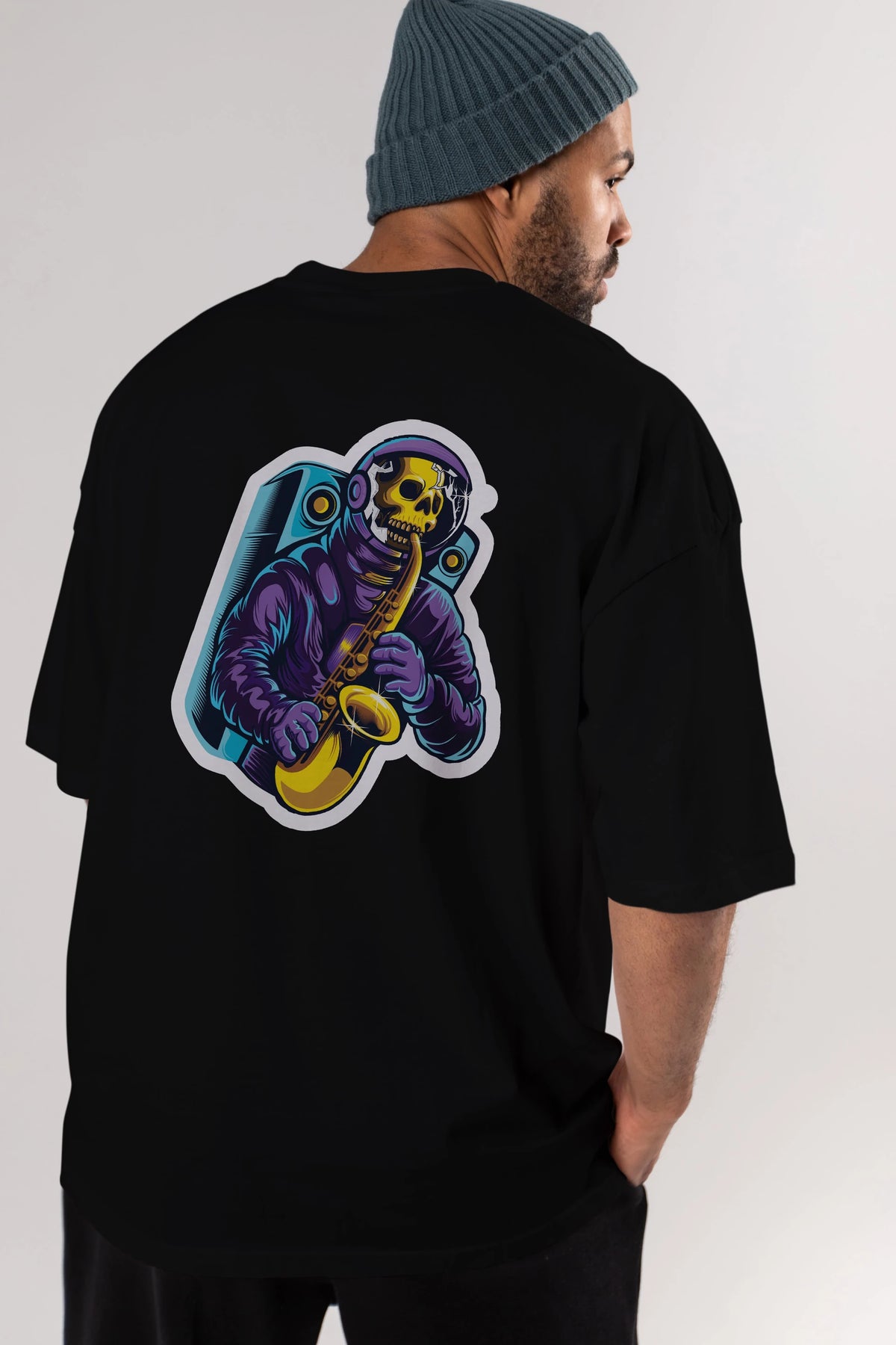 Astroskull Saxophonist Sticker Arka Baskılı Oversize t-shirt Erkek Kadın Unisex