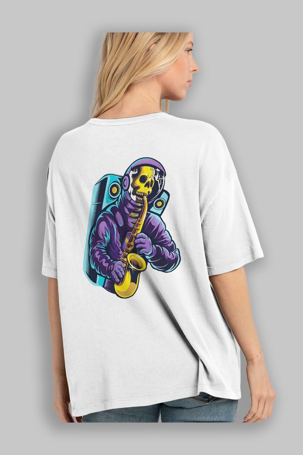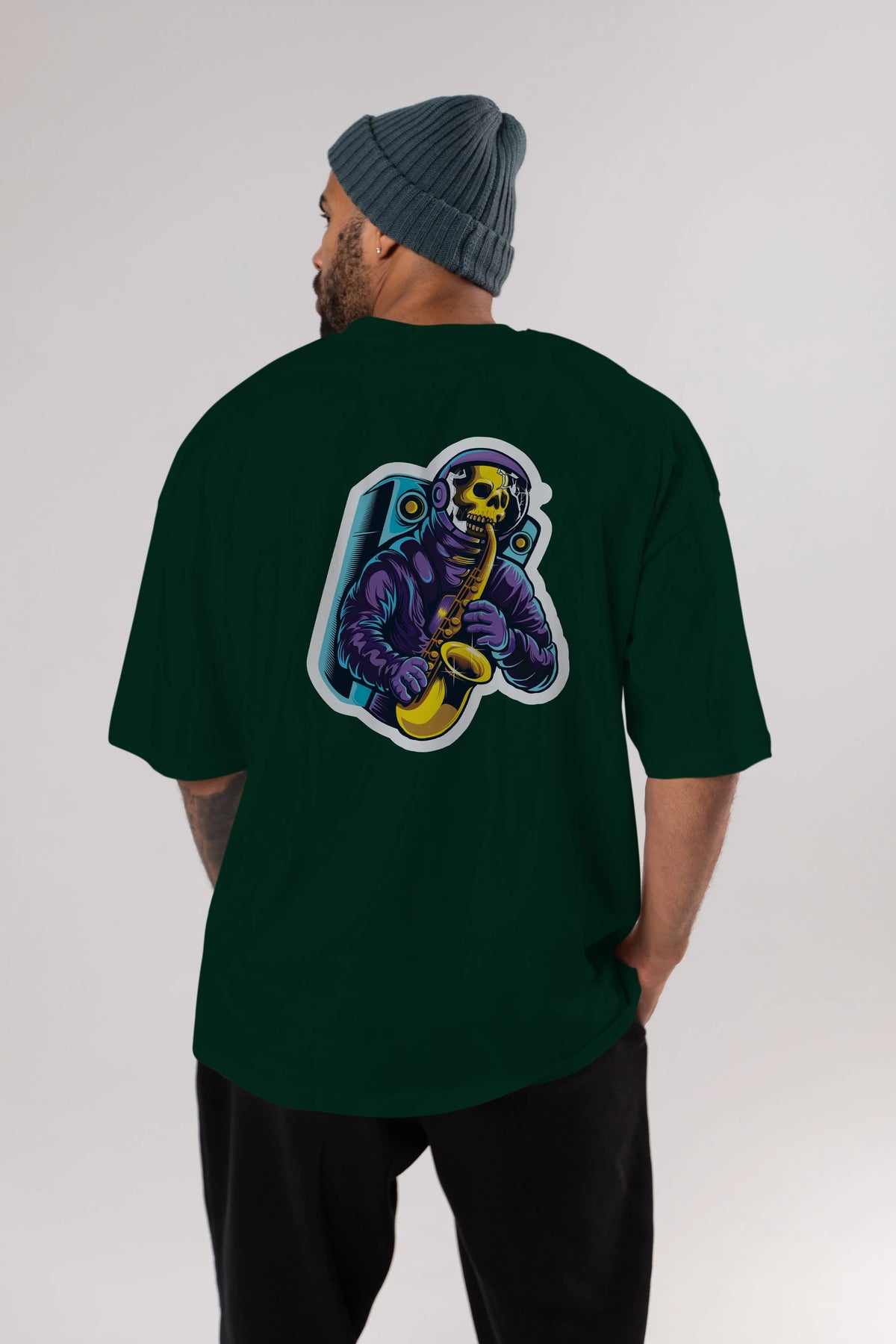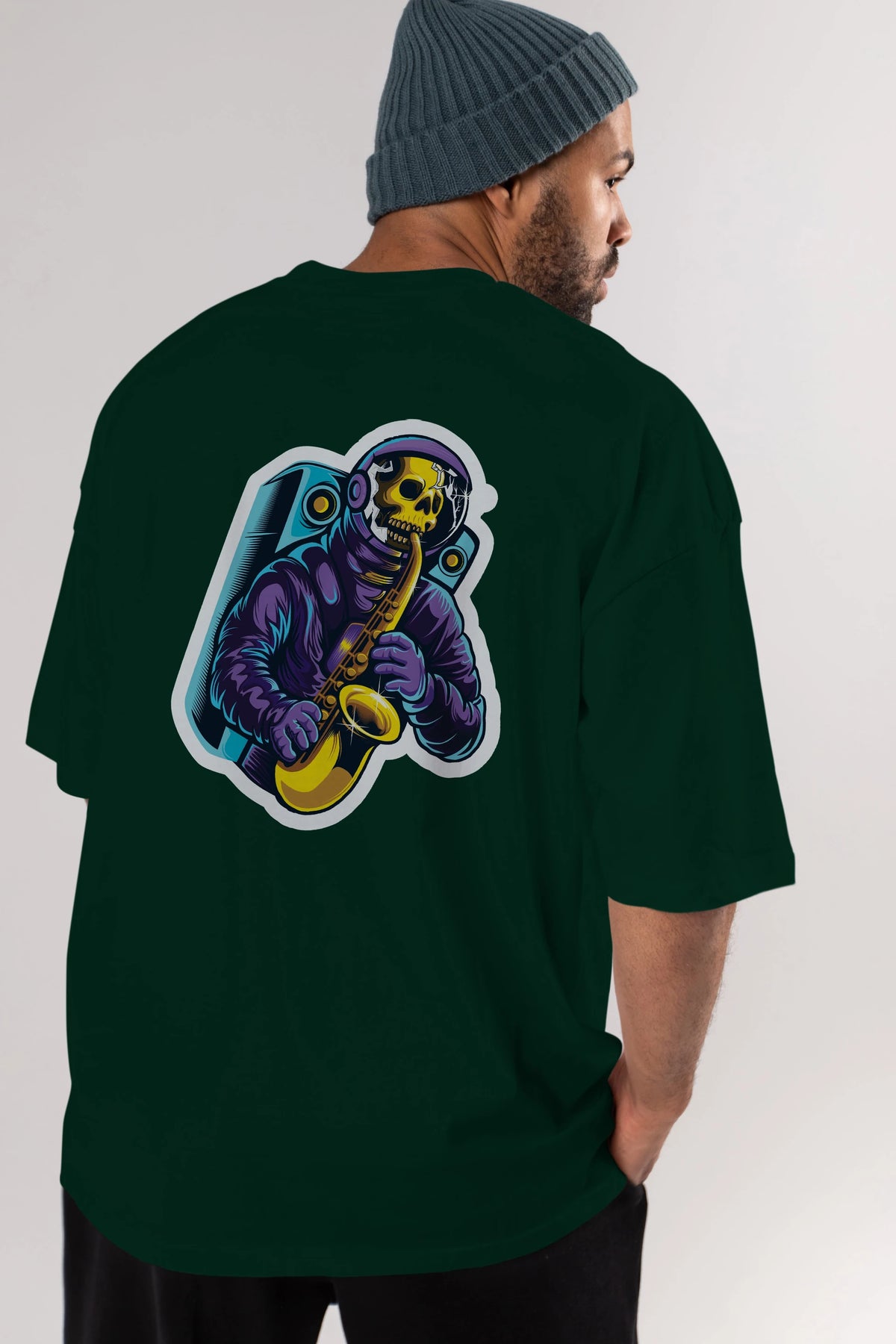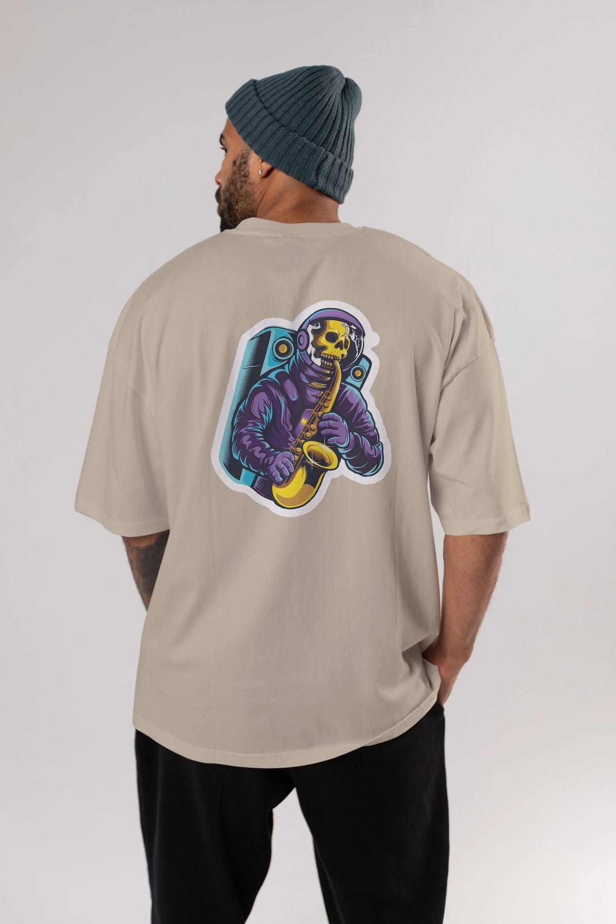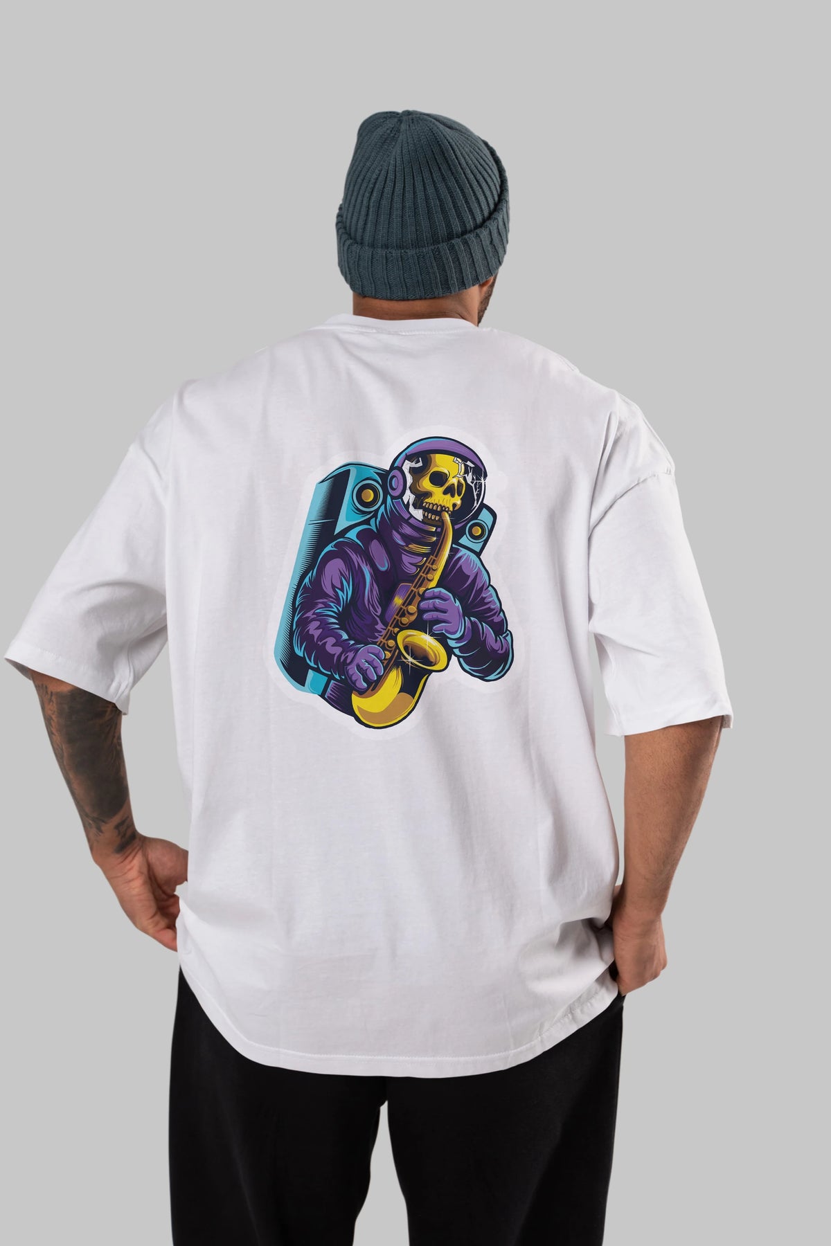 Astroskull Saxophonist Sticker Arka Baskılı Oversize t-shirt Erkek Kadın Unisex