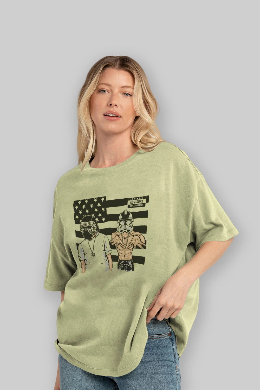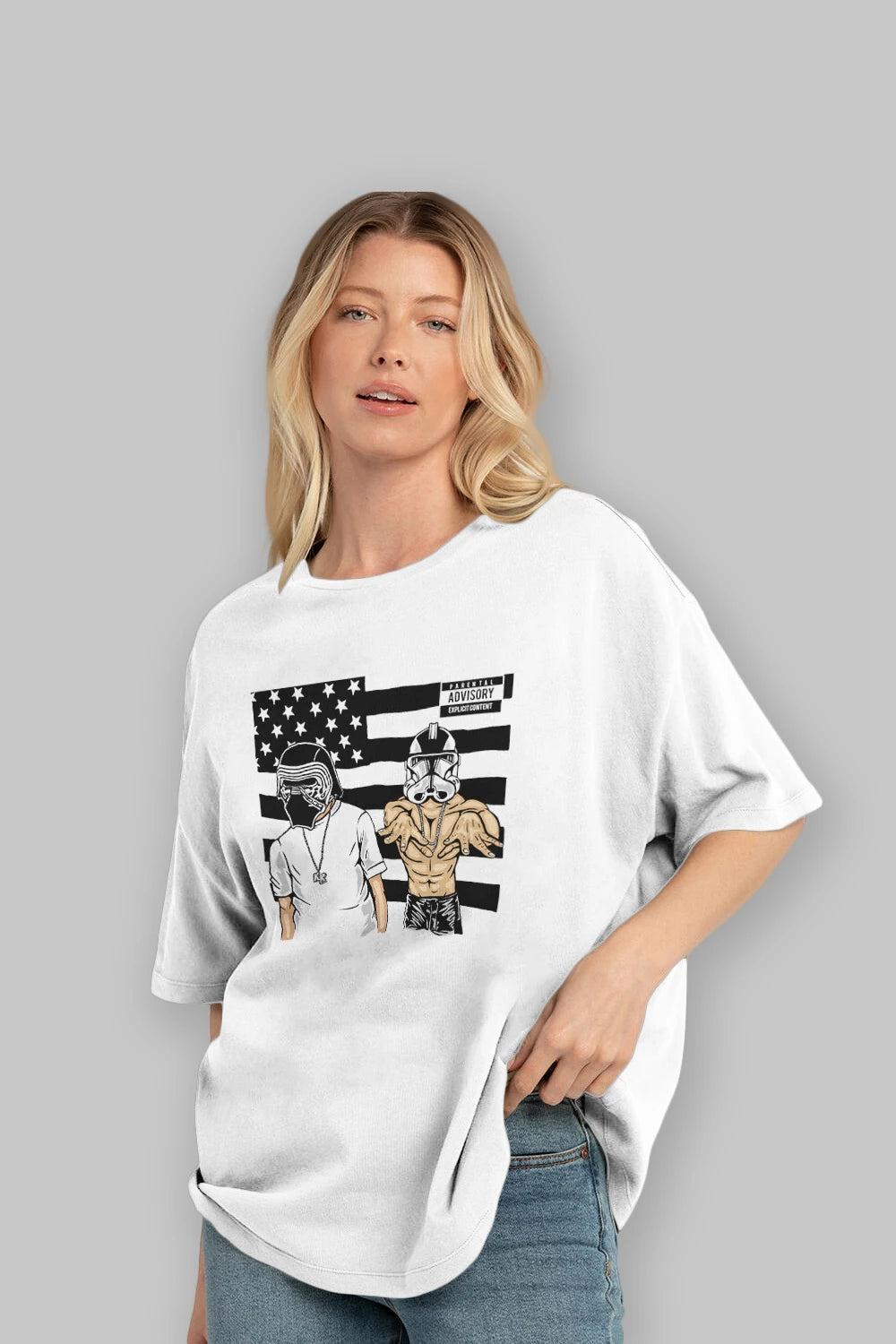 Hem erkekler hem de kadınlar için uygun, taze, modern bir baskıya sahip baskılı oversize t-shirt.
