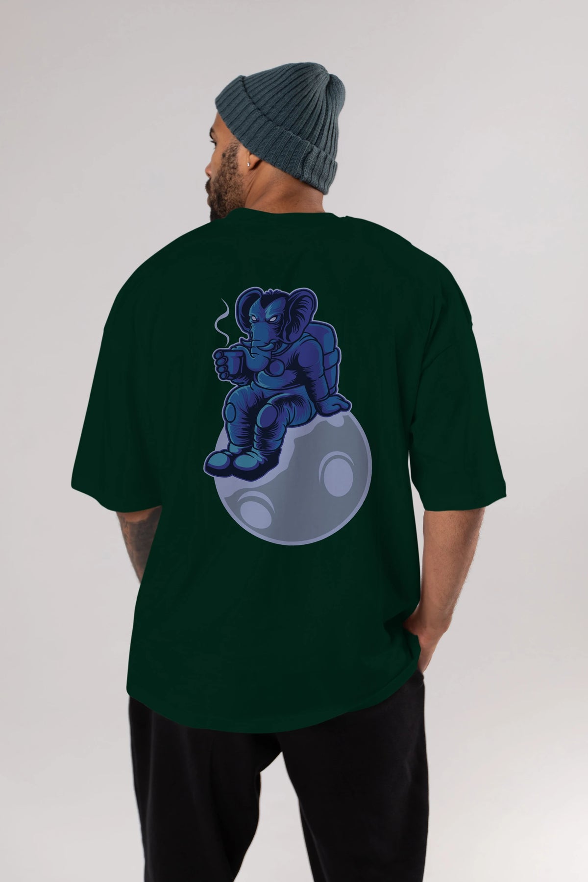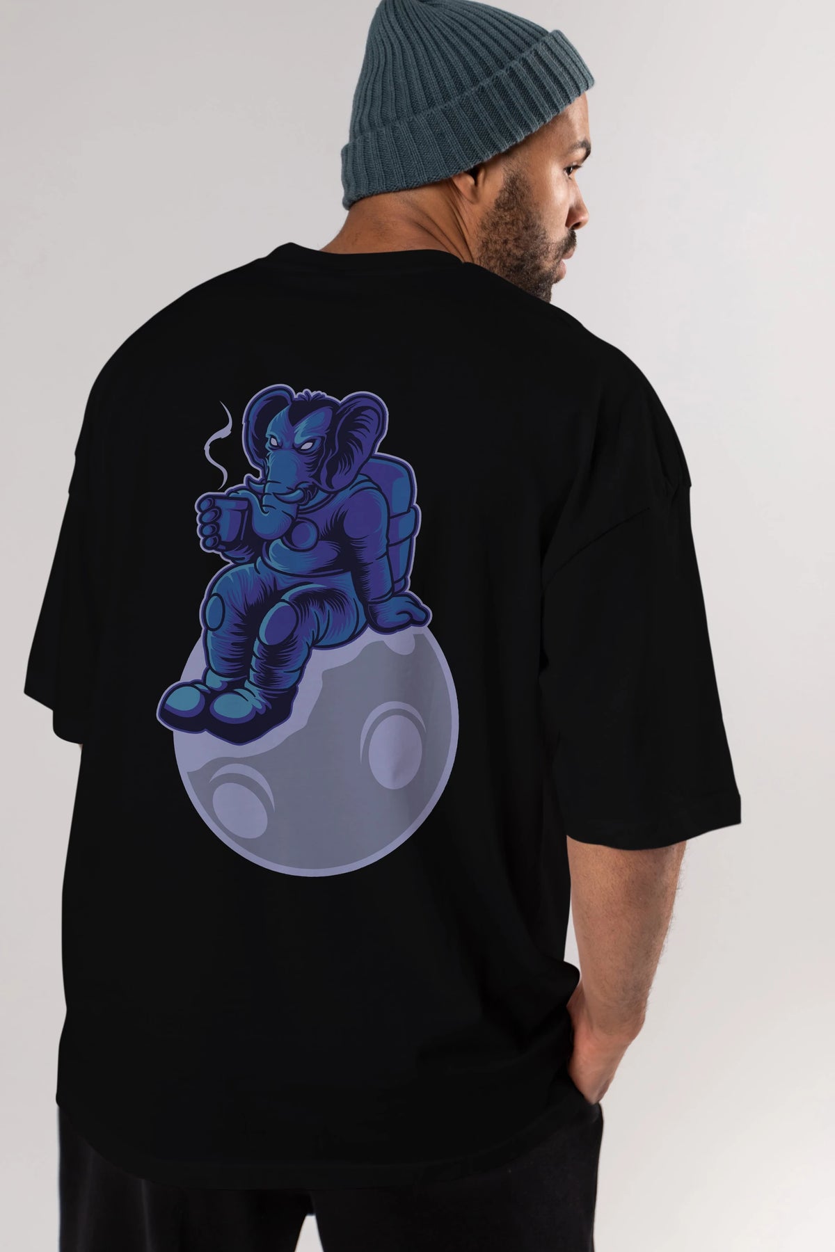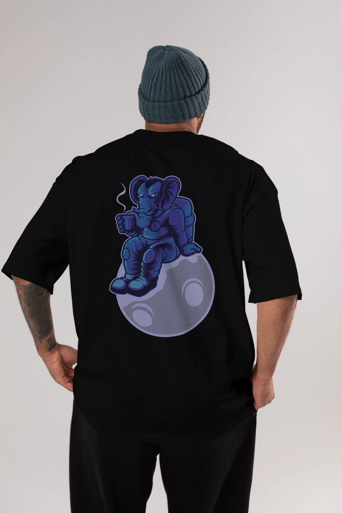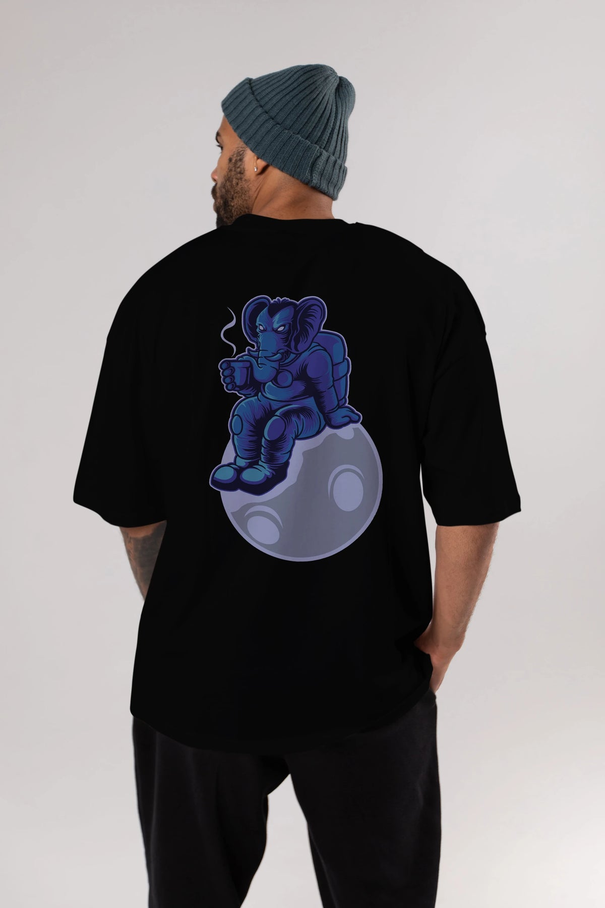 Space Elephant Drink Coffee Arka Baskılı Oversize t-shirt Erkek Kadın Unisex
