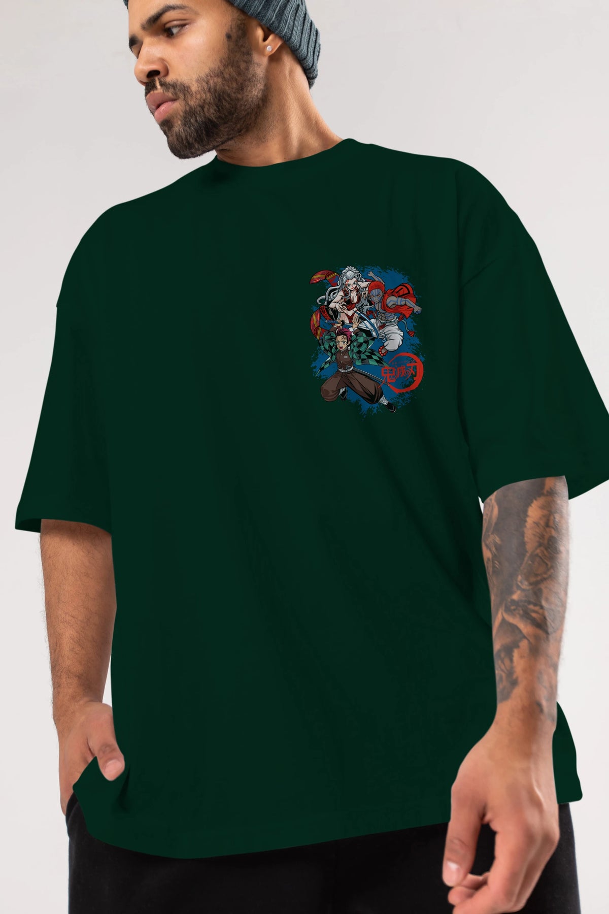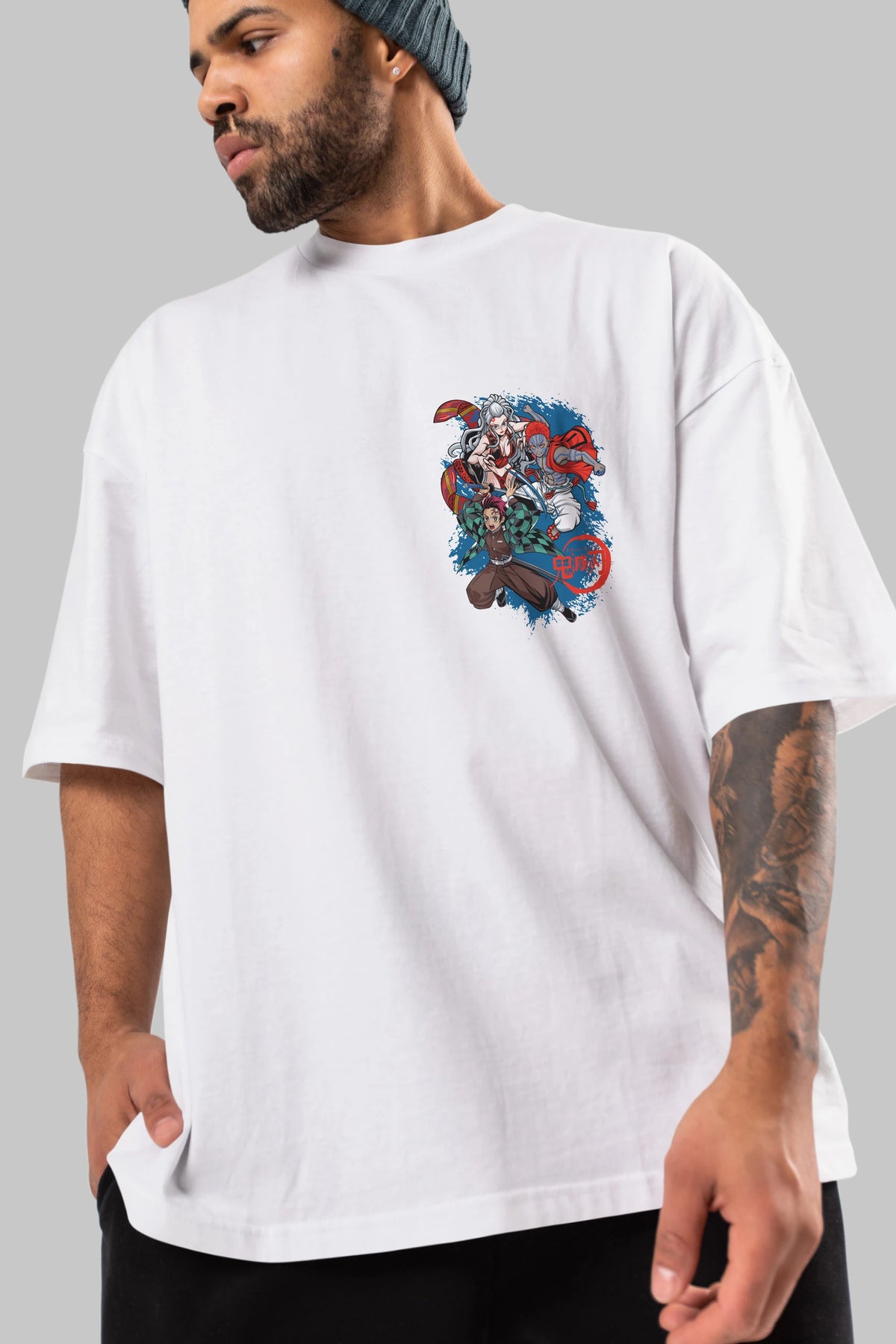 TANJIRO ,AKAZA,DAKI Ön Sol Baskılı Oversize t-shirt Erkek Kadın Unisex %100 Pamuk Bisiklet Yaka tişort