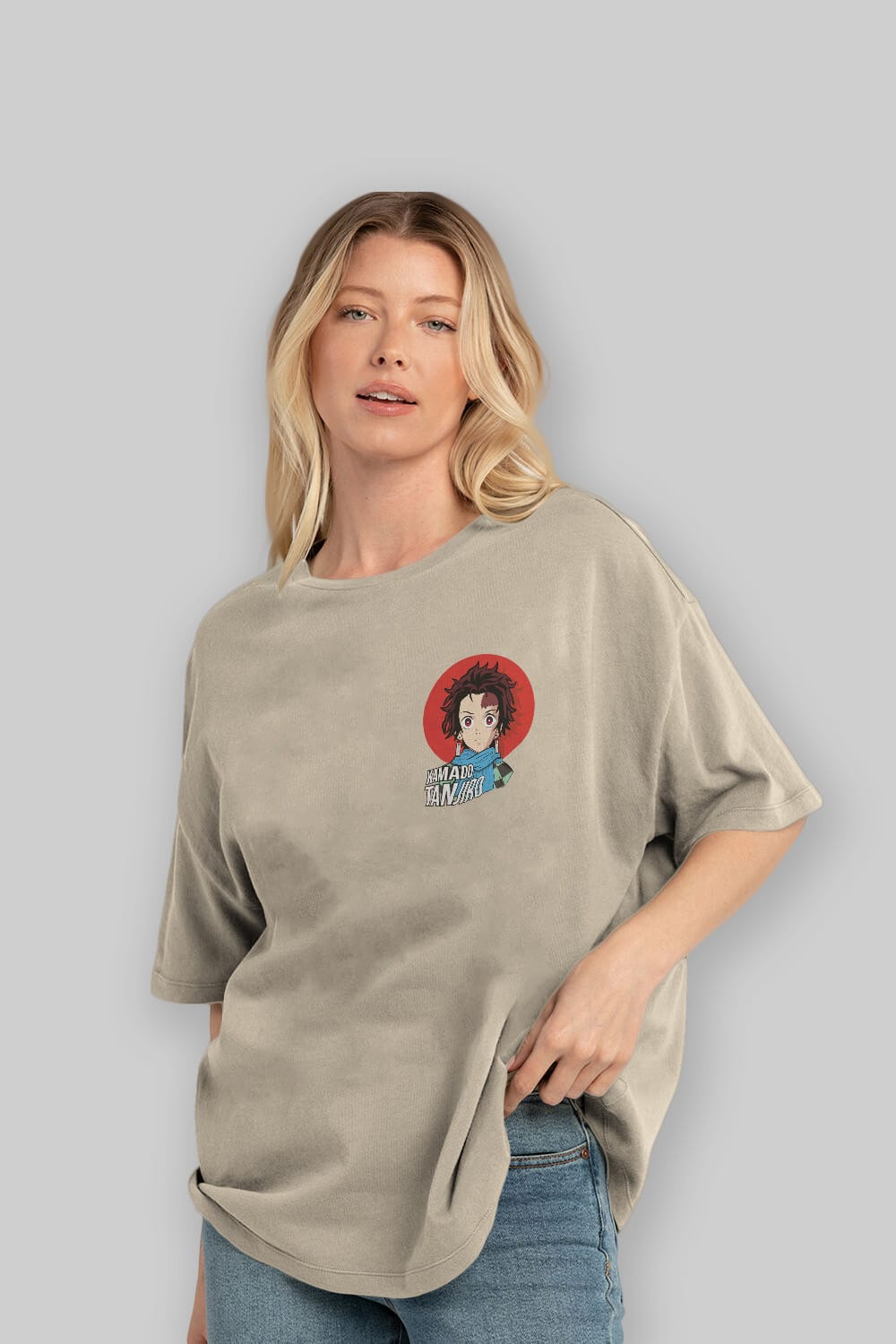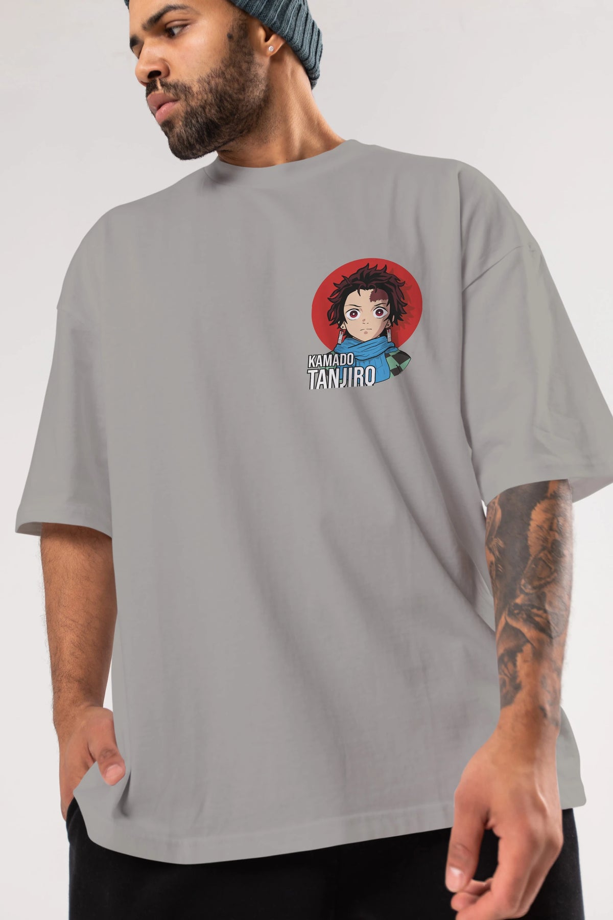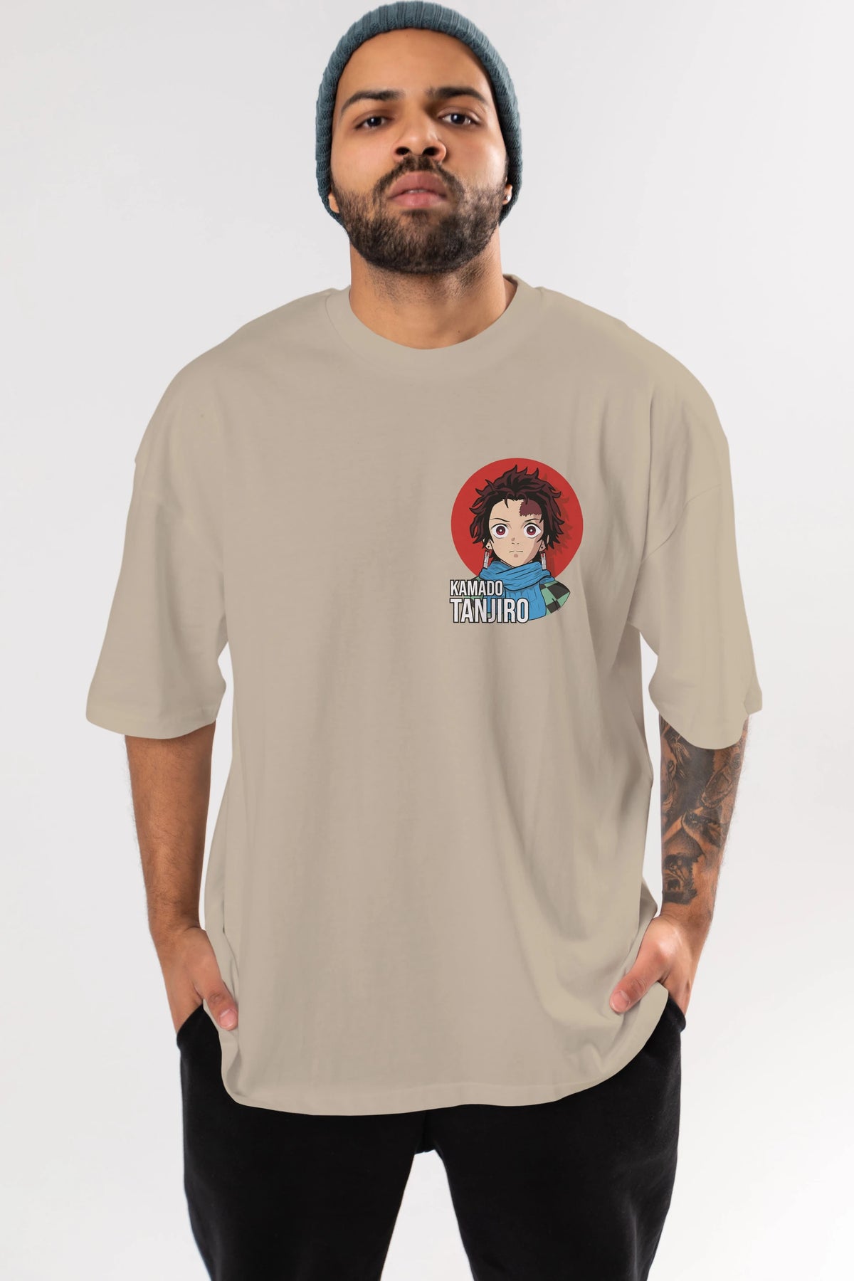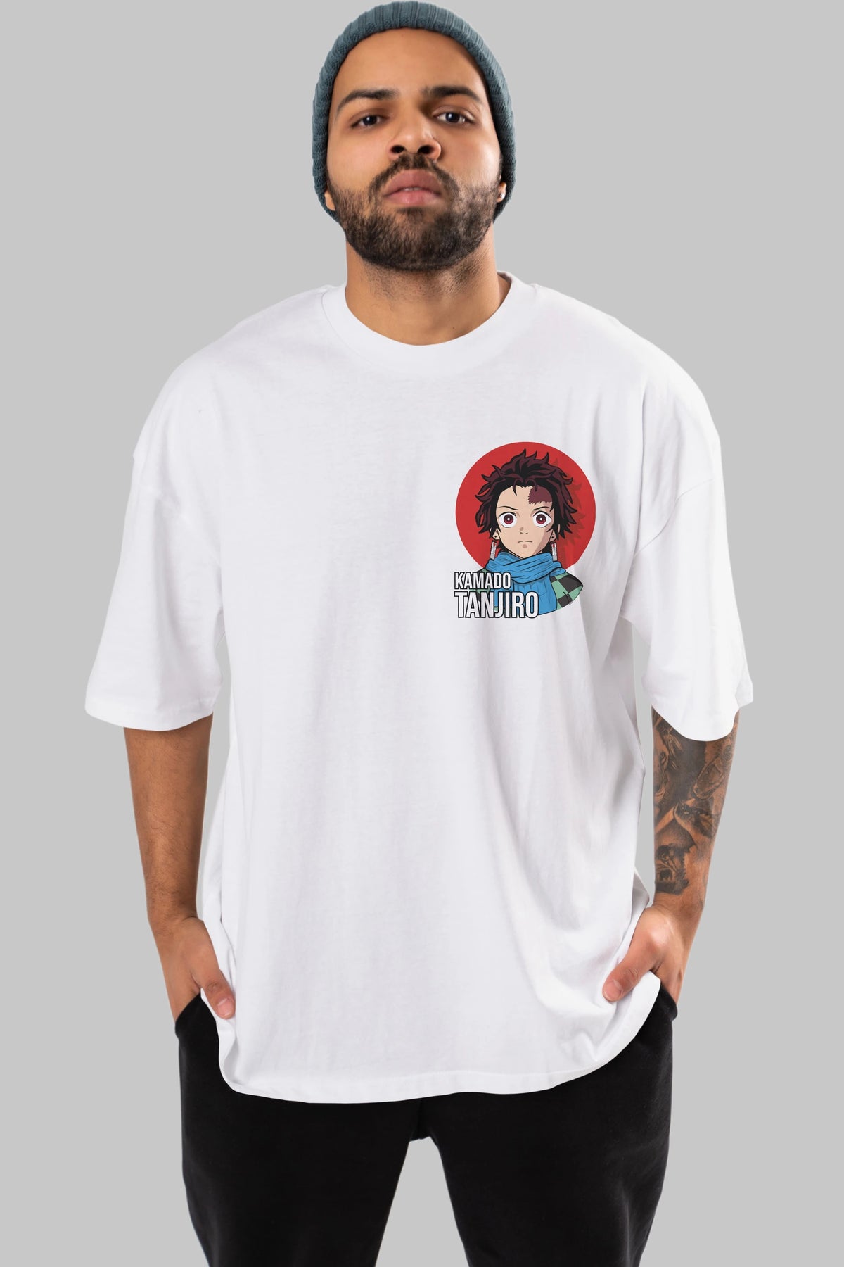 TANJIRO KAMADO Ön Sol Baskılı Oversize t-shirt Erkek Kadın Unisex %100 Pamuk Bisiklet Yaka tişort