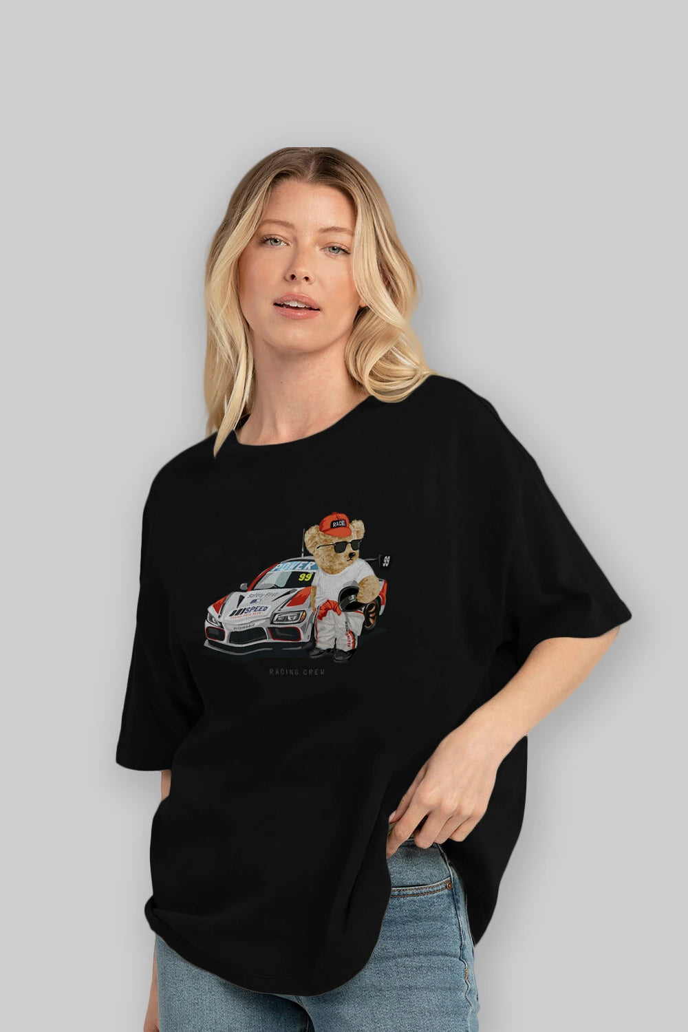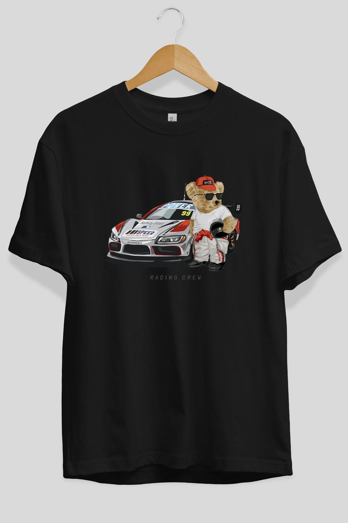 Teddy Bear Racing Crew Ön Baskılı Oversize t-shirt Erkek Kadın Unisex %100 Pamuk
