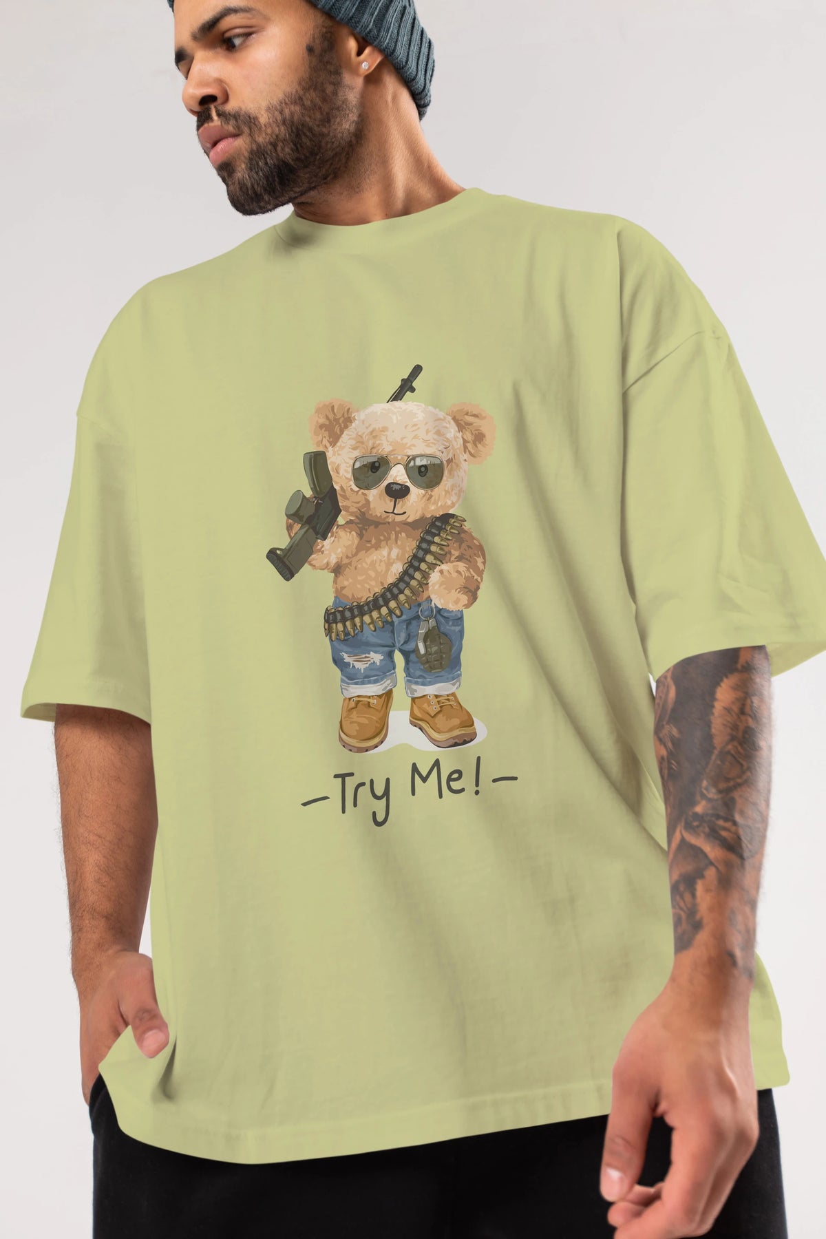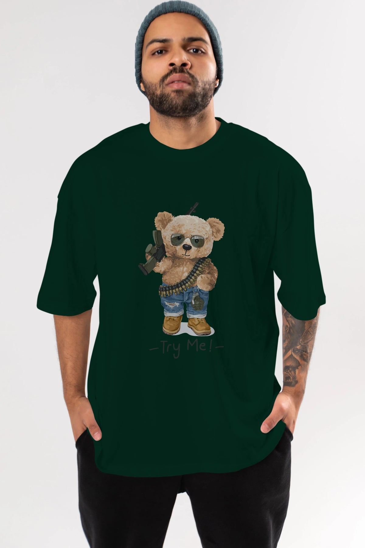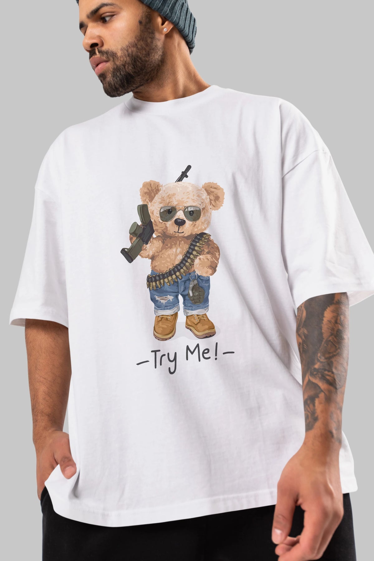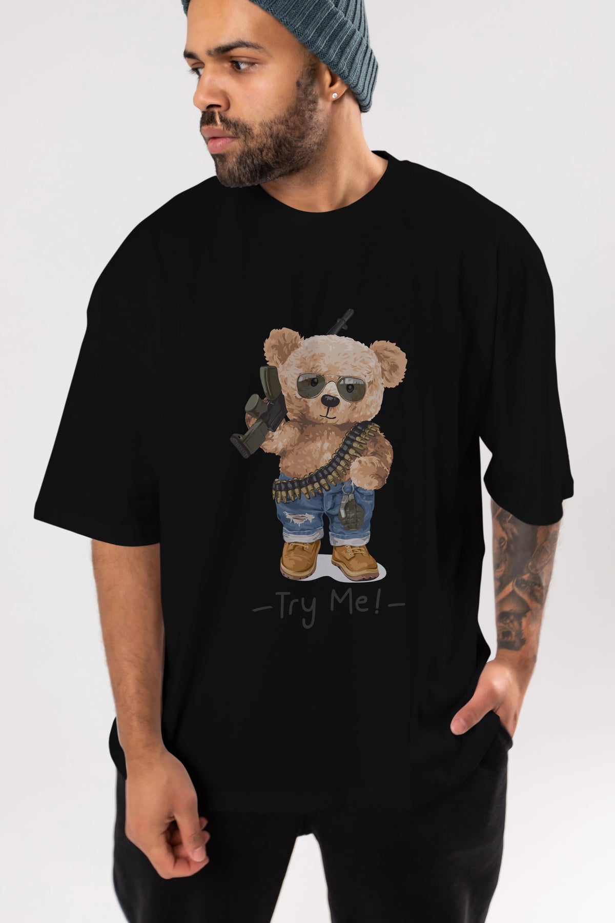 Teddy Bear Try Me Ön Baskılı Oversize t-shirt Erkek Kadın Unisex %100 Pamuk