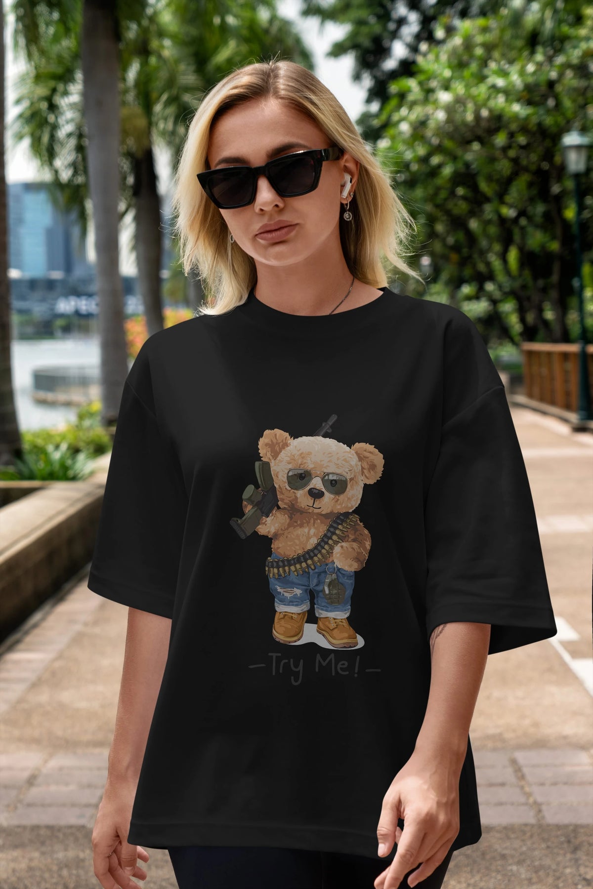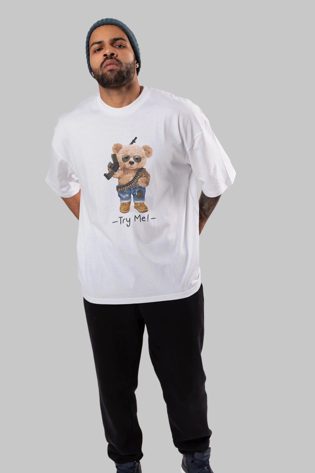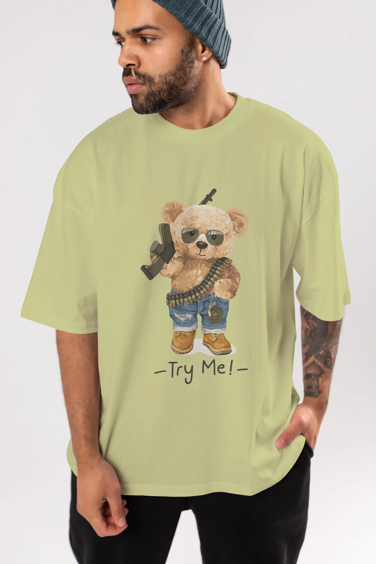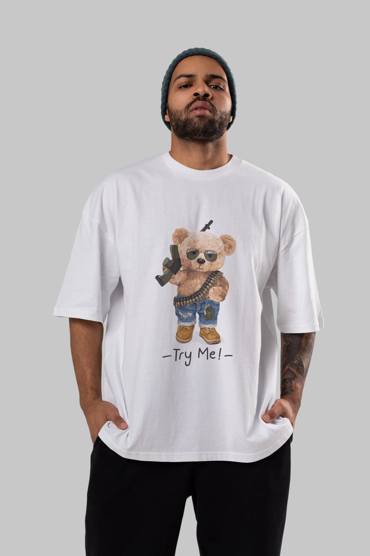 Teddy Bear Try Me Ön Baskılı Oversize t-shirt Erkek Kadın Unisex %100 Pamuk