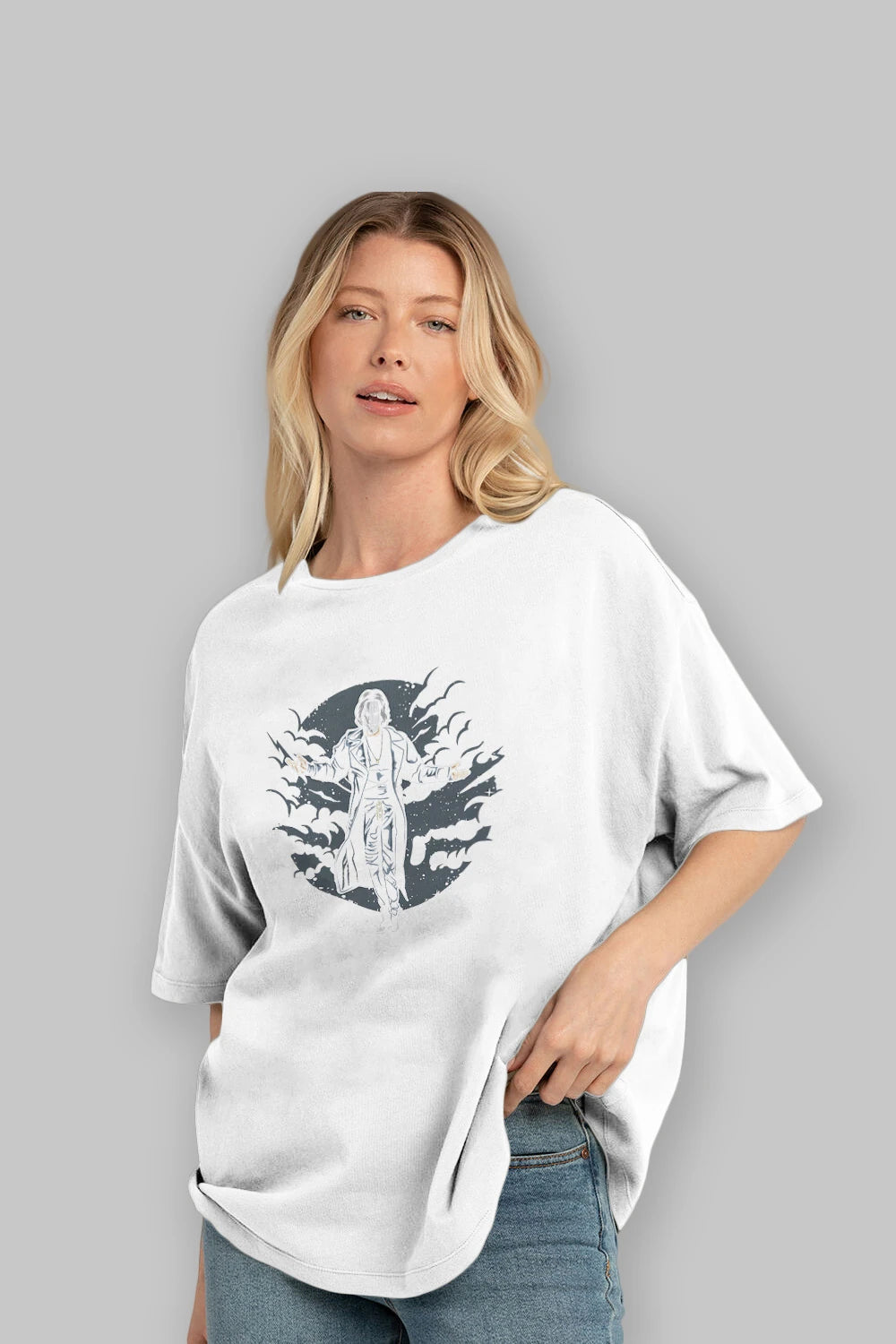 Hem erkekler hem de kadınlar için uygun, taze, modern bir baskıya sahip baskılı oversize t-shirt.