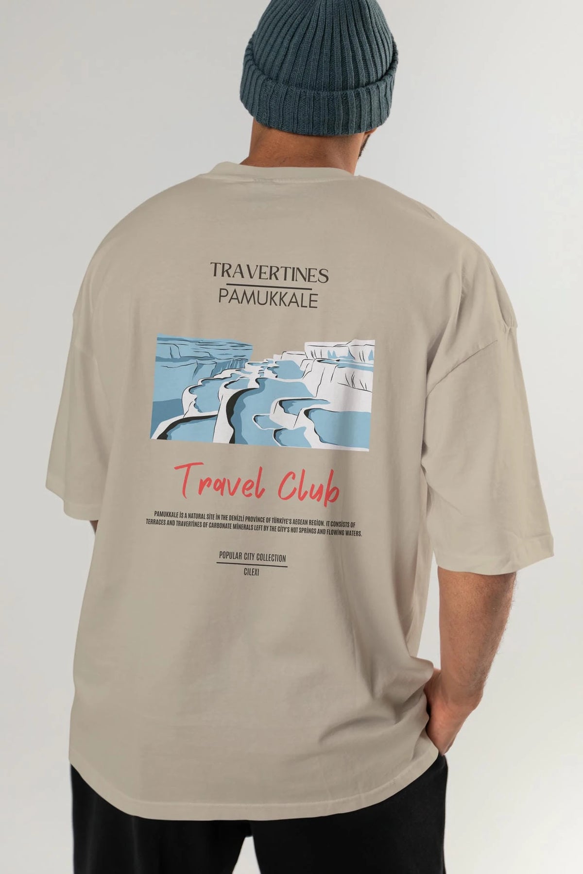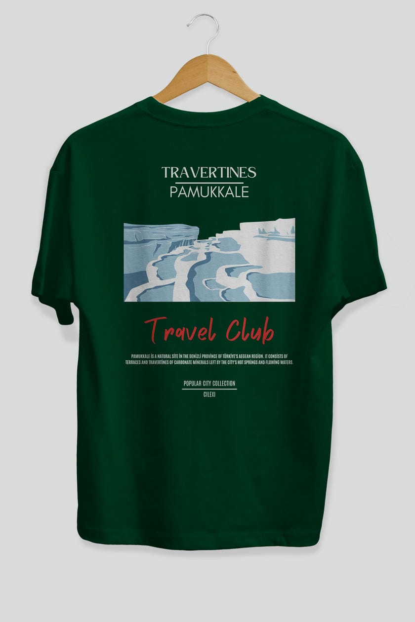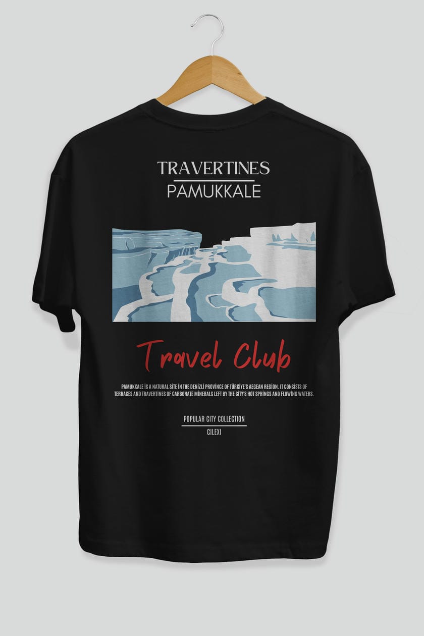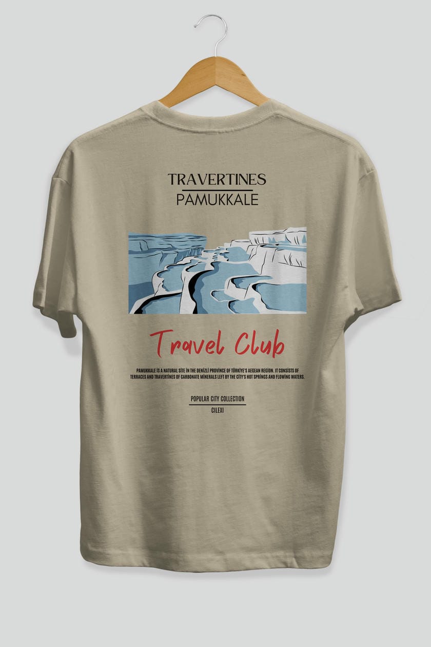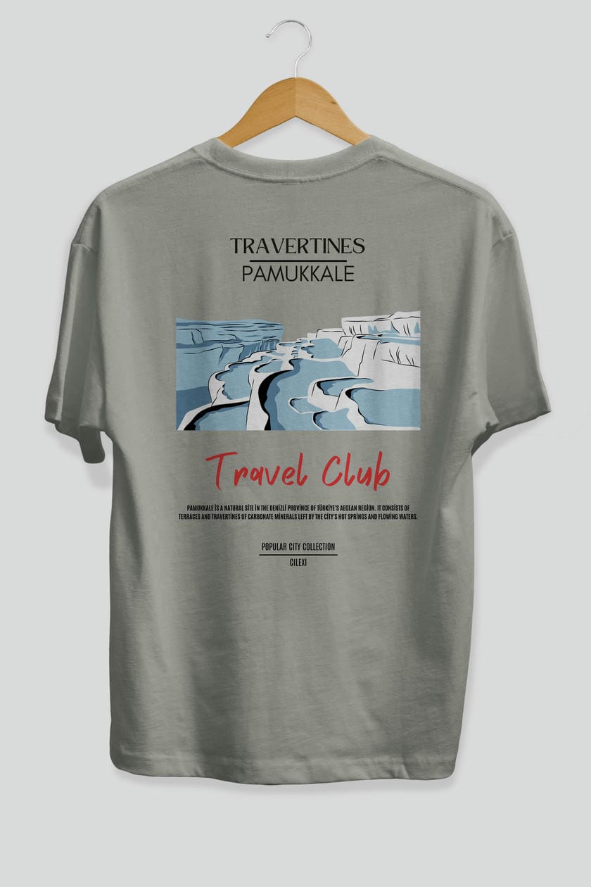 Travertines Pamukkale Arka Baskılı Oversize t-shirt Erkek Kadın Pamuk Bisiklet Yaka tişort