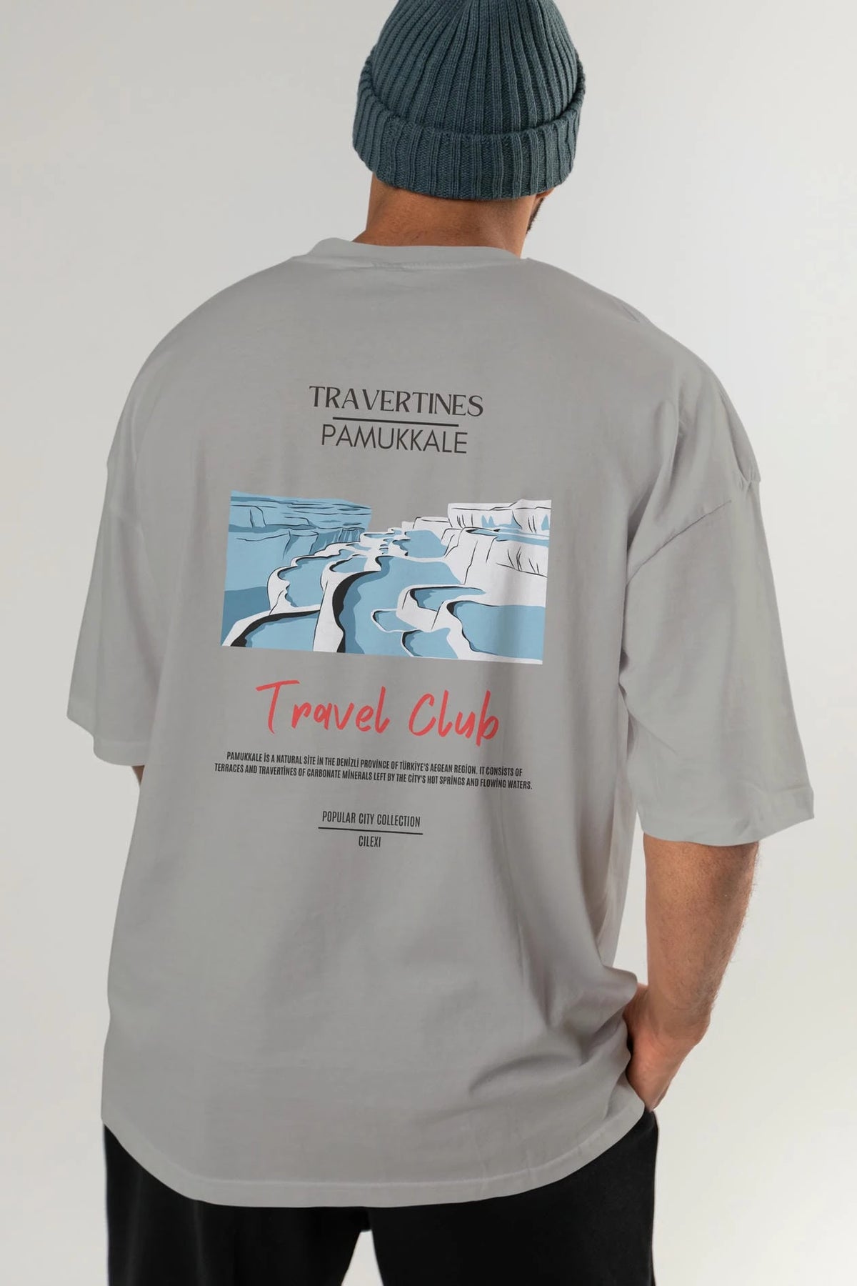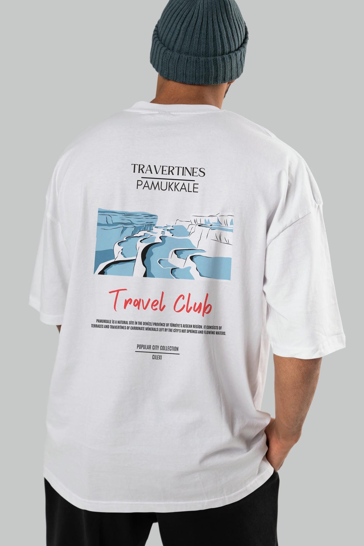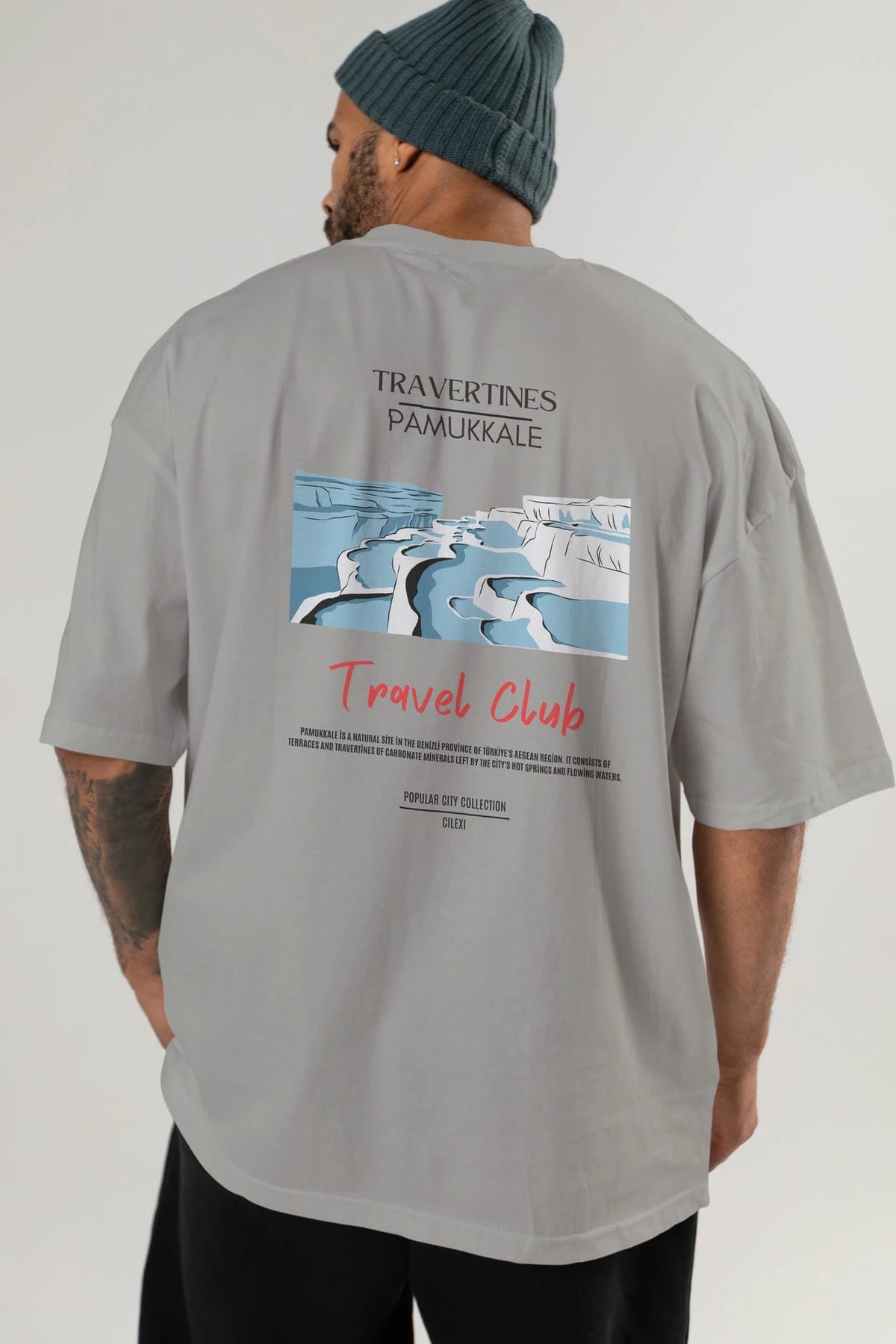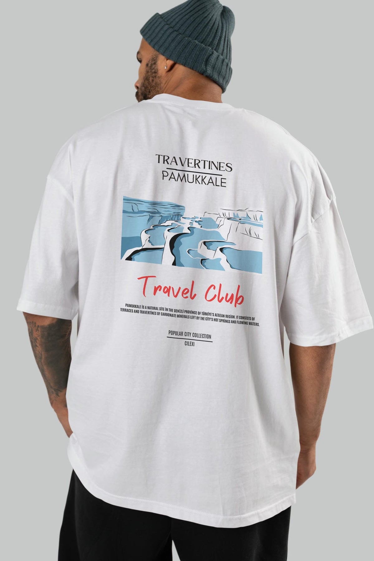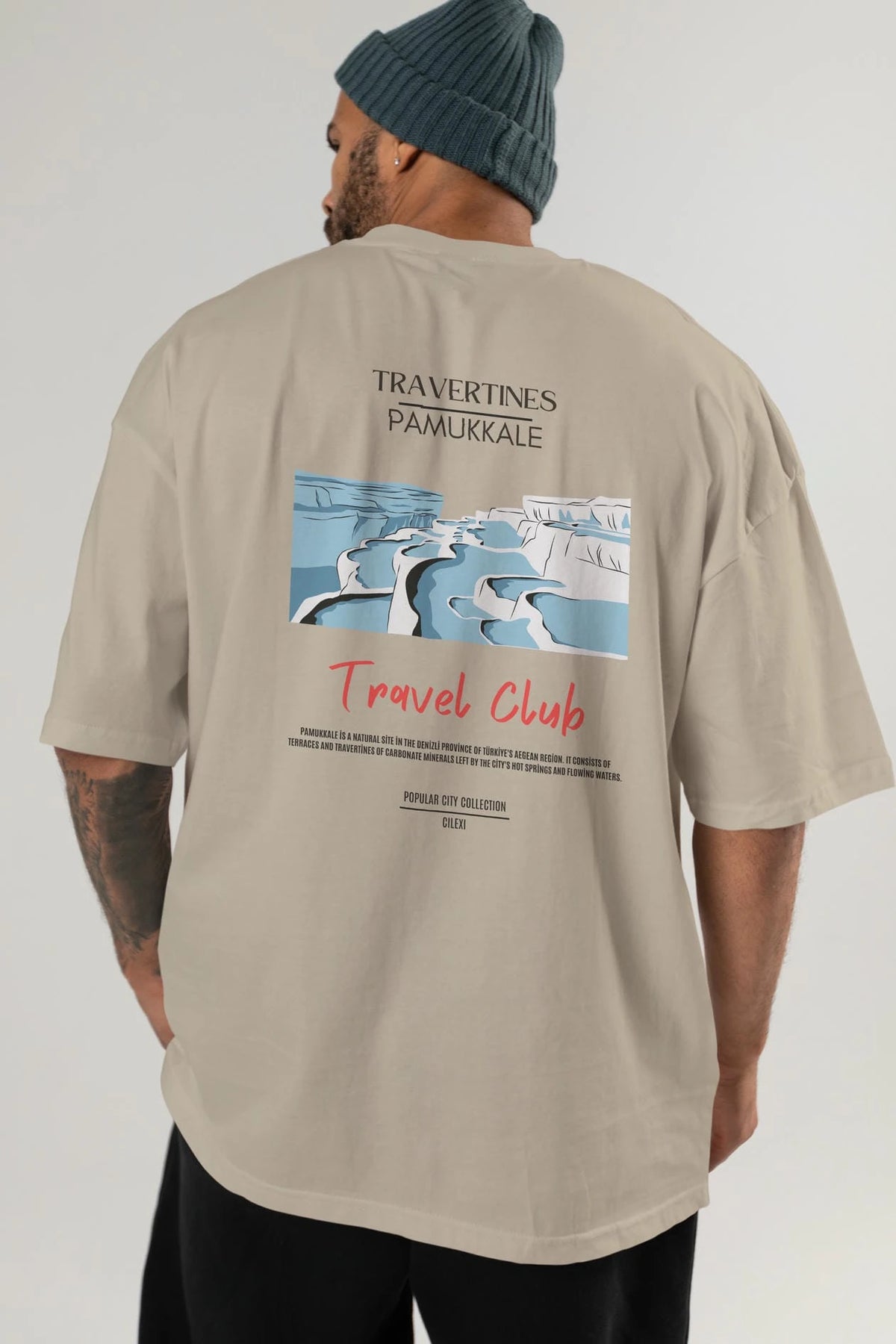 Travertines Pamukkale Arka Baskılı Oversize t-shirt Erkek Kadın Pamuk Bisiklet Yaka tişort