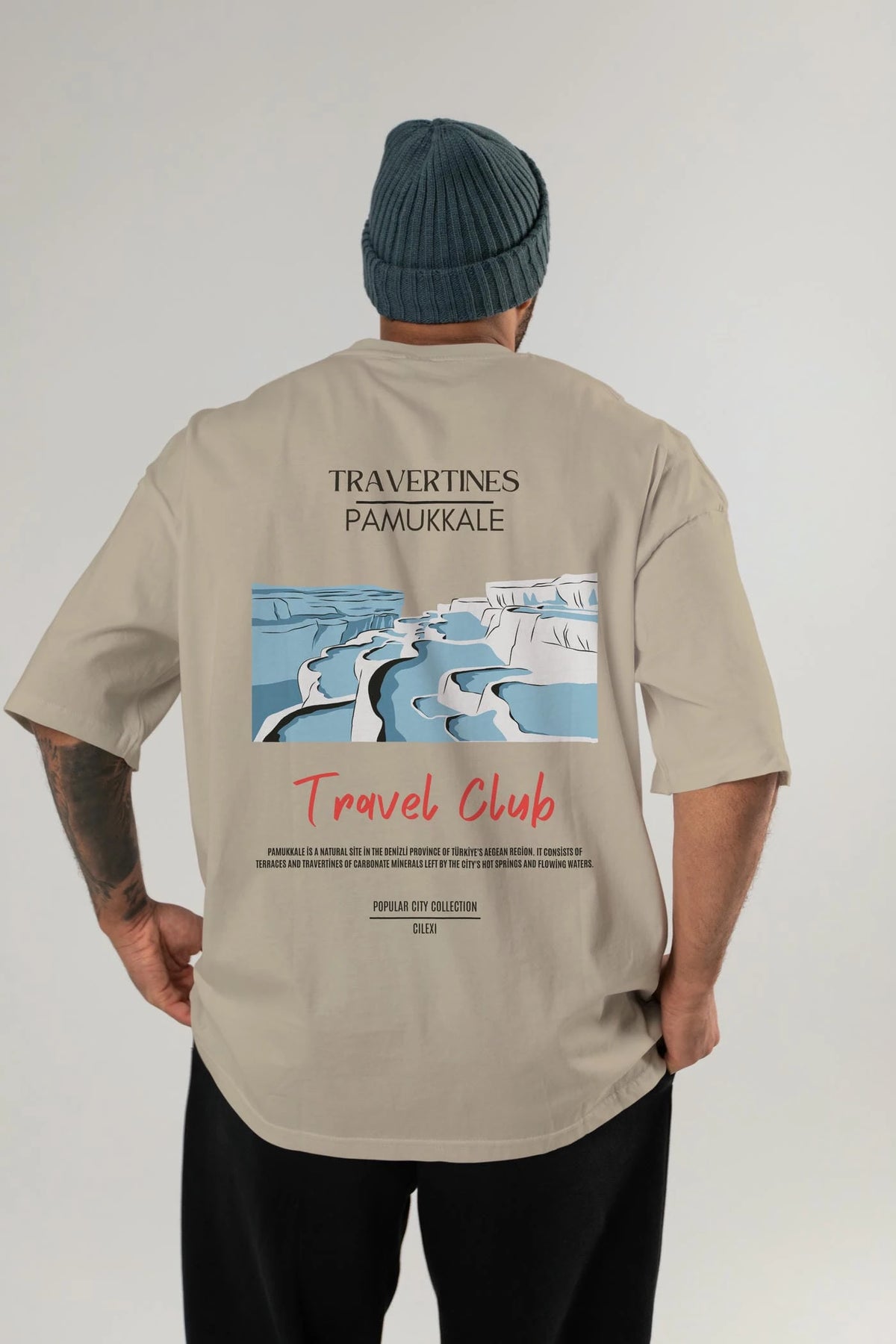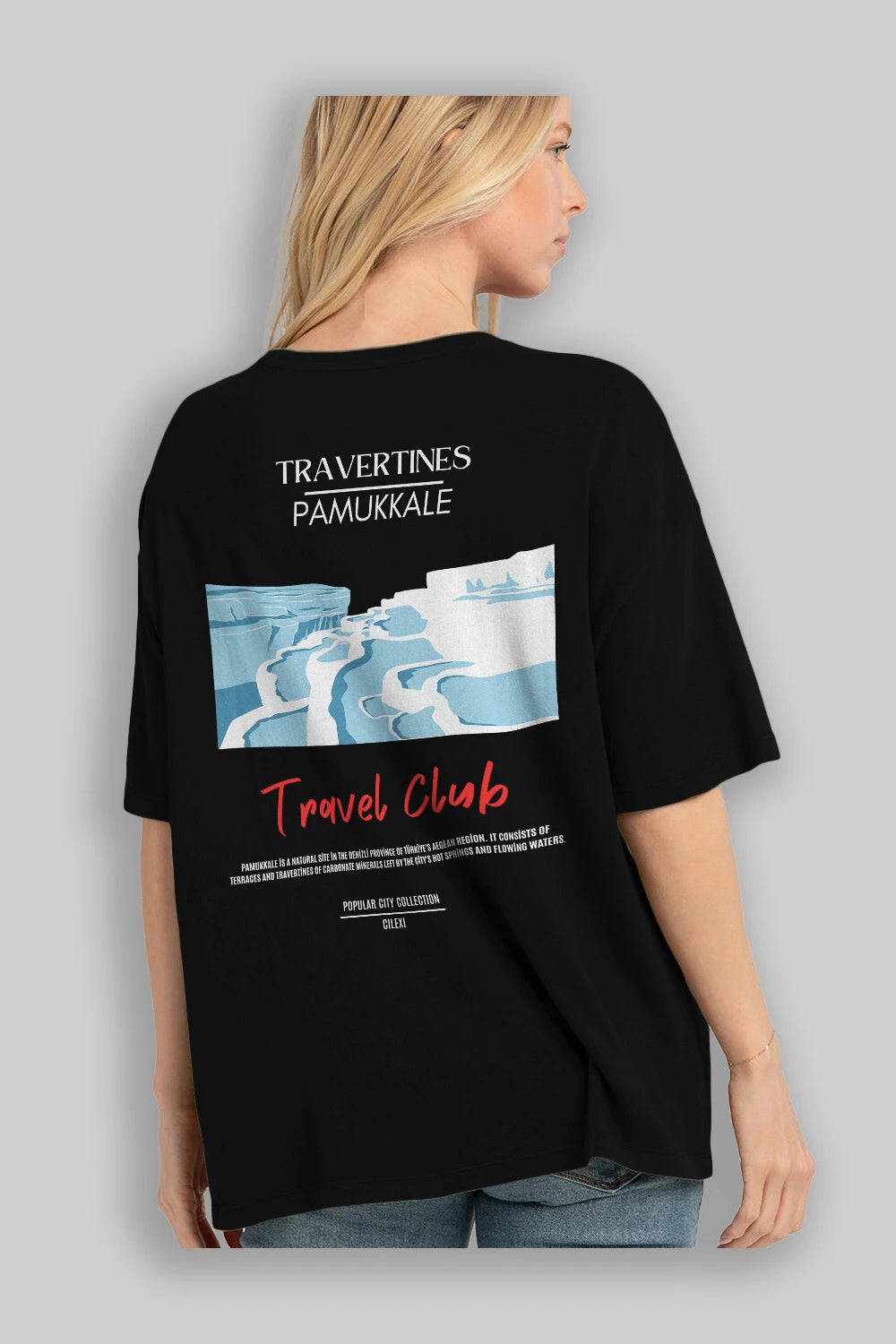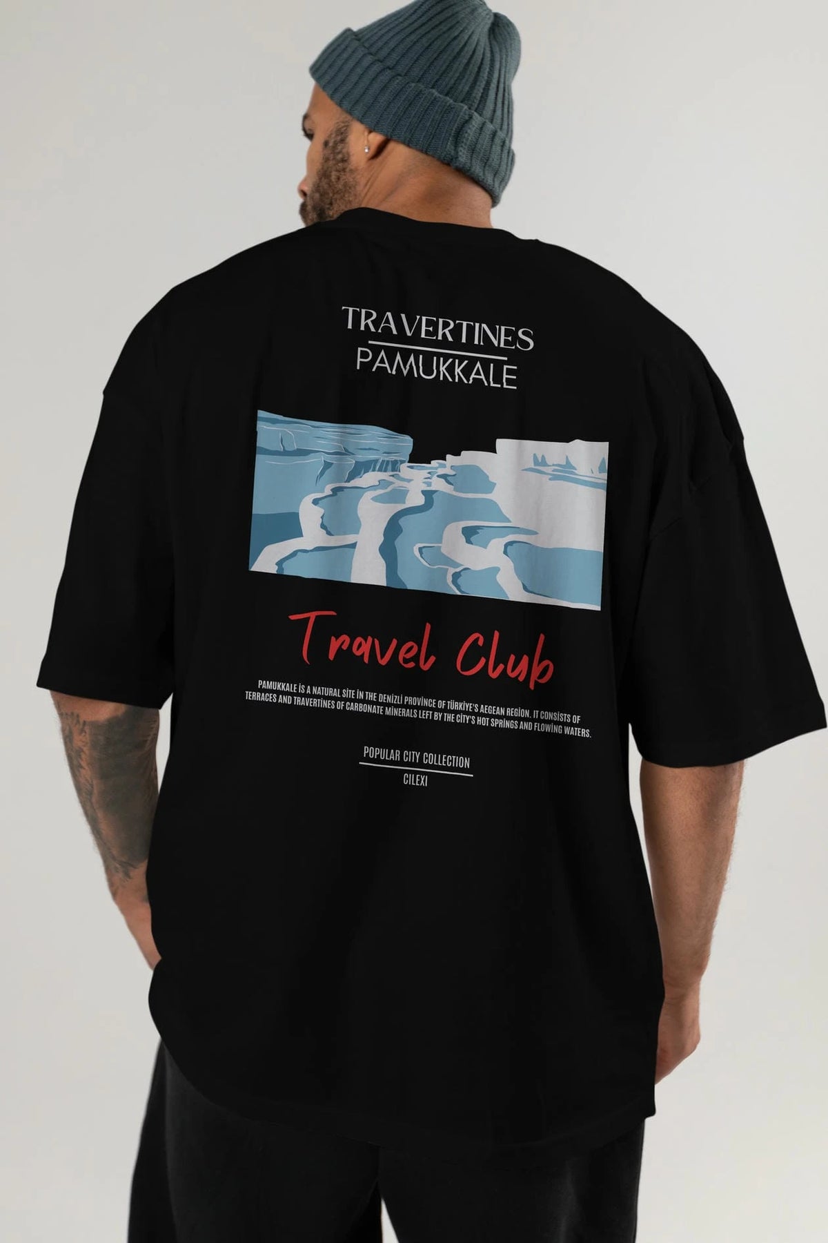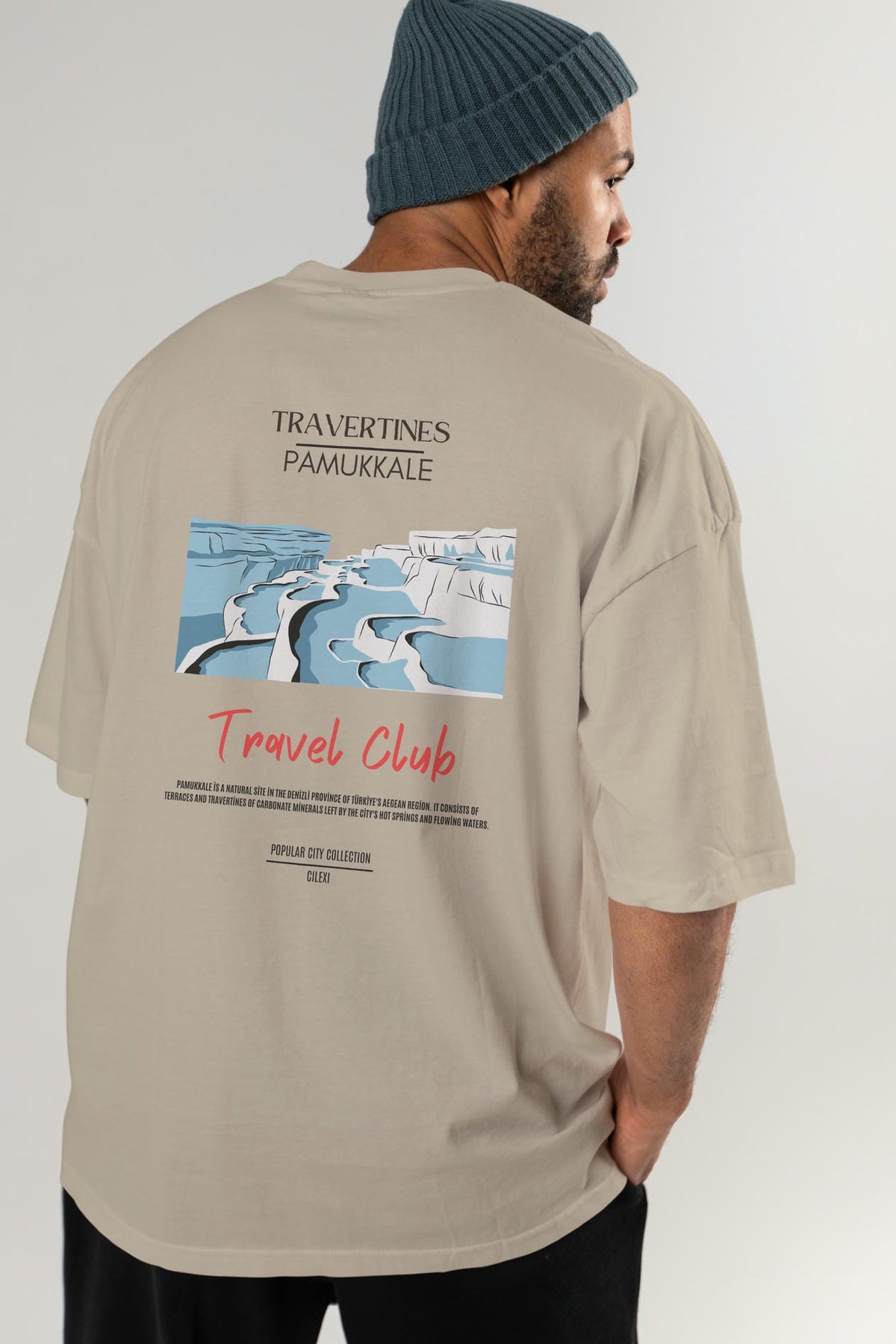 Travertines Pamukkale Arka Baskılı Oversize t-shirt Erkek Kadın Pamuk Bisiklet Yaka tişort