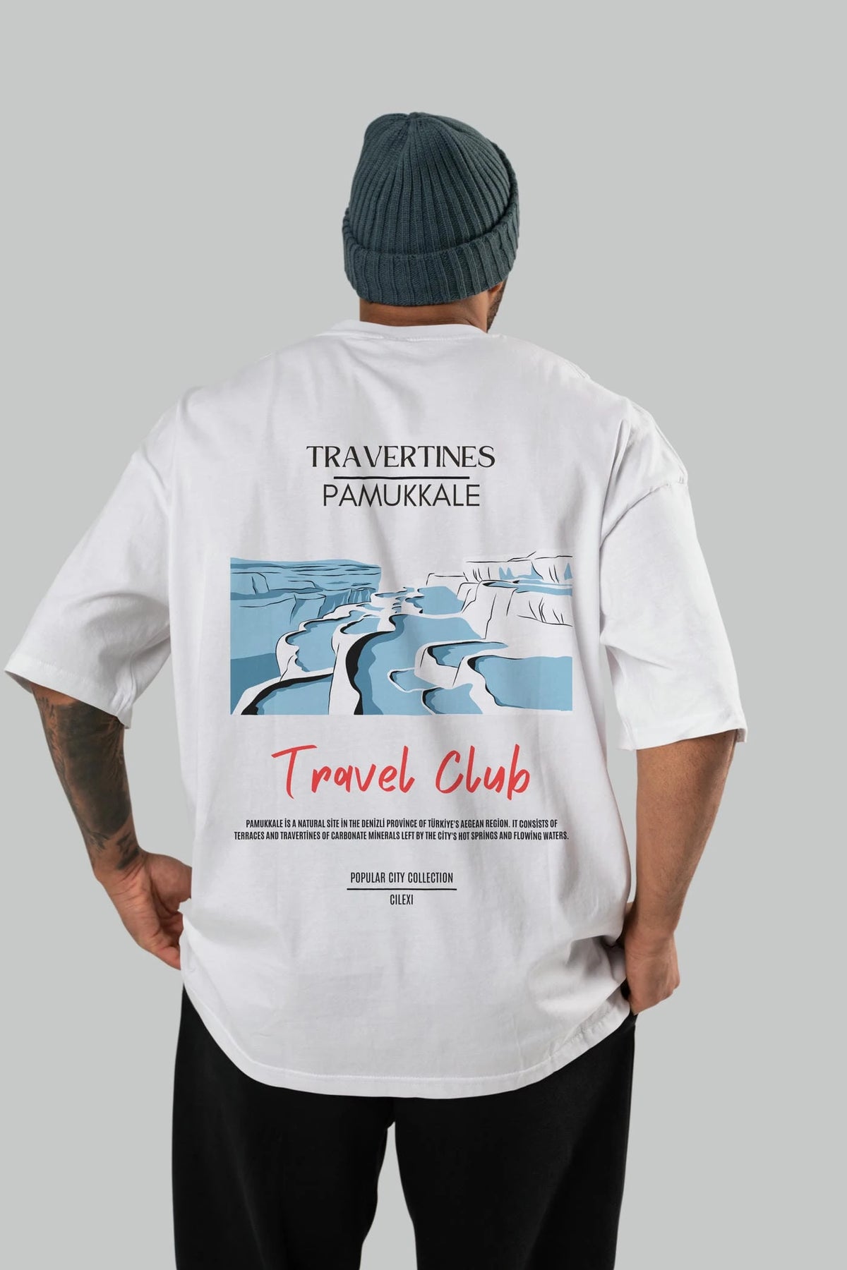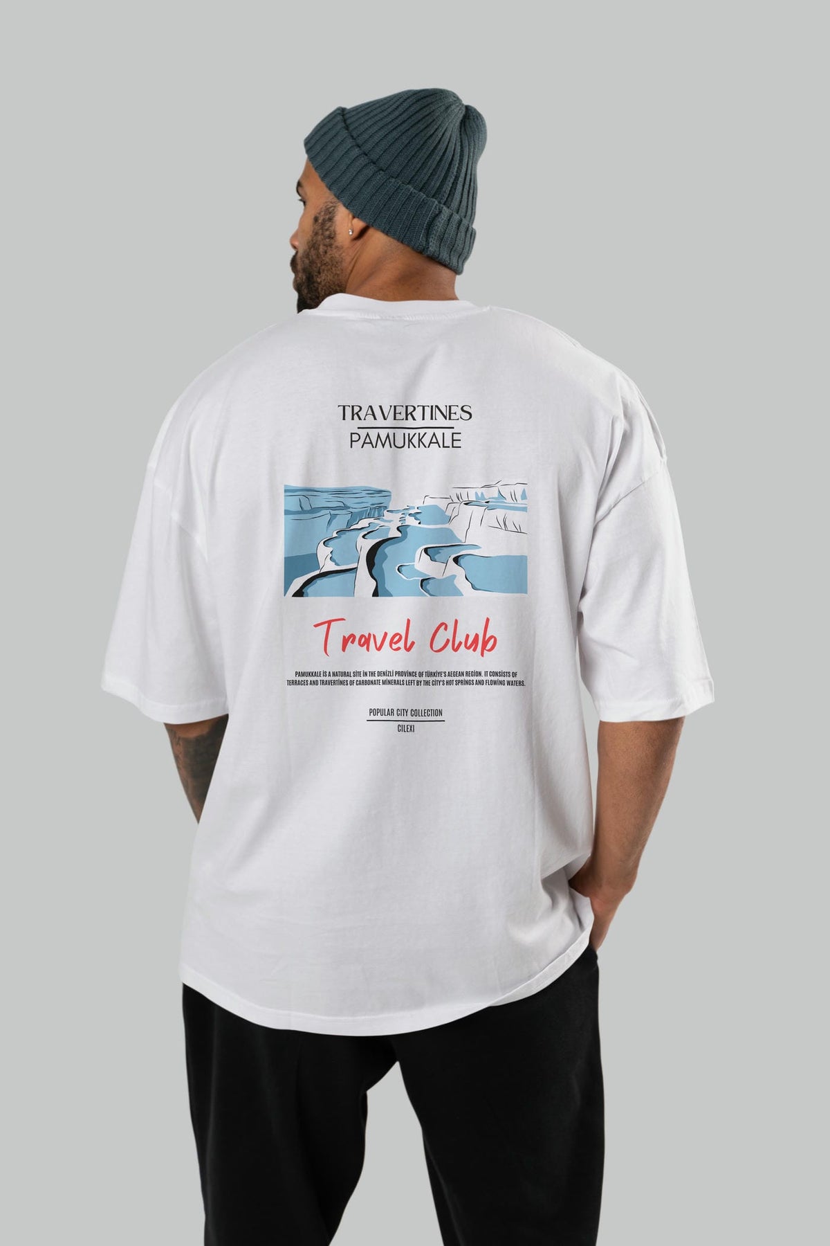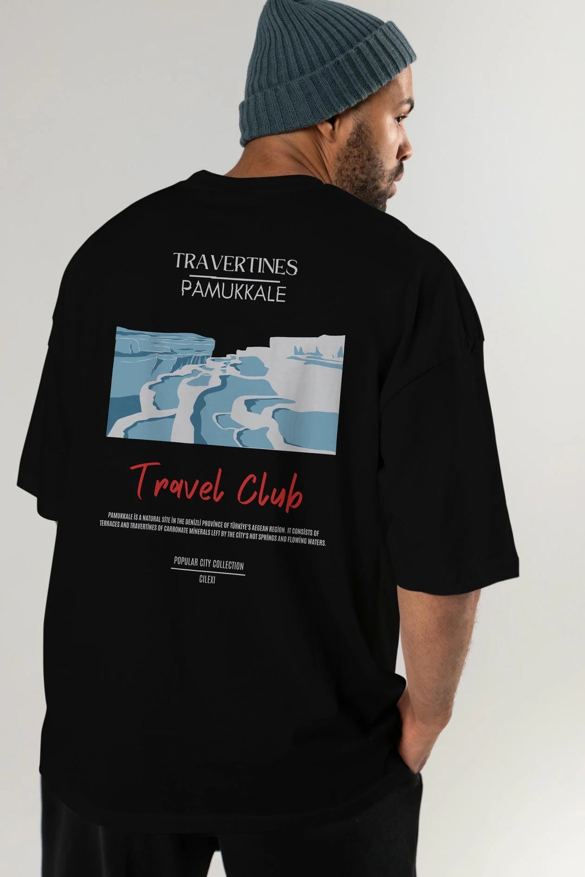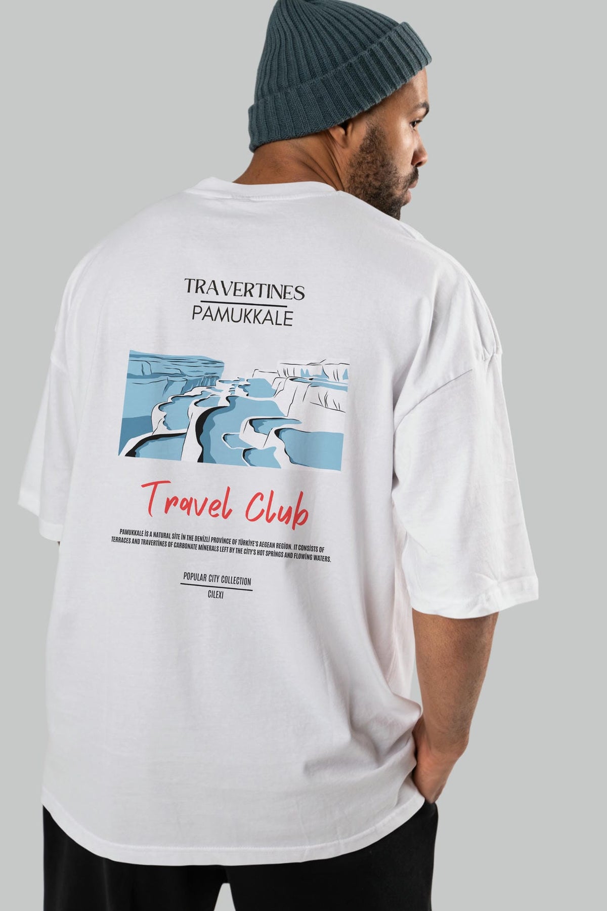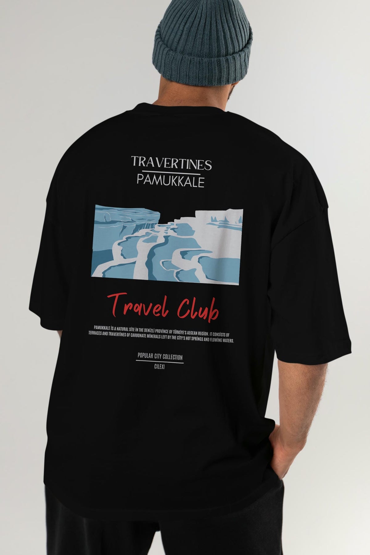 Travertines Pamukkale Arka Baskılı Oversize t-shirt Erkek Kadın Pamuk Bisiklet Yaka tişort