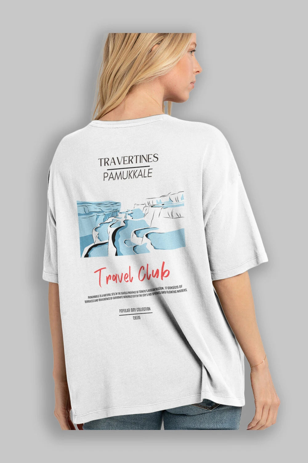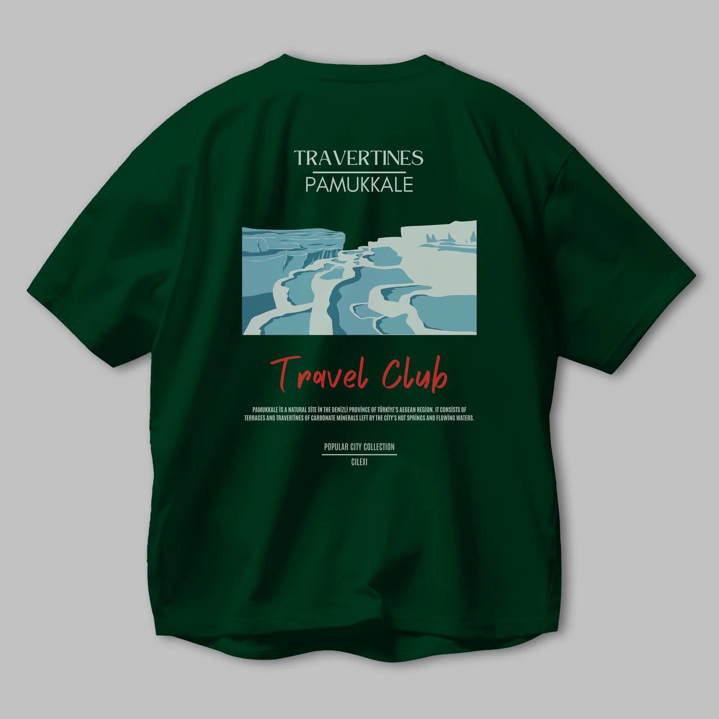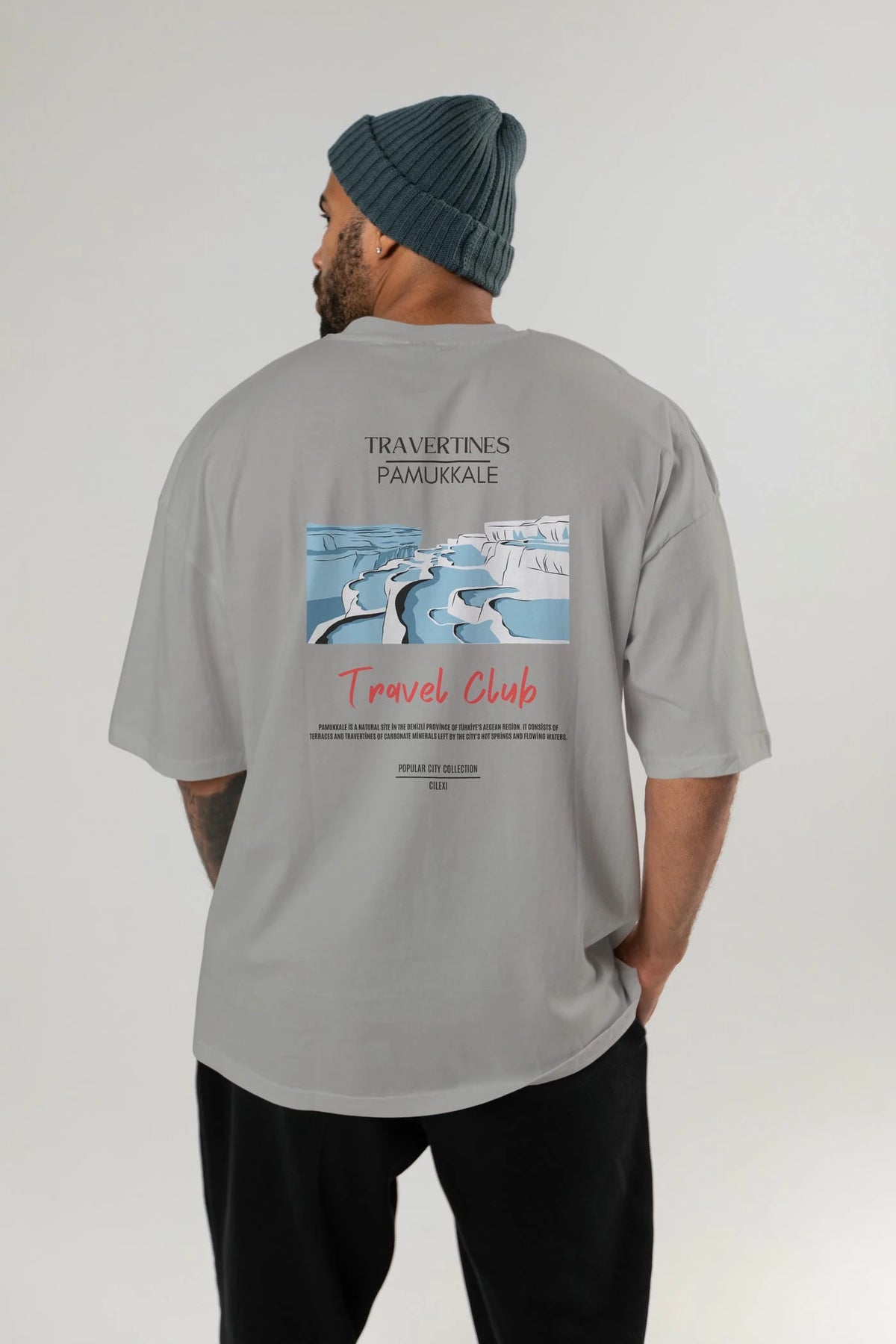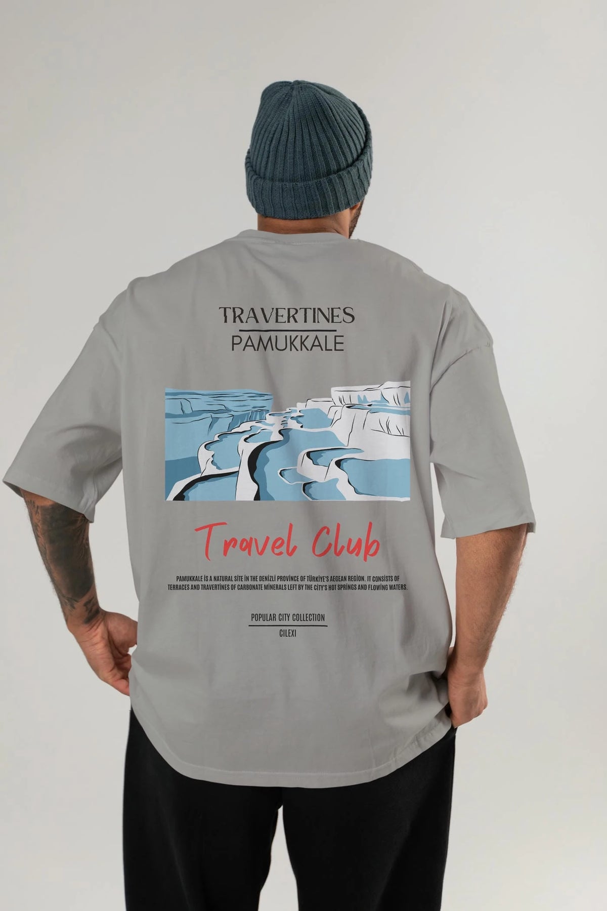 Travertines Pamukkale Arka Baskılı Oversize t-shirt Erkek Kadın Pamuk Bisiklet Yaka tişort