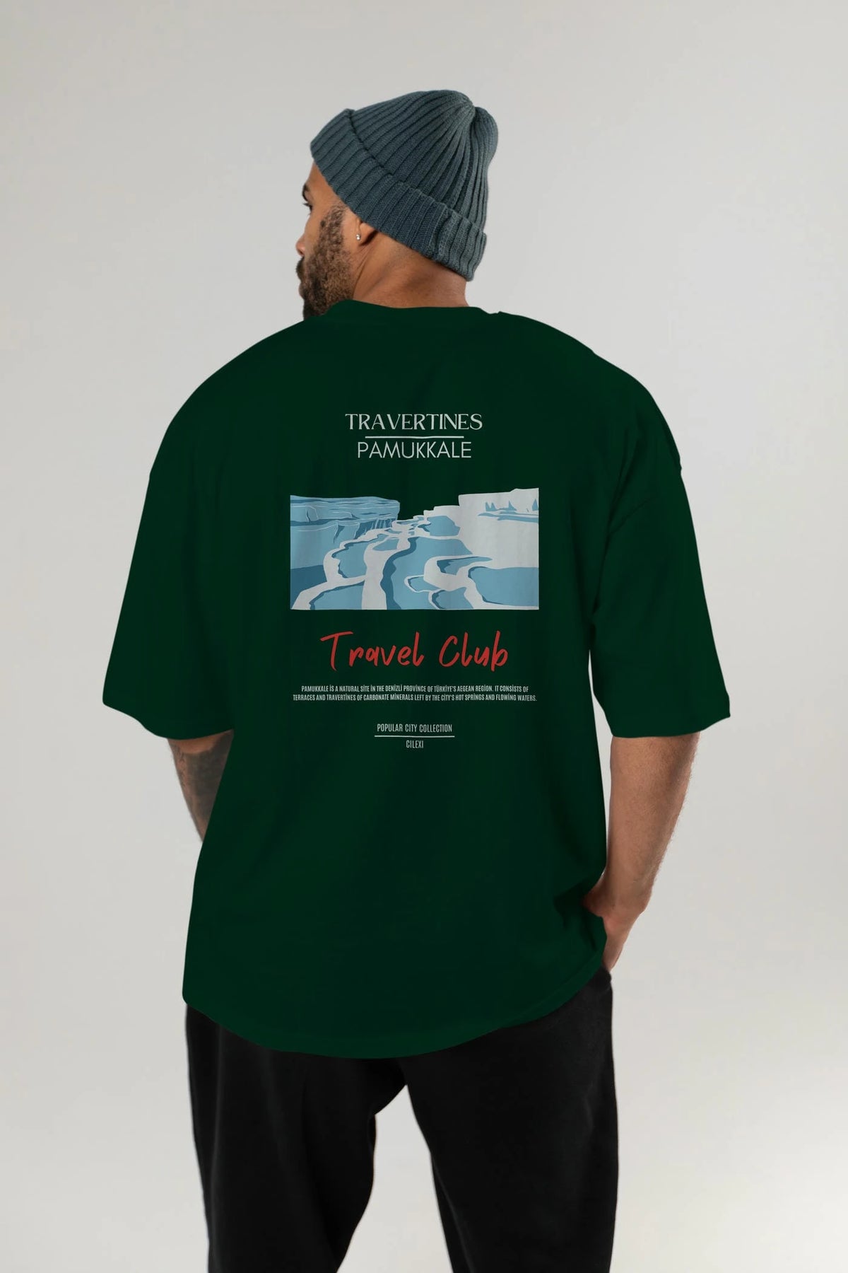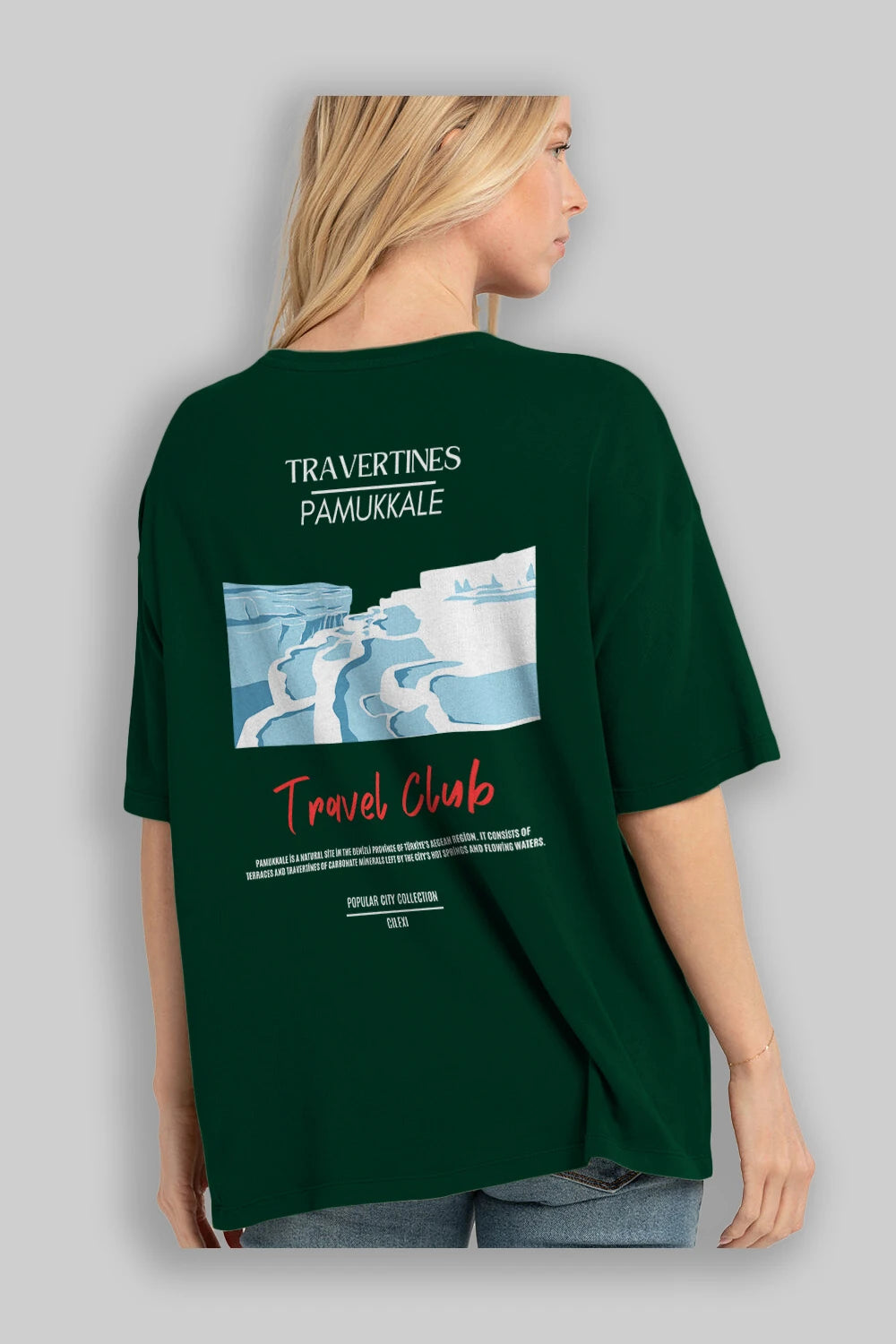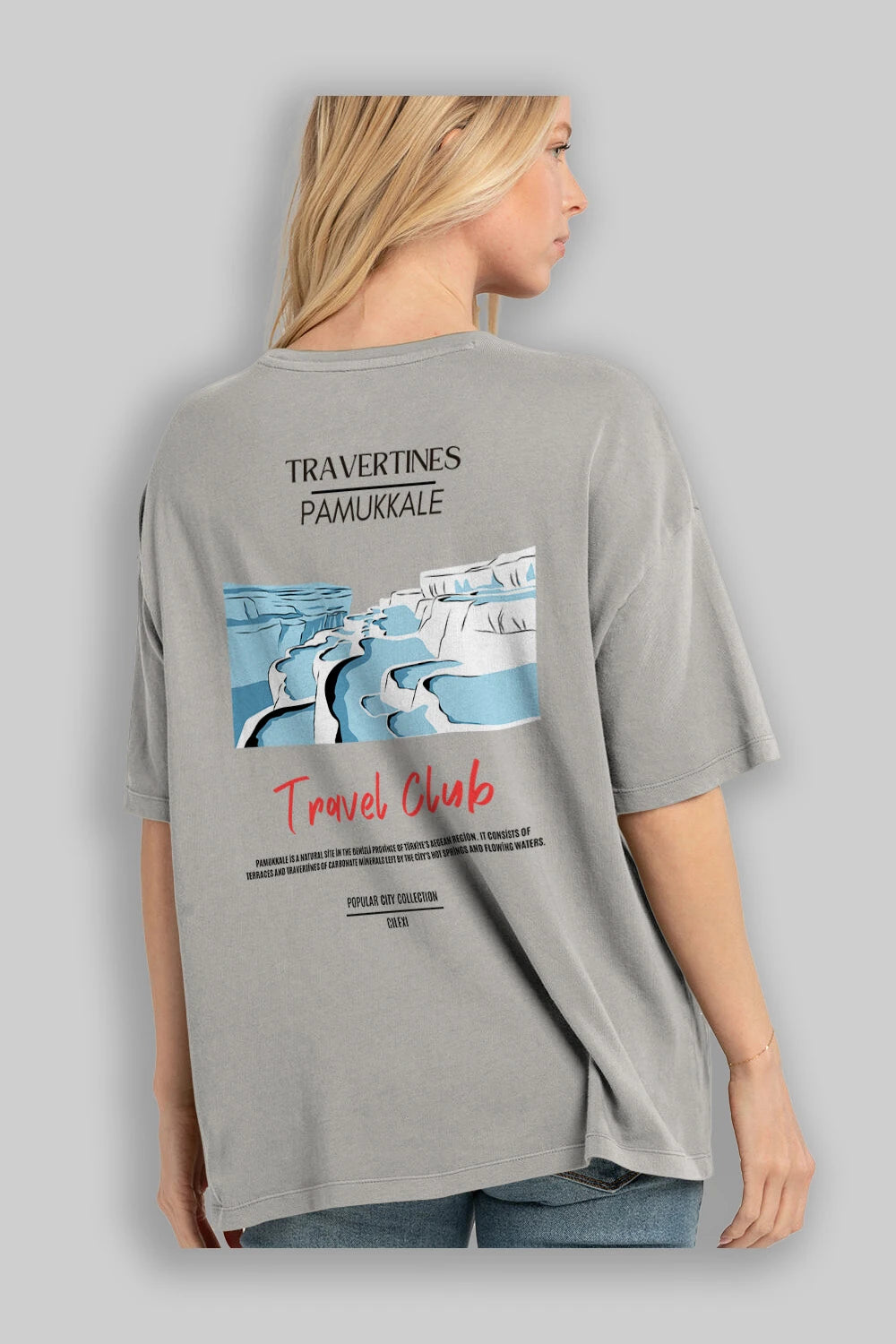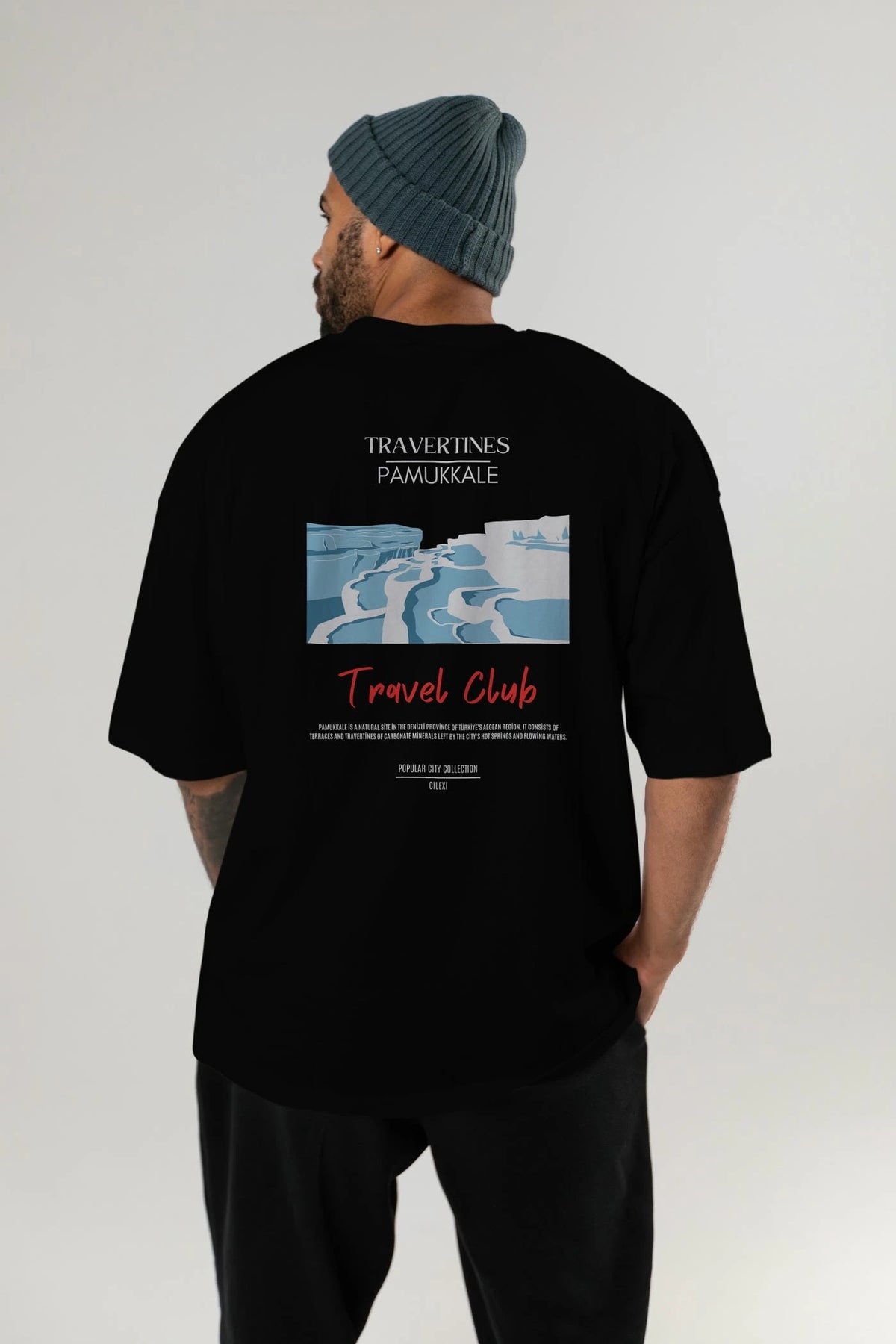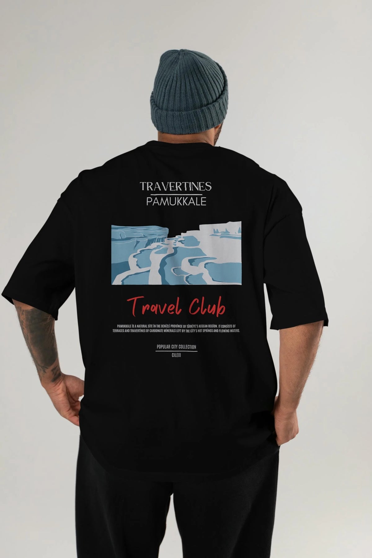 Travertines Pamukkale Arka Baskılı Oversize t-shirt Erkek Kadın Pamuk Bisiklet Yaka tişort