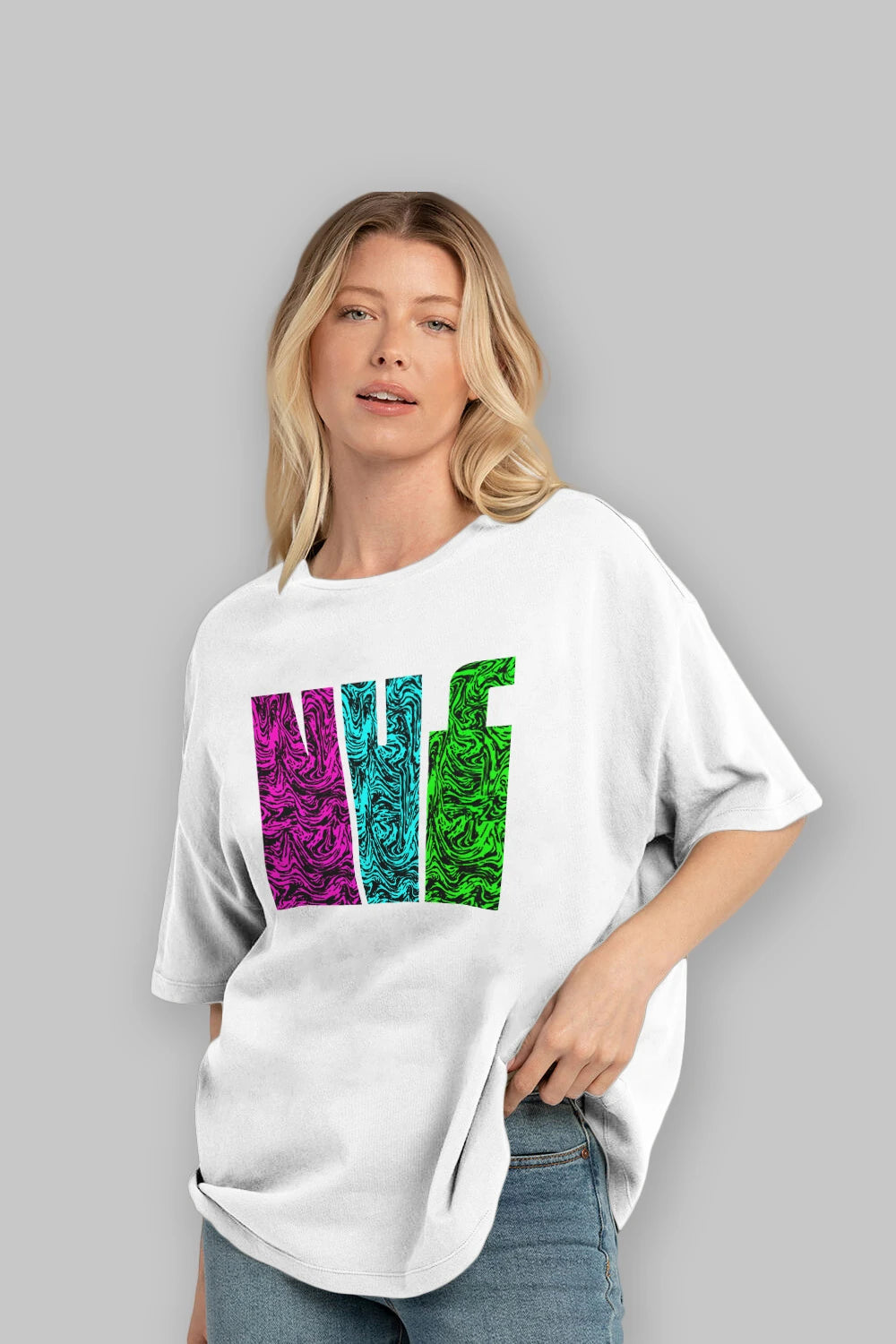 Hem erkekler hem de kadınlar için uygun, taze, modern bir baskıya sahip baskılı oversize t-shirt.