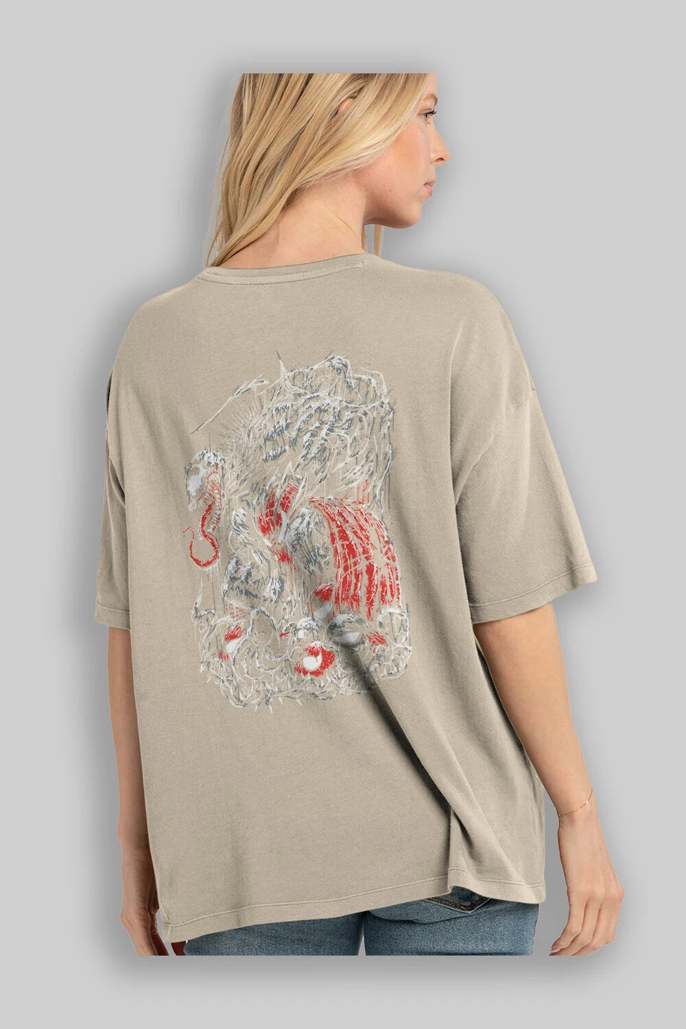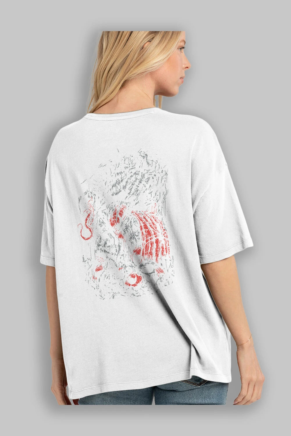 Hem erkekler hem de kadınlar için uygun, taze, modern bir baskıya sahip baskılı oversize t-shirt.