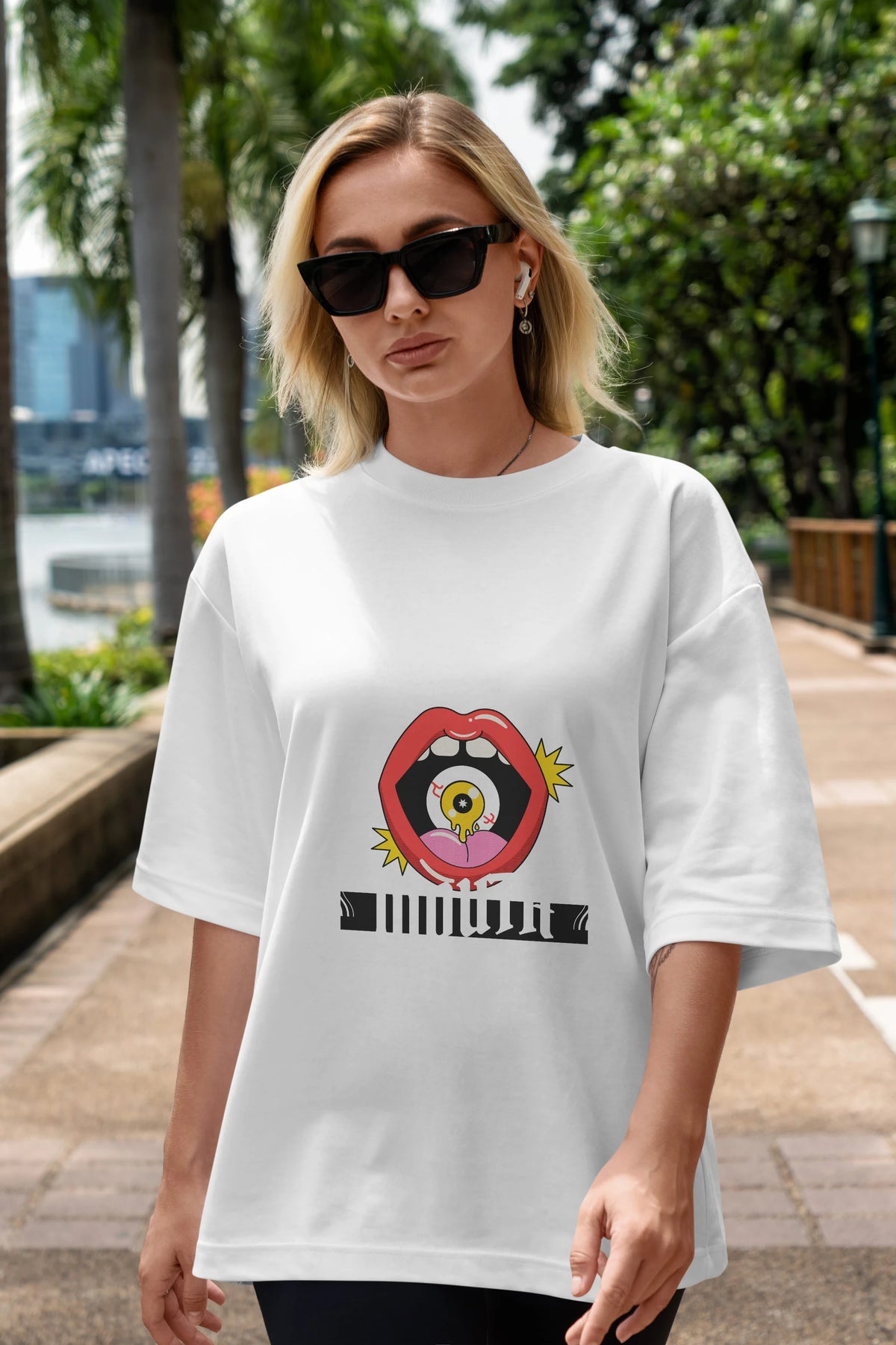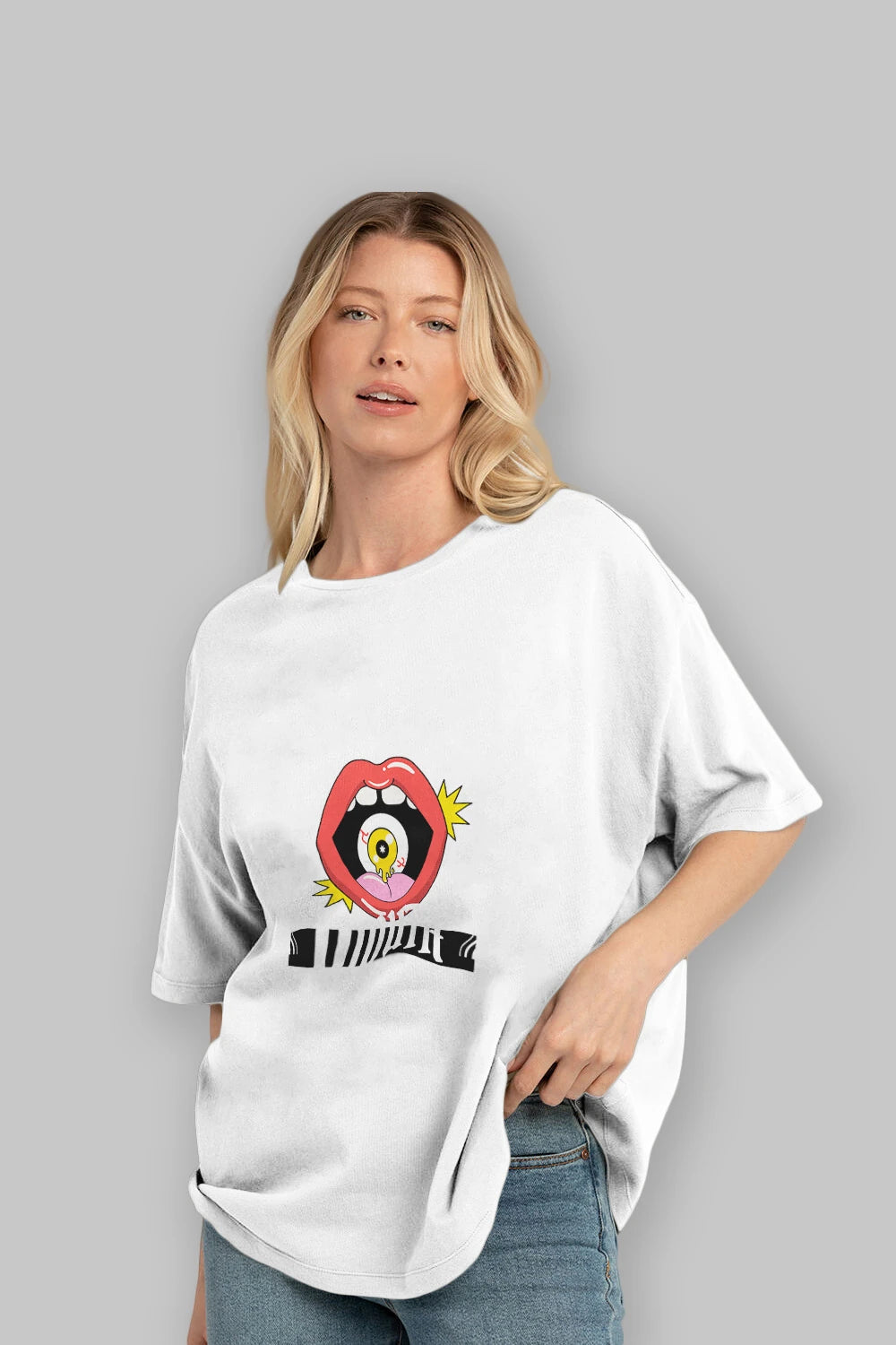 Hem erkekler hem de kadınlar için uygun, taze, modern bir baskıya sahip baskılı oversize t-shirt.