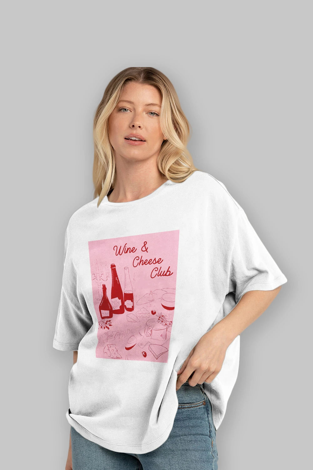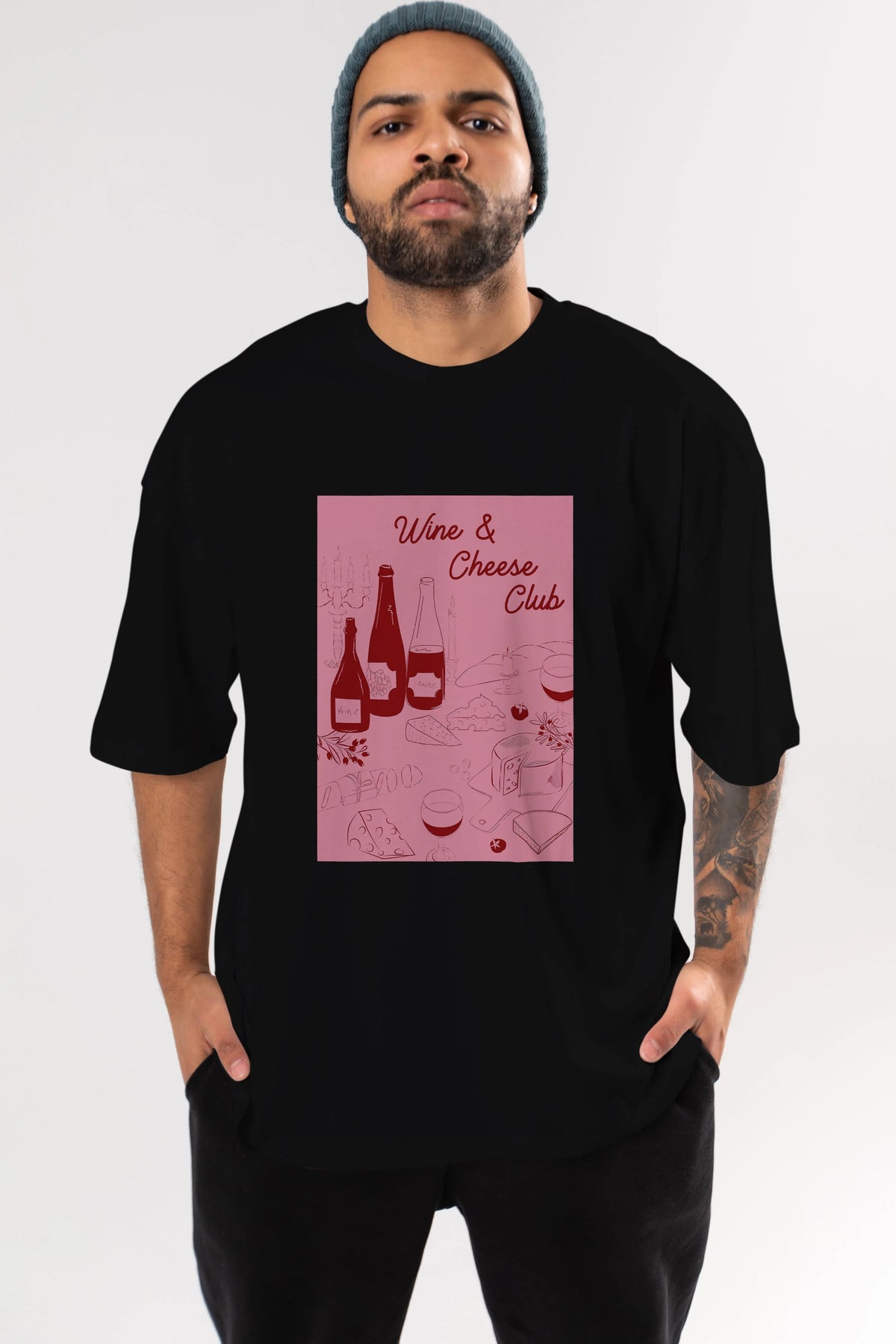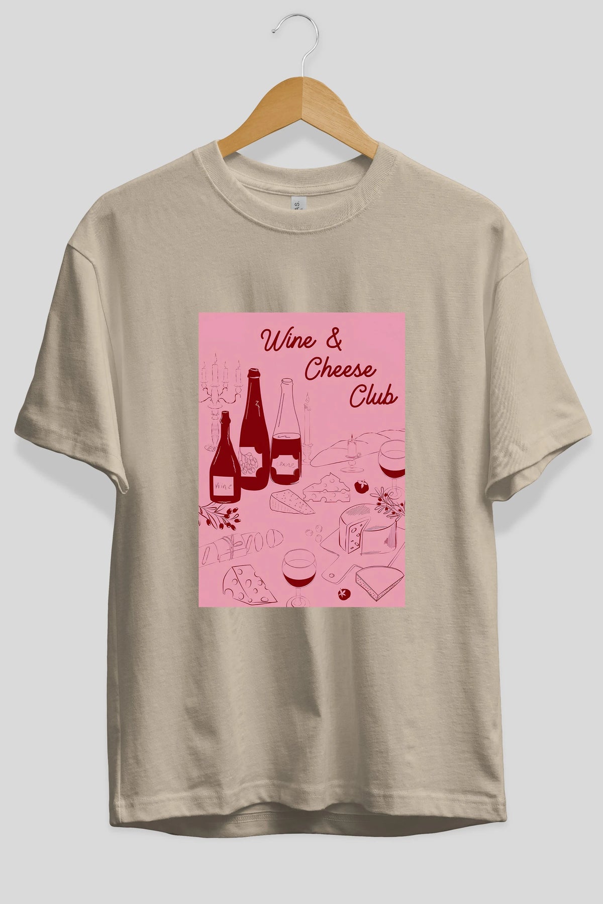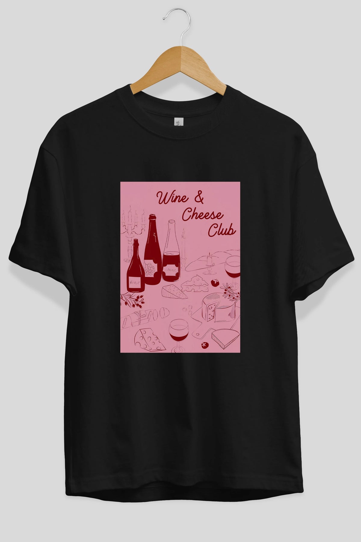 Wine Cheese Club Ön Baskılı Oversize t-shirt Erkek Kadın Unisex %100 Pamuk Bisiklet Yaka tişort