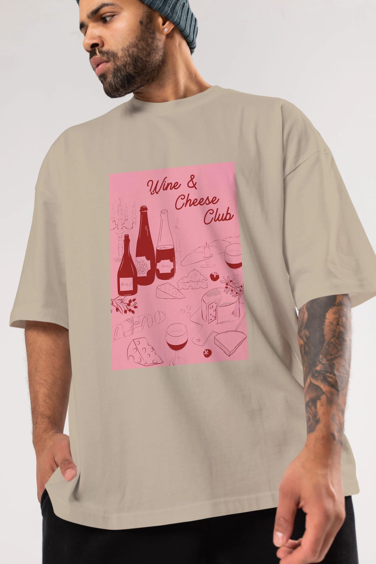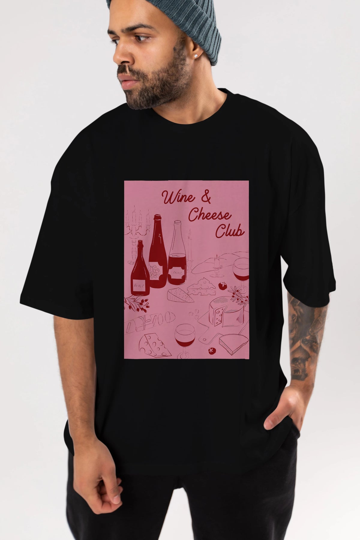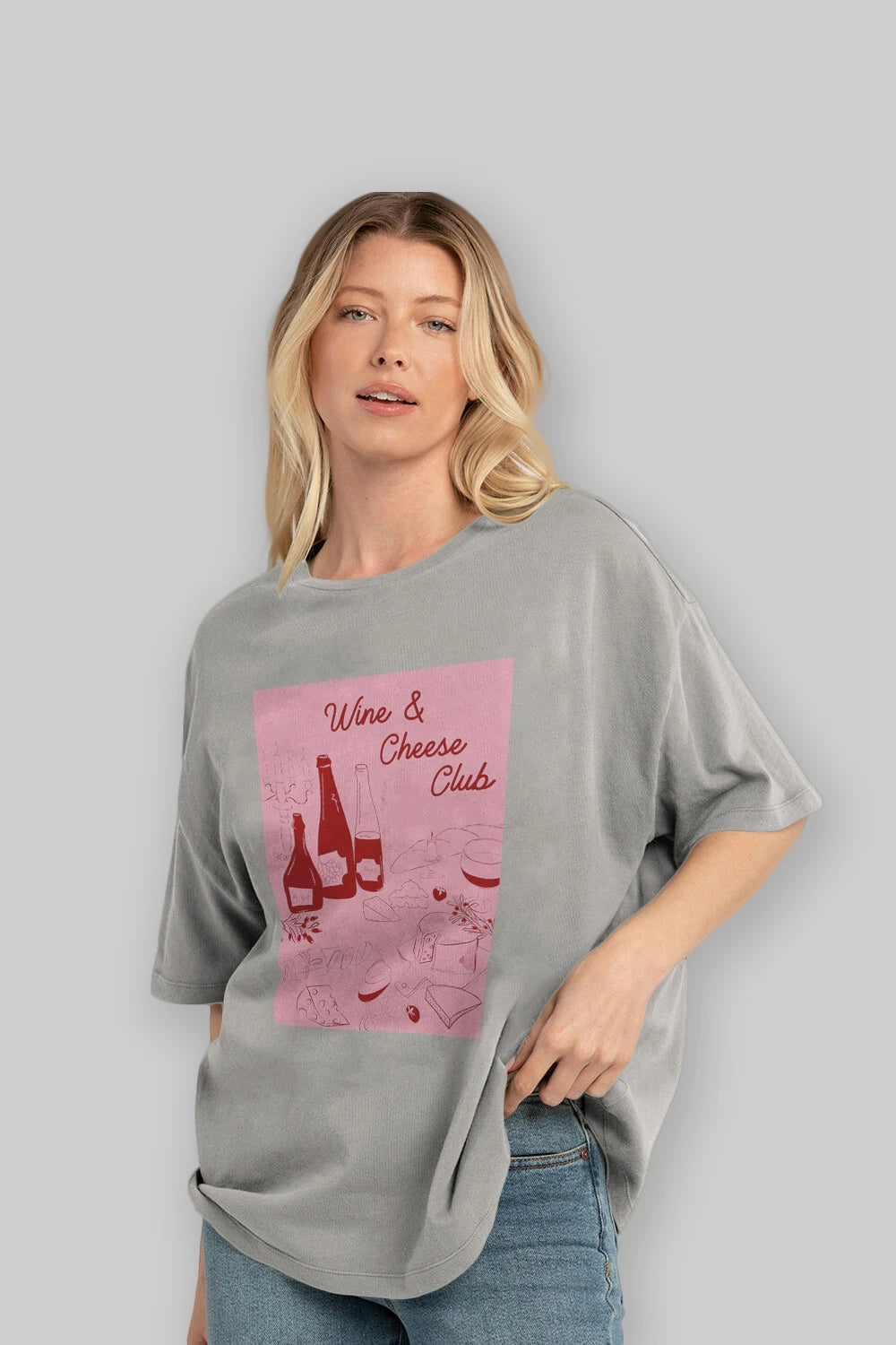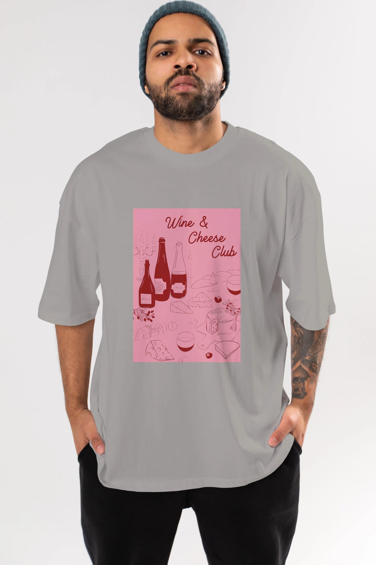 Wine Cheese Club Ön Baskılı Oversize t-shirt Erkek Kadın Unisex %100 Pamuk Bisiklet Yaka tişort