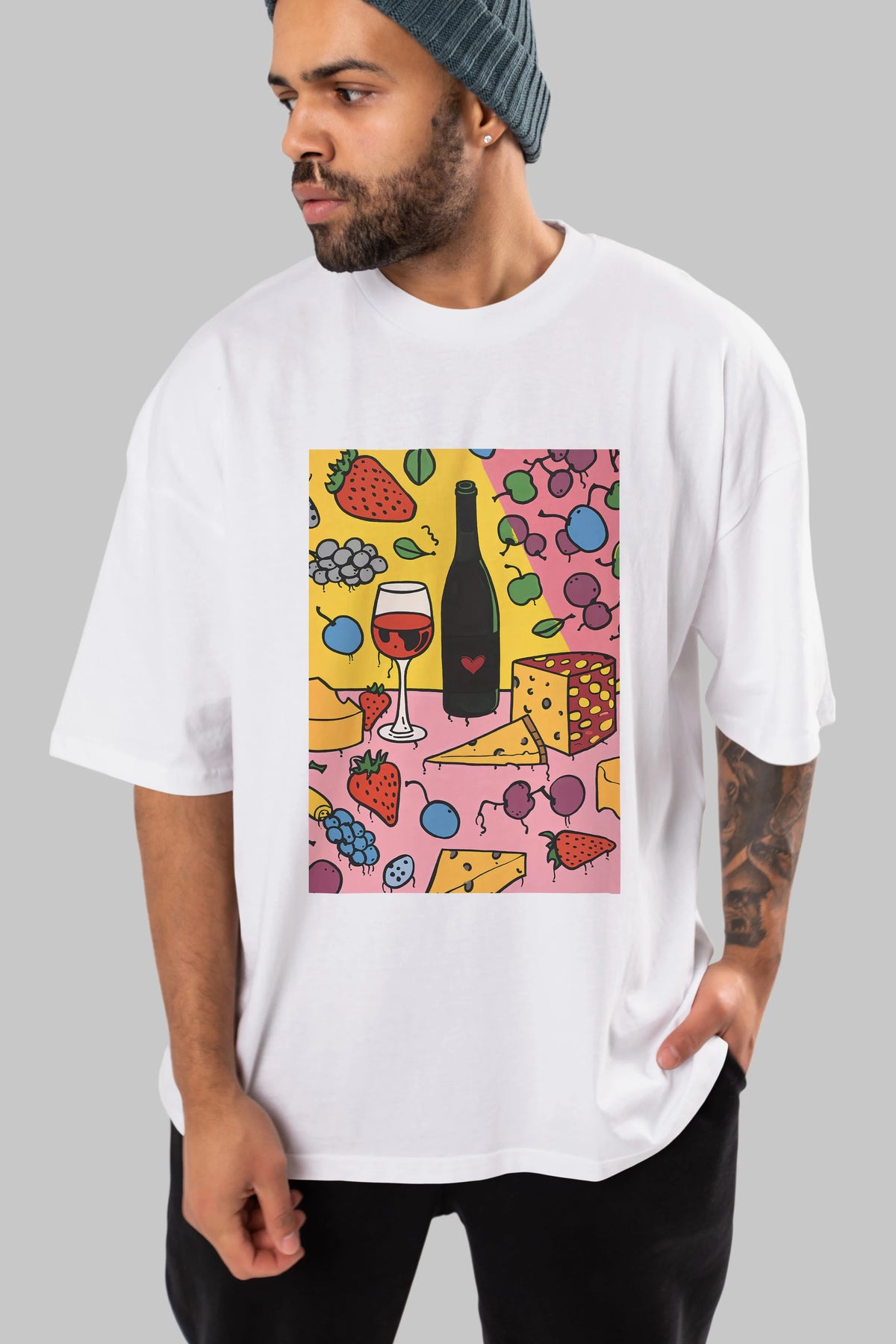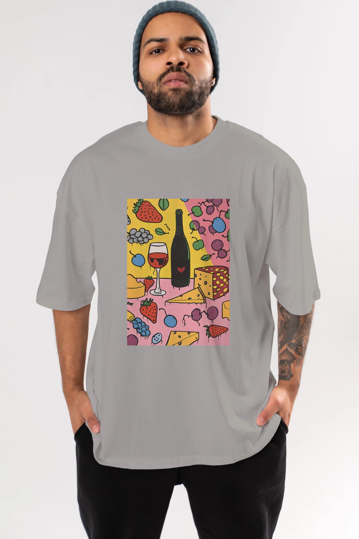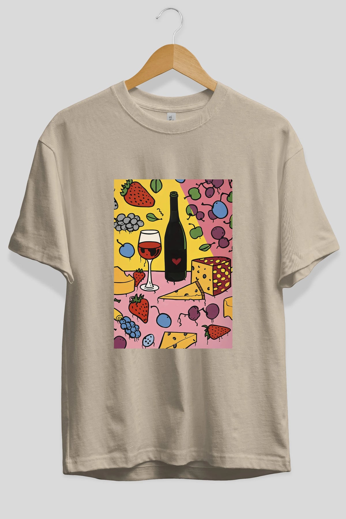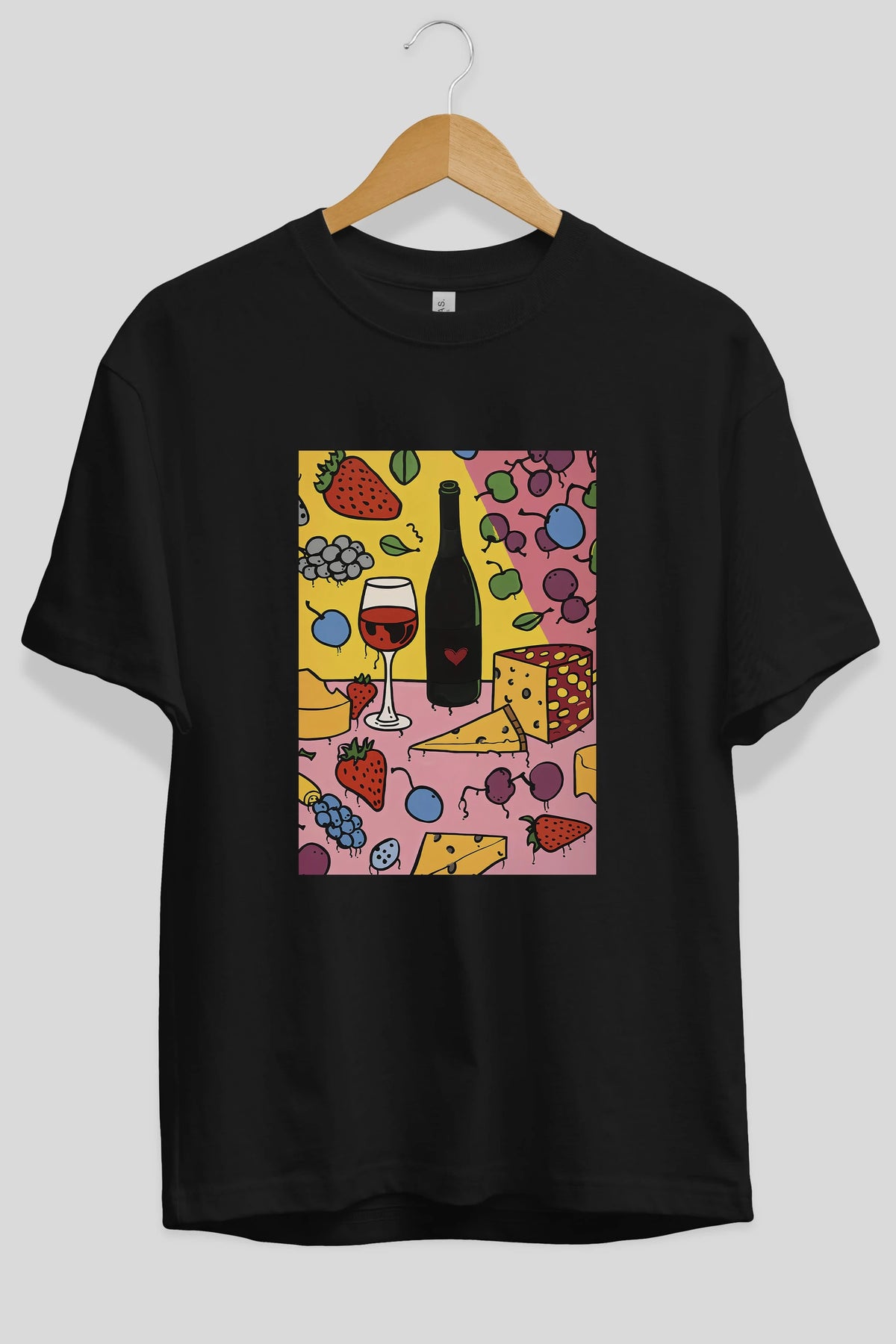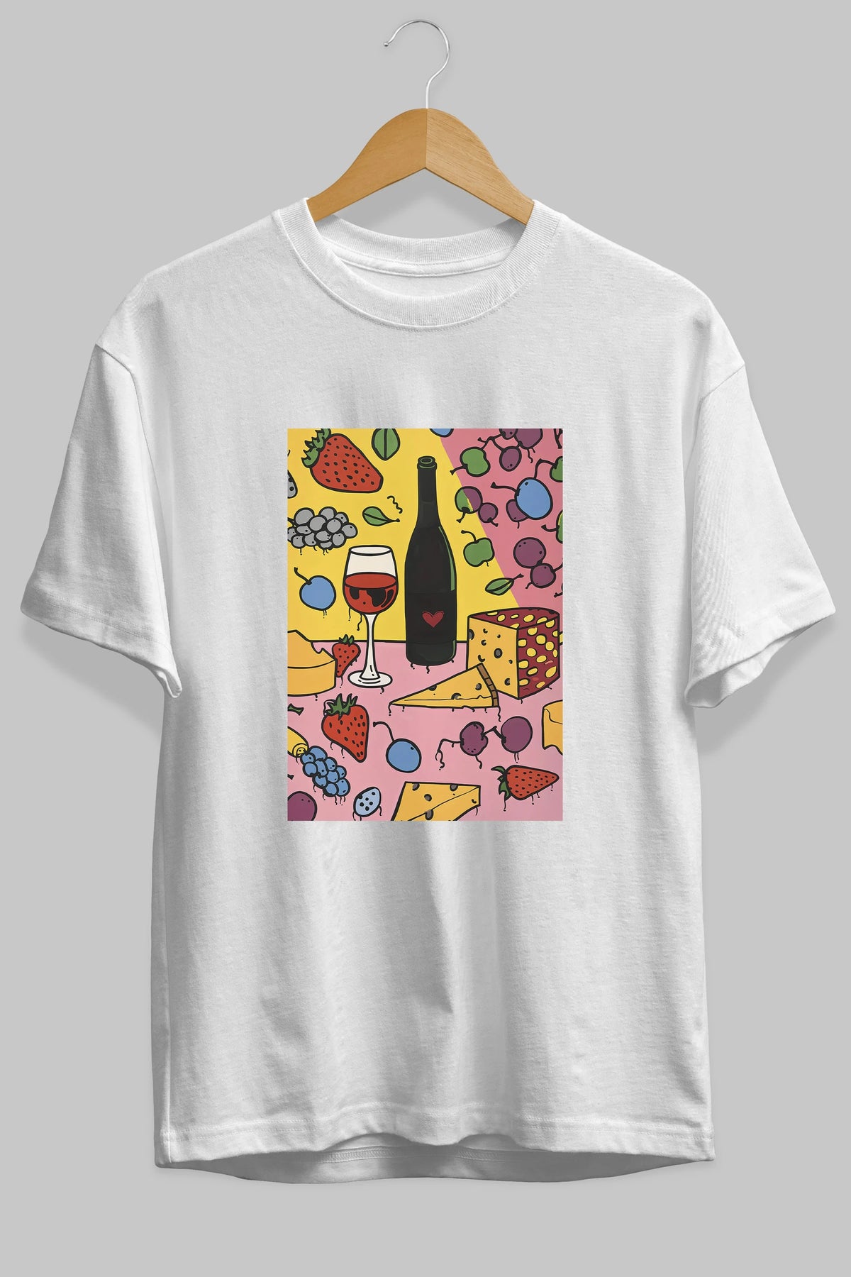 Wine Cheese Fruits Ön Baskılı Oversize t-shirt Erkek Kadın Unisex %100 Pamuk Bisiklet Yaka tişort