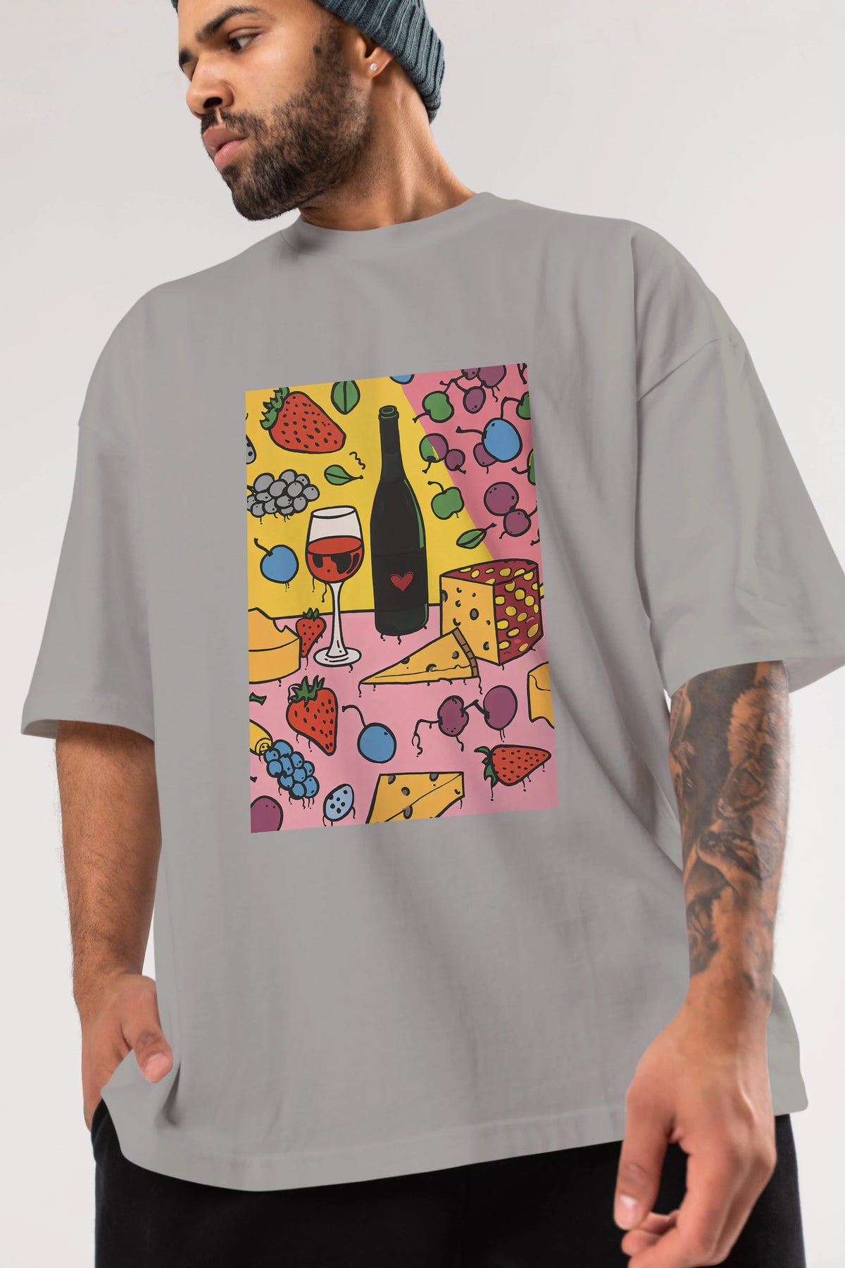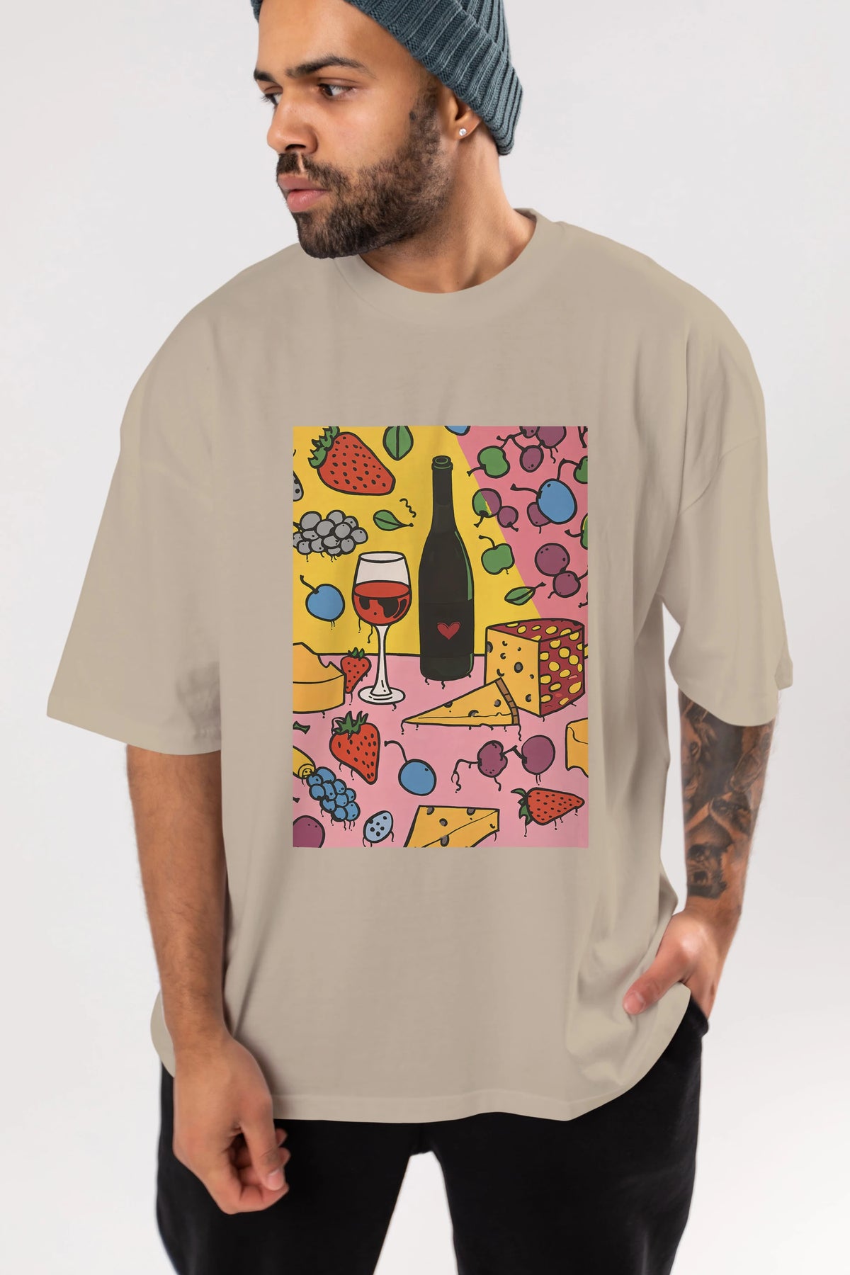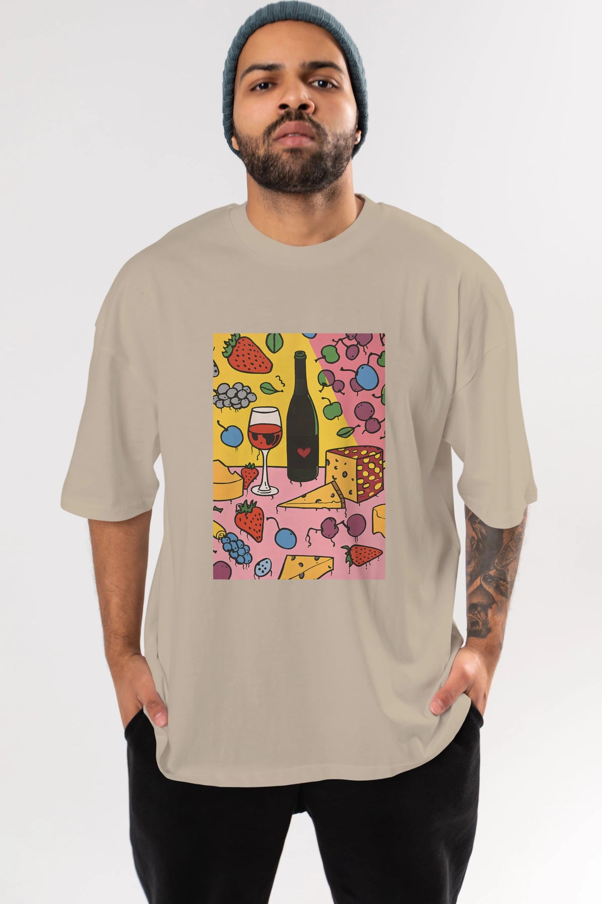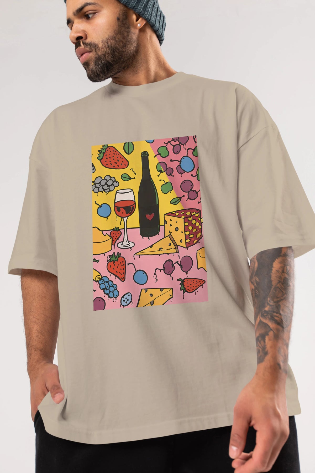 Wine Cheese Fruits Ön Baskılı Oversize t-shirt Erkek Kadın Unisex %100 Pamuk Bisiklet Yaka tişort