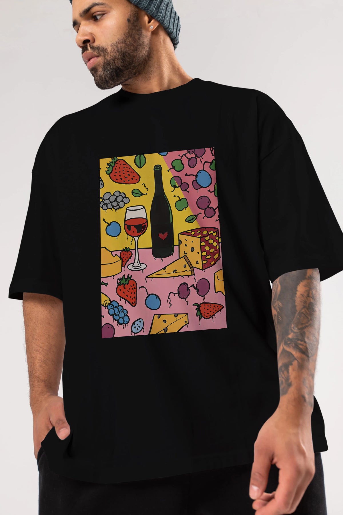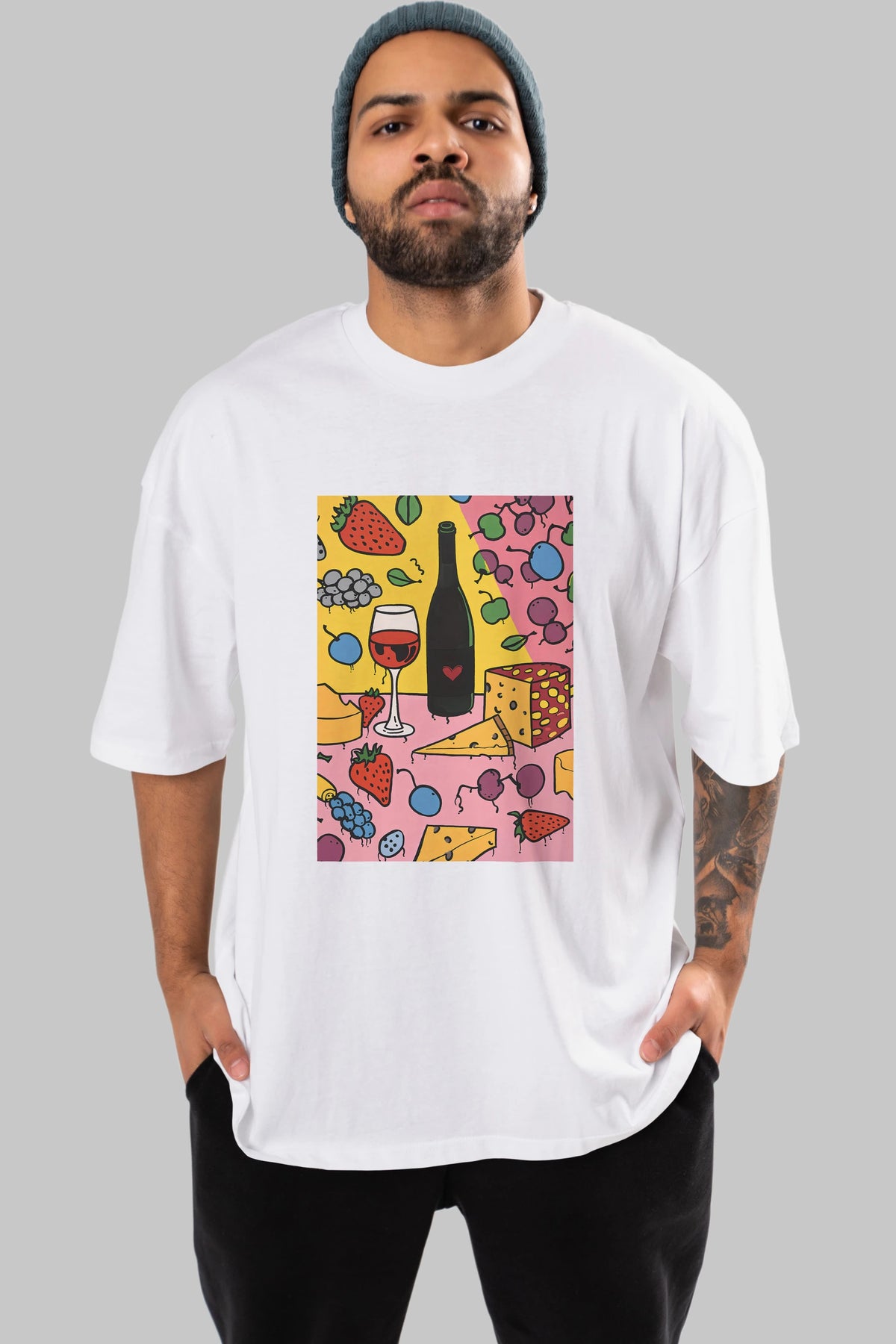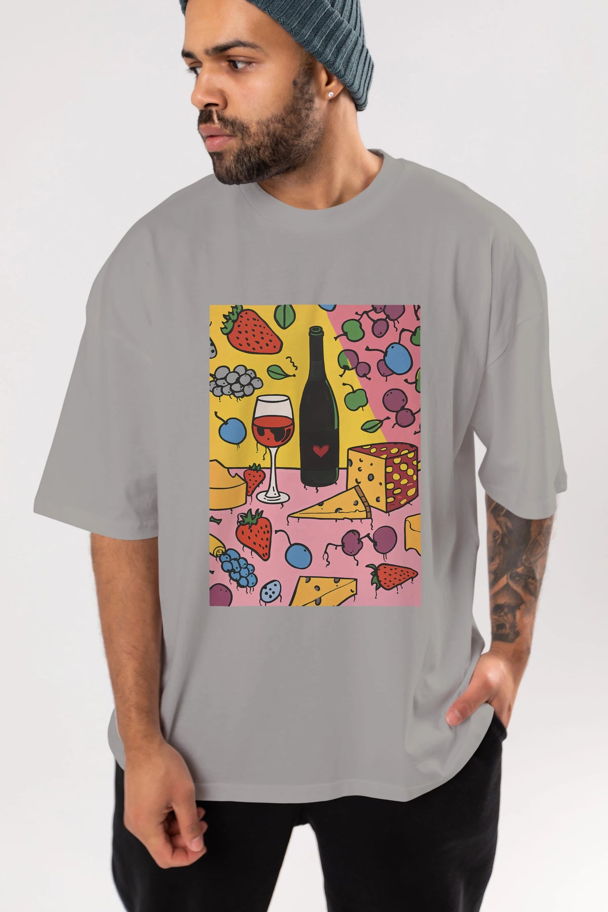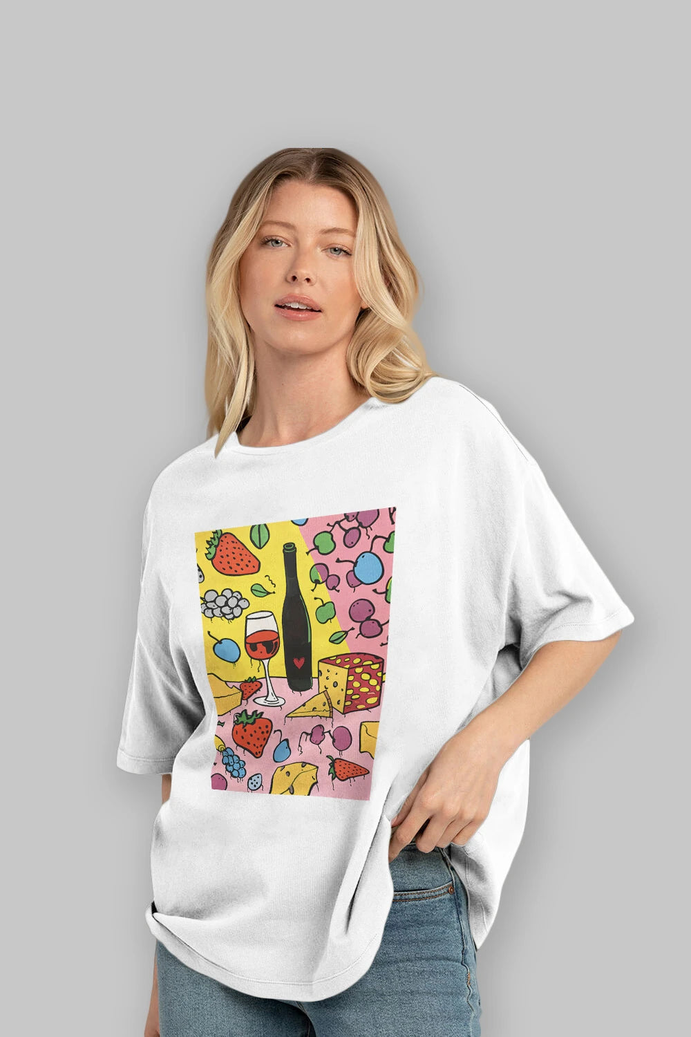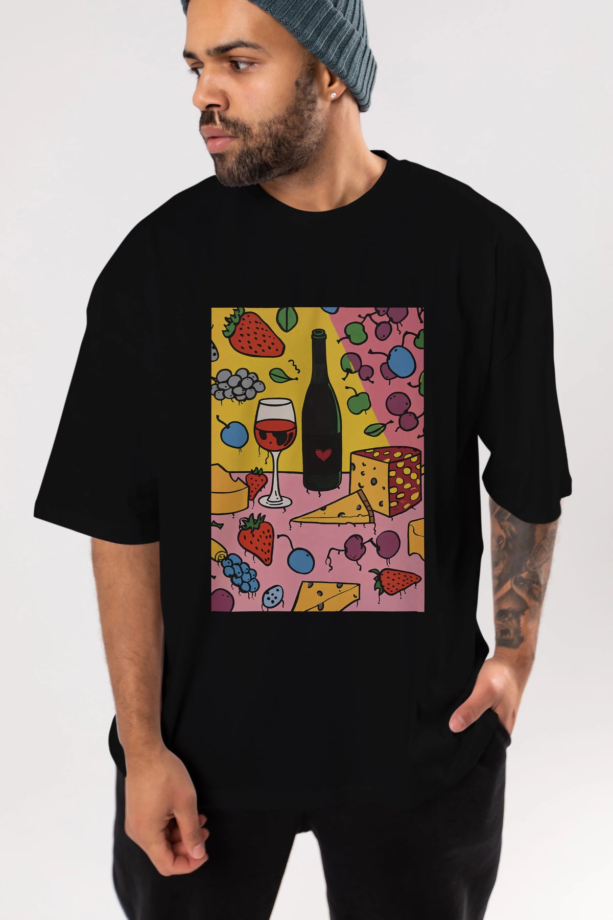 Wine Cheese Fruits Ön Baskılı Oversize t-shirt Erkek Kadın Unisex %100 Pamuk Bisiklet Yaka tişort